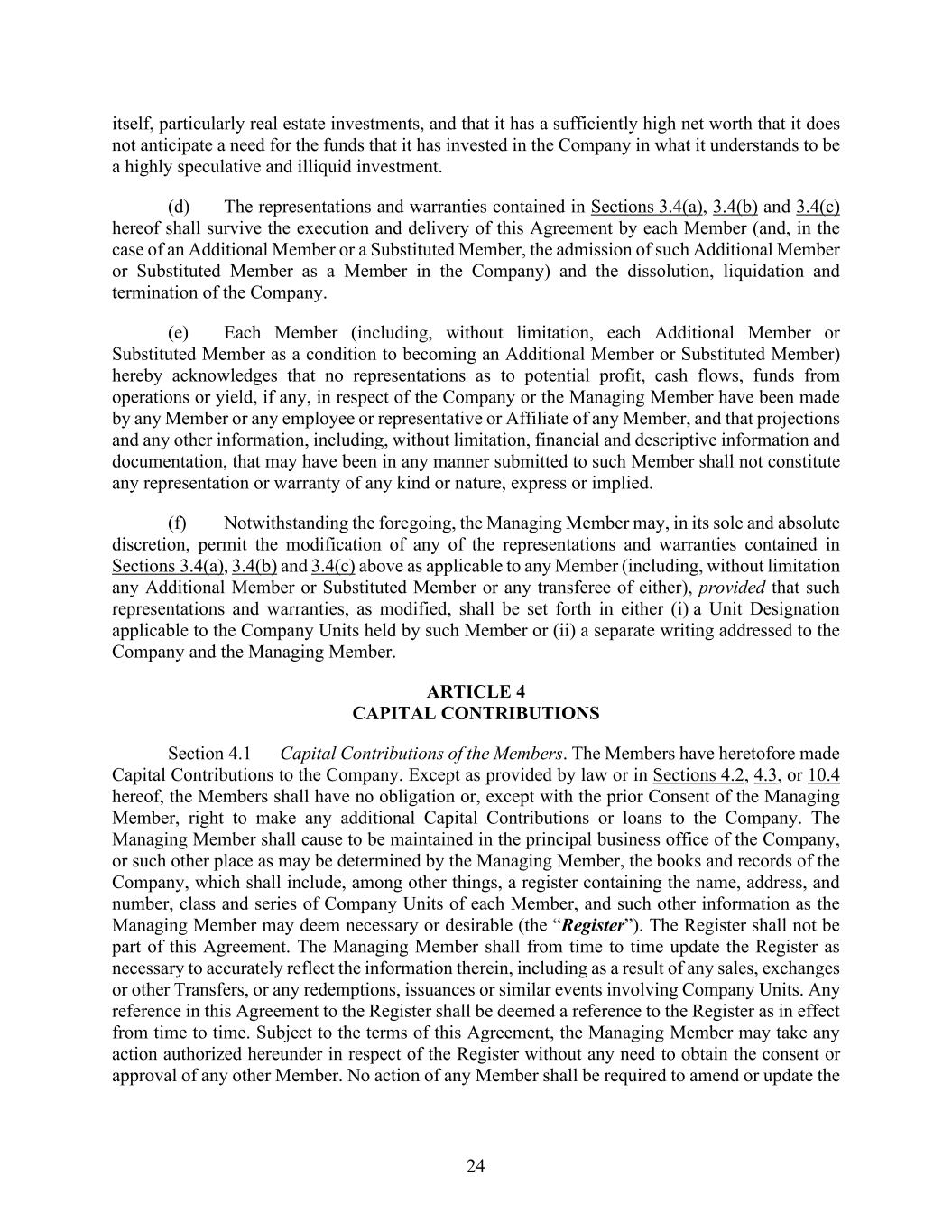 24 itself, particularly real estate investments, and that it has a sufficiently high net worth that it does not anticipate a need for the funds that it has invested in the Company in what it understands to be a highly speculative and illiquid investment. (d) The representations and warranties contained in Sections 3.4(a), 3.4(b) and 3.4(c) hereof shall survive the execution and delivery of this Agreement by each Member (and, in the case of an Additional Member or a Substituted Member, the admission of such Additional Member or Substituted Member as a Member in the Company) and the dissolution, liquidation and termination of the Company. (e) Each Member (including, without limitation, each Additional Member or Substituted Member as a condition to becoming an Additional Member or Substituted Member) hereby acknowledges that no representations as to potential profit, cash flows, funds from operations or yield, if any, in respect of the Company or the Managing Member have been made by any Member or any employee or representative or Affiliate of any Member, and that projections and any other information, including, without limitation, financial and descriptive information and documentation, that may have been in any manner submitted to such Member shall not constitute any representation or warranty of any kind or nature, express or implied. (f) Notwithstanding the foregoing, the Managing Member may, in its sole and absolute discretion, permit the modification of any of the representations and warranties contained in Sections 3.4(a), 3.4(b) and 3.4(c) above as applicable to any Member (including, without limitation any Additional Member or Substituted Member or any transferee of either), provided that such representations and warranties, as modified, shall be set forth in either (i) a Unit Designation applicable to the Company Units held by such Member or (ii) a separate writing addressed to the Company and the Managing Member. ARTICLE 4 CAPITAL CONTRIBUTIONS Section 4.1 Capital Contributions of the Members. The Members have heretofore made Capital Contributions to the Company. Except as provided by law or in Sections 4.2, 4.3, or 10.4 hereof, the Members shall have no obligation or, except with the prior Consent of the Managing Member, right to make any additional Capital Contributions or loans to the Company. The Managing Member shall cause to be maintained in the principal business office of the Company, or such other place as may be determined by the Managing Member, the books and records of the Company, which shall include, among other things, a register containing the name, address, and number, class and series of Company Units of each Member, and such other information as the Managing Member may deem necessary or desirable (the “Register”). The Register shall not be part of this Agreement. The Managing Member shall from time to time update the Register as necessary to accurately reflect the information therein, including as a result of any sales, exchanges or other Transfers, or any redemptions, issuances or similar events involving Company Units. Any reference in this Agreement to the Register shall be deemed a reference to the Register as in effect from time to time. Subject to the terms of this Agreement, the Managing Member may take any action authorized hereunder in respect of the Register without any need to obtain the consent or approval of any other Member. No action of any Member shall be required to amend or update the