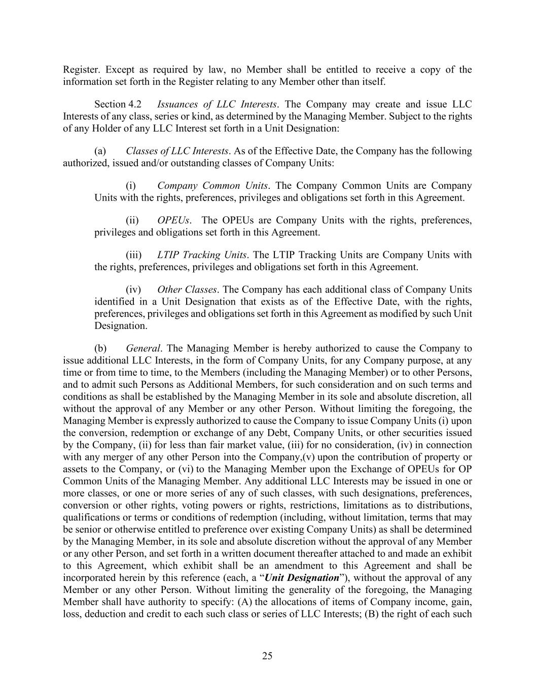 25 Register. Except as required by law, no Member shall be entitled to receive a copy of the information set forth in the Register relating to any Member other than itself. Section 4.2 Issuances of LLC Interests. The Company may create and issue LLC Interests of any class, series or kind, as determined by the Managing Member. Subject to the rights of any Holder of any LLC Interest set forth in a Unit Designation: (a) Classes of LLC Interests. As of the Effective Date, the Company has the following authorized, issued and/or outstanding classes of Company Units: (i) Company Common Units. The Company Common Units are Company Units with the rights, preferences, privileges and obligations set forth in this Agreement. (ii) OPEUs. The OPEUs are Company Units with the rights, preferences, privileges and obligations set forth in this Agreement. (iii) LTIP Tracking Units. The LTIP Tracking Units are Company Units with the rights, preferences, privileges and obligations set forth in this Agreement. (iv) Other Classes. The Company has each additional class of Company Units identified in a Unit Designation that exists as of the Effective Date, with the rights, preferences, privileges and obligations set forth in this Agreement as modified by such Unit Designation. (b) General. The Managing Member is hereby authorized to cause the Company to issue additional LLC Interests, in the form of Company Units, for any Company purpose, at any time or from time to time, to the Members (including the Managing Member) or to other Persons, and to admit such Persons as Additional Members, for such consideration and on such terms and conditions as shall be established by the Managing Member in its sole and absolute discretion, all without the approval of any Member or any other Person. Without limiting the foregoing, the Managing Member is expressly authorized to cause the Company to issue Company Units (i) upon the conversion, redemption or exchange of any Debt, Company Units, or other securities issued by the Company, (ii) for less than fair market value, (iii) for no consideration, (iv) in connection with any merger of any other Person into the Company,(v) upon the contribution of property or assets to the Company, or (vi) to the Managing Member upon the Exchange of OPEUs for OP Common Units of the Managing Member. Any additional LLC Interests may be issued in one or more classes, or one or more series of any of such classes, with such designations, preferences, conversion or other rights, voting powers or rights, restrictions, limitations as to distributions, qualifications or terms or conditions of redemption (including, without limitation, terms that may be senior or otherwise entitled to preference over existing Company Units) as shall be determined by the Managing Member, in its sole and absolute discretion without the approval of any Member or any other Person, and set forth in a written document thereafter attached to and made an exhibit to this Agreement, which exhibit shall be an amendment to this Agreement and shall be incorporated herein by this reference (each, a “Unit Designation”), without the approval of any Member or any other Person. Without limiting the generality of the foregoing, the Managing Member shall have authority to specify: (A) the allocations of items of Company income, gain, loss, deduction and credit to each such class or series of LLC Interests; (B) the right of each such