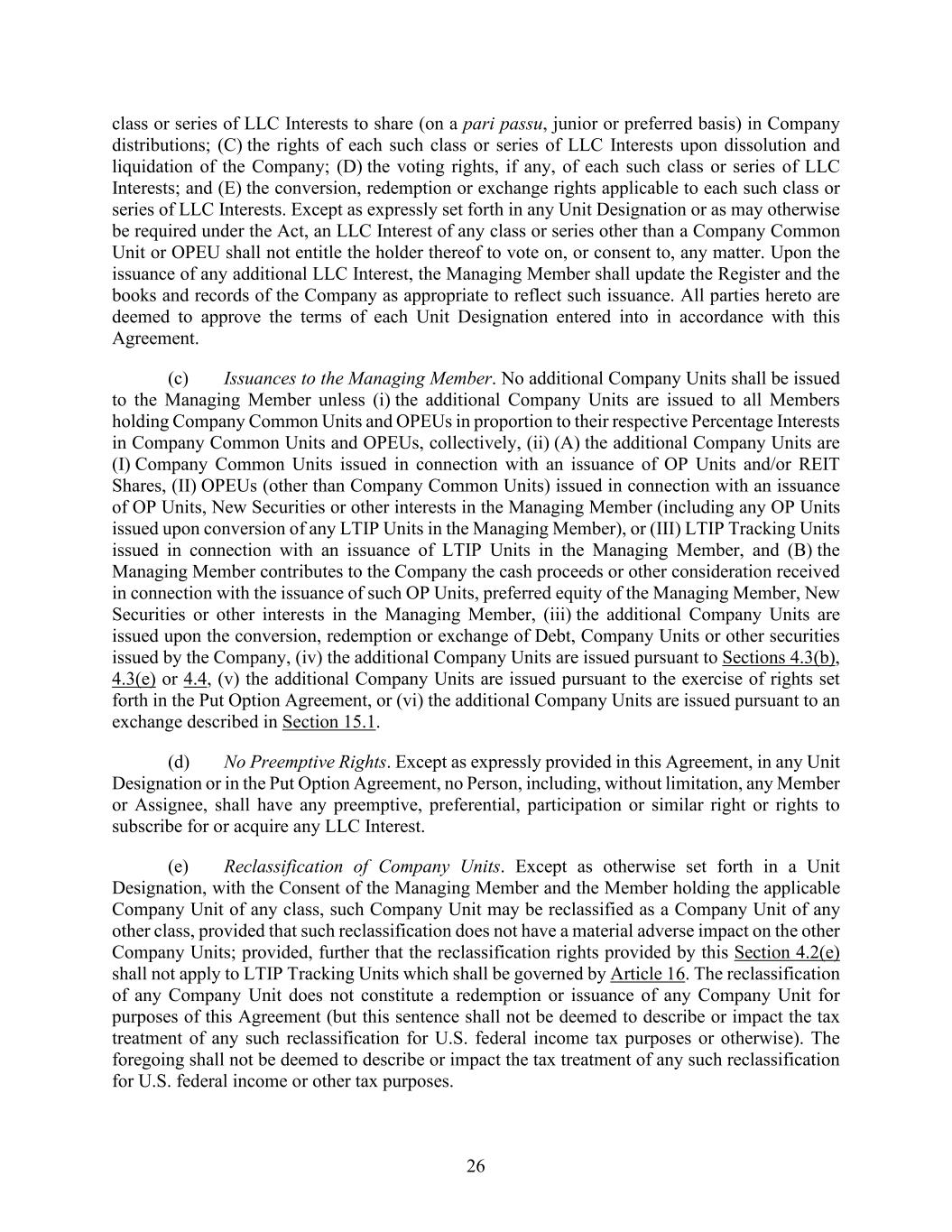 26 class or series of LLC Interests to share (on a pari passu, junior or preferred basis) in Company distributions; (C) the rights of each such class or series of LLC Interests upon dissolution and liquidation of the Company; (D) the voting rights, if any, of each such class or series of LLC Interests; and (E) the conversion, redemption or exchange rights applicable to each such class or series of LLC Interests. Except as expressly set forth in any Unit Designation or as may otherwise be required under the Act, an LLC Interest of any class or series other than a Company Common Unit or OPEU shall not entitle the holder thereof to vote on, or consent to, any matter. Upon the issuance of any additional LLC Interest, the Managing Member shall update the Register and the books and records of the Company as appropriate to reflect such issuance. All parties hereto are deemed to approve the terms of each Unit Designation entered into in accordance with this Agreement. (c) Issuances to the Managing Member. No additional Company Units shall be issued to the Managing Member unless (i) the additional Company Units are issued to all Members holding Company Common Units and OPEUs in proportion to their respective Percentage Interests in Company Common Units and OPEUs, collectively, (ii) (A) the additional Company Units are (I) Company Common Units issued in connection with an issuance of OP Units and/or REIT Shares, (II) OPEUs (other than Company Common Units) issued in connection with an issuance of OP Units, New Securities or other interests in the Managing Member (including any OP Units issued upon conversion of any LTIP Units in the Managing Member), or (III) LTIP Tracking Units issued in connection with an issuance of LTIP Units in the Managing Member, and (B) the Managing Member contributes to the Company the cash proceeds or other consideration received in connection with the issuance of such OP Units, preferred equity of the Managing Member, New Securities or other interests in the Managing Member, (iii) the additional Company Units are issued upon the conversion, redemption or exchange of Debt, Company Units or other securities issued by the Company, (iv) the additional Company Units are issued pursuant to Sections 4.3(b), 4.3(e) or 4.4, (v) the additional Company Units are issued pursuant to the exercise of rights set forth in the Put Option Agreement, or (vi) the additional Company Units are issued pursuant to an exchange described in Section 15.1. (d) No Preemptive Rights. Except as expressly provided in this Agreement, in any Unit Designation or in the Put Option Agreement, no Person, including, without limitation, any Member or Assignee, shall have any preemptive, preferential, participation or similar right or rights to subscribe for or acquire any LLC Interest. (e) Reclassification of Company Units. Except as otherwise set forth in a Unit Designation, with the Consent of the Managing Member and the Member holding the applicable Company Unit of any class, such Company Unit may be reclassified as a Company Unit of any other class, provided that such reclassification does not have a material adverse impact on the other Company Units; provided, further that the reclassification rights provided by this Section 4.2(e) shall not apply to LTIP Tracking Units which shall be governed by Article 16. The reclassification of any Company Unit does not constitute a redemption or issuance of any Company Unit for purposes of this Agreement (but this sentence shall not be deemed to describe or impact the tax treatment of any such reclassification for U.S. federal income tax purposes or otherwise). The foregoing shall not be deemed to describe or impact the tax treatment of any such reclassification for U.S. federal income or other tax purposes.