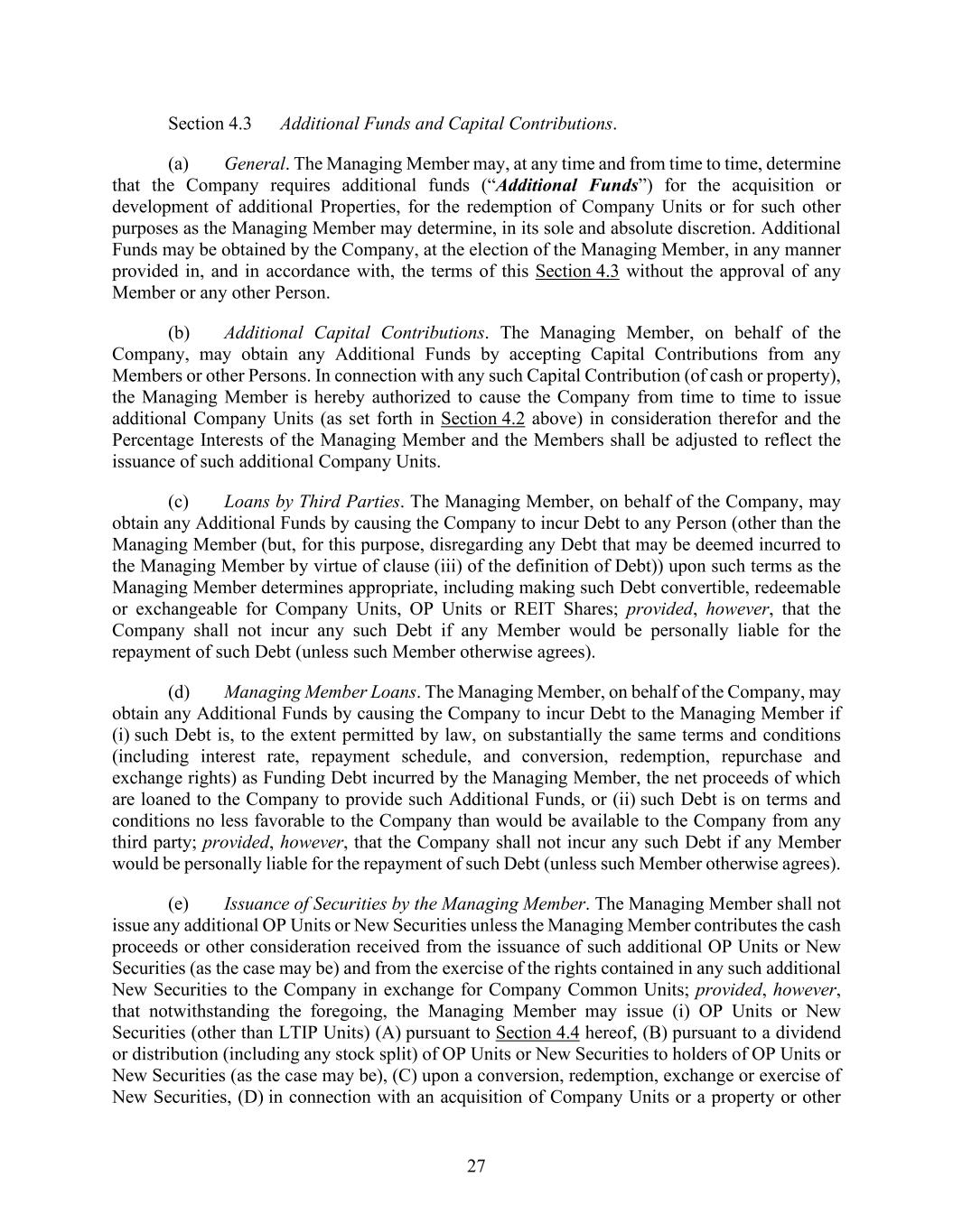 27 Section 4.3 Additional Funds and Capital Contributions. (a) General. The Managing Member may, at any time and from time to time, determine that the Company requires additional funds (“Additional Funds”) for the acquisition or development of additional Properties, for the redemption of Company Units or for such other purposes as the Managing Member may determine, in its sole and absolute discretion. Additional Funds may be obtained by the Company, at the election of the Managing Member, in any manner provided in, and in accordance with, the terms of this Section 4.3 without the approval of any Member or any other Person. (b) Additional Capital Contributions. The Managing Member, on behalf of the Company, may obtain any Additional Funds by accepting Capital Contributions from any Members or other Persons. In connection with any such Capital Contribution (of cash or property), the Managing Member is hereby authorized to cause the Company from time to time to issue additional Company Units (as set forth in Section 4.2 above) in consideration therefor and the Percentage Interests of the Managing Member and the Members shall be adjusted to reflect the issuance of such additional Company Units. (c) Loans by Third Parties. The Managing Member, on behalf of the Company, may obtain any Additional Funds by causing the Company to incur Debt to any Person (other than the Managing Member (but, for this purpose, disregarding any Debt that may be deemed incurred to the Managing Member by virtue of clause (iii) of the definition of Debt)) upon such terms as the Managing Member determines appropriate, including making such Debt convertible, redeemable or exchangeable for Company Units, OP Units or REIT Shares; provided, however, that the Company shall not incur any such Debt if any Member would be personally liable for the repayment of such Debt (unless such Member otherwise agrees). (d) Managing Member Loans. The Managing Member, on behalf of the Company, may obtain any Additional Funds by causing the Company to incur Debt to the Managing Member if (i) such Debt is, to the extent permitted by law, on substantially the same terms and conditions (including interest rate, repayment schedule, and conversion, redemption, repurchase and exchange rights) as Funding Debt incurred by the Managing Member, the net proceeds of which are loaned to the Company to provide such Additional Funds, or (ii) such Debt is on terms and conditions no less favorable to the Company than would be available to the Company from any third party; provided, however, that the Company shall not incur any such Debt if any Member would be personally liable for the repayment of such Debt (unless such Member otherwise agrees). (e) Issuance of Securities by the Managing Member. The Managing Member shall not issue any additional OP Units or New Securities unless the Managing Member contributes the cash proceeds or other consideration received from the issuance of such additional OP Units or New Securities (as the case may be) and from the exercise of the rights contained in any such additional New Securities to the Company in exchange for Company Common Units; provided, however, that notwithstanding the foregoing, the Managing Member may issue (i) OP Units or New Securities (other than LTIP Units) (A) pursuant to Section 4.4 hereof, (B) pursuant to a dividend or distribution (including any stock split) of OP Units or New Securities to holders of OP Units or New Securities (as the case may be), (C) upon a conversion, redemption, exchange or exercise of New Securities, (D) in connection with an acquisition of Company Units or a property or other