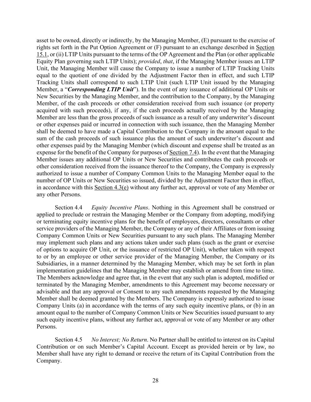 28 asset to be owned, directly or indirectly, by the Managing Member, (E) pursuant to the exercise of rights set forth in the Put Option Agreement or (F) pursuant to an exchange described in Section 15.1, or (ii) LTIP Units pursuant to the terms of the OP Agreement and the Plan (or other applicable Equity Plan governing such LTIP Units); provided, that, if the Managing Member issues an LTIP Unit, the Managing Member will cause the Company to issue a number of LTIP Tracking Units equal to the quotient of one divided by the Adjustment Factor then in effect, and such LTIP Tracking Units shall correspond to such LTIP Unit (such LTIP Unit issued by the Managing Member, a “Corresponding LTIP Unit”). In the event of any issuance of additional OP Units or New Securities by the Managing Member, and the contribution to the Company, by the Managing Member, of the cash proceeds or other consideration received from such issuance (or property acquired with such proceeds), if any, if the cash proceeds actually received by the Managing Member are less than the gross proceeds of such issuance as a result of any underwriter’s discount or other expenses paid or incurred in connection with such issuance, then the Managing Member shall be deemed to have made a Capital Contribution to the Company in the amount equal to the sum of the cash proceeds of such issuance plus the amount of such underwriter’s discount and other expenses paid by the Managing Member (which discount and expense shall be treated as an expense for the benefit of the Company for purposes of Section 7.4). In the event that the Managing Member issues any additional OP Units or New Securities and contributes the cash proceeds or other consideration received from the issuance thereof to the Company, the Company is expressly authorized to issue a number of Company Common Units to the Managing Member equal to the number of OP Units or New Securities so issued, divided by the Adjustment Factor then in effect, in accordance with this Section 4.3(e) without any further act, approval or vote of any Member or any other Persons. Section 4.4 Equity Incentive Plans. Nothing in this Agreement shall be construed or applied to preclude or restrain the Managing Member or the Company from adopting, modifying or terminating equity incentive plans for the benefit of employees, directors, consultants or other service providers of the Managing Member, the Company or any of their Affiliates or from issuing Company Common Units or New Securities pursuant to any such plans. The Managing Member may implement such plans and any actions taken under such plans (such as the grant or exercise of options to acquire OP Unit, or the issuance of restricted OP Unit), whether taken with respect to or by an employee or other service provider of the Managing Member, the Company or its Subsidiaries, in a manner determined by the Managing Member, which may be set forth in plan implementation guidelines that the Managing Member may establish or amend from time to time. The Members acknowledge and agree that, in the event that any such plan is adopted, modified or terminated by the Managing Member, amendments to this Agreement may become necessary or advisable and that any approval or Consent to any such amendments requested by the Managing Member shall be deemed granted by the Members. The Company is expressly authorized to issue Company Units (a) in accordance with the terms of any such equity incentive plans, or (b) in an amount equal to the number of Company Common Units or New Securities issued pursuant to any such equity incentive plans, without any further act, approval or vote of any Member or any other Persons. Section 4.5 No Interest; No Return. No Partner shall be entitled to interest on its Capital Contribution or on such Member’s Capital Account. Except as provided herein or by law, no Member shall have any right to demand or receive the return of its Capital Contribution from the Company.