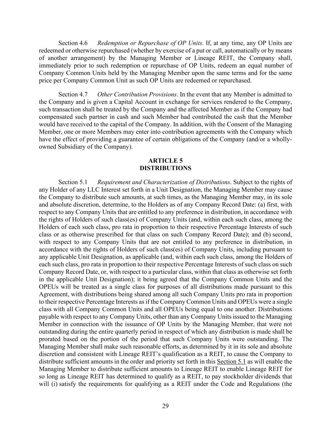 29 Section 4.6 Redemption or Repurchase of OP Units. If, at any time, any OP Units are redeemed or otherwise repurchased (whether by exercise of a put or call, automatically or by means of another arrangement) by the Managing Member or Lineage REIT, the Company shall, immediately prior to such redemption or repurchase of OP Units, redeem an equal number of Company Common Units held by the Managing Member upon the same terms and for the same price per Company Common Unit as such OP Units are redeemed or repurchased. Section 4.7 Other Contribution Provisions. In the event that any Member is admitted to the Company and is given a Capital Account in exchange for services rendered to the Company, such transaction shall be treated by the Company and the affected Member as if the Company had compensated such partner in cash and such Member had contributed the cash that the Member would have received to the capital of the Company. In addition, with the Consent of the Managing Member, one or more Members may enter into contribution agreements with the Company which have the effect of providing a guarantee of certain obligations of the Company (and/or a wholly- owned Subsidiary of the Company). ARTICLE 5 DISTRIBUTIONS Section 5.1 Requirement and Characterization of Distributions. Subject to the rights of any Holder of any LLC Interest set forth in a Unit Designation, the Managing Member may cause the Company to distribute such amounts, at such times, as the Managing Member may, in its sole and absolute discretion, determine, to the Holders as of any Company Record Date: (a) first, with respect to any Company Units that are entitled to any preference in distribution, in accordance with the rights of Holders of such class(es) of Company Units (and, within each such class, among the Holders of each such class, pro rata in proportion to their respective Percentage Interests of such class or as otherwise prescribed for that class on such Company Record Date); and (b) second, with respect to any Company Units that are not entitled to any preference in distribution, in accordance with the rights of Holders of such class(es) of Company Units, including pursuant to any applicable Unit Designation, as applicable (and, within each such class, among the Holders of each such class, pro rata in proportion to their respective Percentage Interests of such class on such Company Record Date, or, with respect to a particular class, within that class as otherwise set forth in the applicable Unit Designation); it being agreed that the Company Common Units and the OPEUs will be treated as a single class for purposes of all distributions made pursuant to this Agreement, with distributions being shared among all such Company Units pro rata in proportion to their respective Percentage Interests as if the Company Common Units and OPEUs were a single class with all Company Common Units and all OPEUs being equal to one another. Distributions payable with respect to any Company Units, other than any Company Units issued to the Managing Member in connection with the issuance of OP Units by the Managing Member, that were not outstanding during the entire quarterly period in respect of which any distribution is made shall be prorated based on the portion of the period that such Company Units were outstanding. The Managing Member shall make such reasonable efforts, as determined by it in its sole and absolute discretion and consistent with Lineage REIT’s qualification as a REIT, to cause the Company to distribute sufficient amounts in the order and priority set forth in this Section 5.1 as will enable the Managing Member to distribute sufficient amounts to Lineage REIT to enable Lineage REIT for so long as Lineage REIT has determined to qualify as a REIT, to pay stockholder dividends that will (i) satisfy the requirements for qualifying as a REIT under the Code and Regulations (the