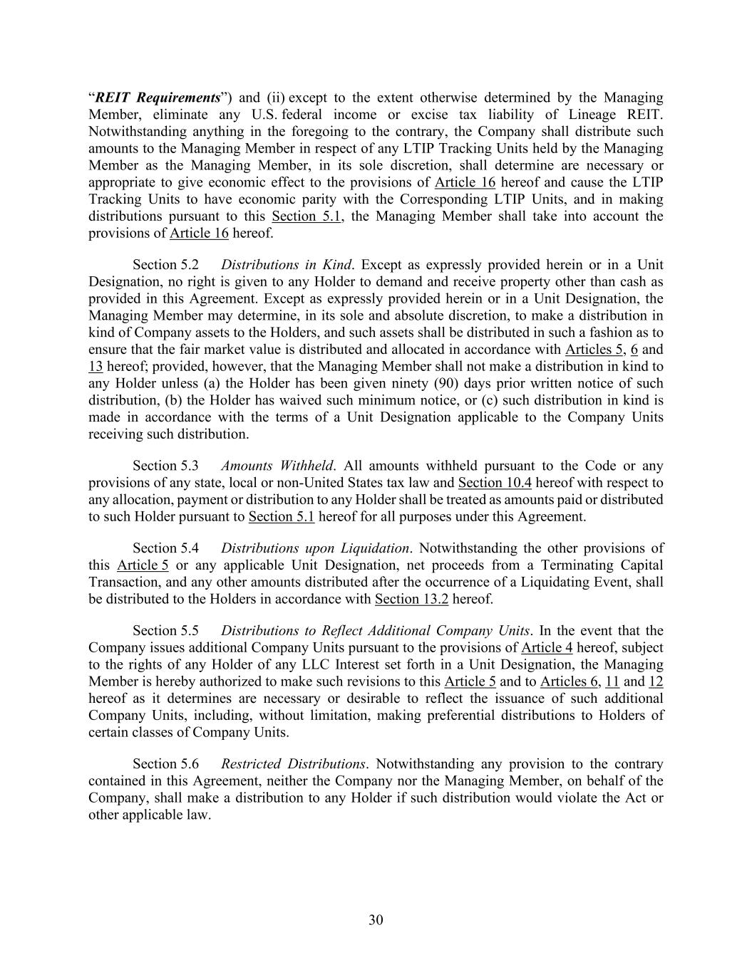 30 “REIT Requirements”) and (ii) except to the extent otherwise determined by the Managing Member, eliminate any U.S. federal income or excise tax liability of Lineage REIT. Notwithstanding anything in the foregoing to the contrary, the Company shall distribute such amounts to the Managing Member in respect of any LTIP Tracking Units held by the Managing Member as the Managing Member, in its sole discretion, shall determine are necessary or appropriate to give economic effect to the provisions of Article 16 hereof and cause the LTIP Tracking Units to have economic parity with the Corresponding LTIP Units, and in making distributions pursuant to this Section 5.1, the Managing Member shall take into account the provisions of Article 16 hereof. Section 5.2 Distributions in Kind. Except as expressly provided herein or in a Unit Designation, no right is given to any Holder to demand and receive property other than cash as provided in this Agreement. Except as expressly provided herein or in a Unit Designation, the Managing Member may determine, in its sole and absolute discretion, to make a distribution in kind of Company assets to the Holders, and such assets shall be distributed in such a fashion as to ensure that the fair market value is distributed and allocated in accordance with Articles 5, 6 and 13 hereof; provided, however, that the Managing Member shall not make a distribution in kind to any Holder unless (a) the Holder has been given ninety (90) days prior written notice of such distribution, (b) the Holder has waived such minimum notice, or (c) such distribution in kind is made in accordance with the terms of a Unit Designation applicable to the Company Units receiving such distribution. Section 5.3 Amounts Withheld. All amounts withheld pursuant to the Code or any provisions of any state, local or non-United States tax law and Section 10.4 hereof with respect to any allocation, payment or distribution to any Holder shall be treated as amounts paid or distributed to such Holder pursuant to Section 5.1 hereof for all purposes under this Agreement. Section 5.4 Distributions upon Liquidation. Notwithstanding the other provisions of this Article 5 or any applicable Unit Designation, net proceeds from a Terminating Capital Transaction, and any other amounts distributed after the occurrence of a Liquidating Event, shall be distributed to the Holders in accordance with Section 13.2 hereof. Section 5.5 Distributions to Reflect Additional Company Units. In the event that the Company issues additional Company Units pursuant to the provisions of Article 4 hereof, subject to the rights of any Holder of any LLC Interest set forth in a Unit Designation, the Managing Member is hereby authorized to make such revisions to this Article 5 and to Articles 6, 11 and 12 hereof as it determines are necessary or desirable to reflect the issuance of such additional Company Units, including, without limitation, making preferential distributions to Holders of certain classes of Company Units. Section 5.6 Restricted Distributions. Notwithstanding any provision to the contrary contained in this Agreement, neither the Company nor the Managing Member, on behalf of the Company, shall make a distribution to any Holder if such distribution would violate the Act or other applicable law.