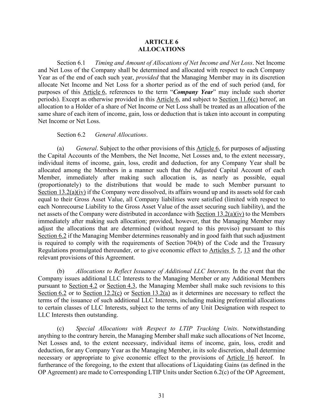 31 ARTICLE 6 ALLOCATIONS Section 6.1 Timing and Amount of Allocations of Net Income and Net Loss. Net Income and Net Loss of the Company shall be determined and allocated with respect to each Company Year as of the end of each such year, provided that the Managing Member may in its discretion allocate Net Income and Net Loss for a shorter period as of the end of such period (and, for purposes of this Article 6, references to the term “Company Year” may include such shorter periods). Except as otherwise provided in this Article 6, and subject to Section 11.6(c) hereof, an allocation to a Holder of a share of Net Income or Net Loss shall be treated as an allocation of the same share of each item of income, gain, loss or deduction that is taken into account in computing Net Income or Net Loss. Section 6.2 General Allocations. (a) General. Subject to the other provisions of this Article 6, for purposes of adjusting the Capital Accounts of the Members, the Net Income, Net Losses and, to the extent necessary, individual items of income, gain, loss, credit and deduction, for any Company Year shall be allocated among the Members in a manner such that the Adjusted Capital Account of each Member, immediately after making such allocation is, as nearly as possible, equal (proportionately) to the distributions that would be made to such Member pursuant to Section 13.2(a)(iv) if the Company were dissolved, its affairs wound up and its assets sold for cash equal to their Gross Asset Value, all Company liabilities were satisfied (limited with respect to each Nonrecourse Liability to the Gross Asset Value of the asset securing such liability), and the net assets of the Company were distributed in accordance with Section 13.2(a)(iv) to the Members immediately after making such allocation; provided, however, that the Managing Member may adjust the allocations that are determined (without regard to this proviso) pursuant to this Section 6.2 if the Managing Member determines reasonably and in good faith that such adjustment is required to comply with the requirements of Section 704(b) of the Code and the Treasury Regulations promulgated thereunder, or to give economic effect to Articles 5, 7, 13 and the other relevant provisions of this Agreement. (b) Allocations to Reflect Issuance of Additional LLC Interests. In the event that the Company issues additional LLC Interests to the Managing Member or any Additional Members pursuant to Section 4.2 or Section 4.3, the Managing Member shall make such revisions to this Section 6.2 or to Section 12.2(c) or Section 13.2(a) as it determines are necessary to reflect the terms of the issuance of such additional LLC Interests, including making preferential allocations to certain classes of LLC Interests, subject to the terms of any Unit Designation with respect to LLC Interests then outstanding. (c) Special Allocations with Respect to LTIP Tracking Units. Notwithstanding anything to the contrary herein, the Managing Member shall make such allocations of Net Income, Net Losses and, to the extent necessary, individual items of income, gain, loss, credit and deduction, for any Company Year as the Managing Member, in its sole discretion, shall determine necessary or appropriate to give economic effect to the provisions of Article 16 hereof. In furtherance of the foregoing, to the extent that allocations of Liquidating Gains (as defined in the OP Agreement) are made to Corresponding LTIP Units under Section 6.2(c) of the OP Agreement,