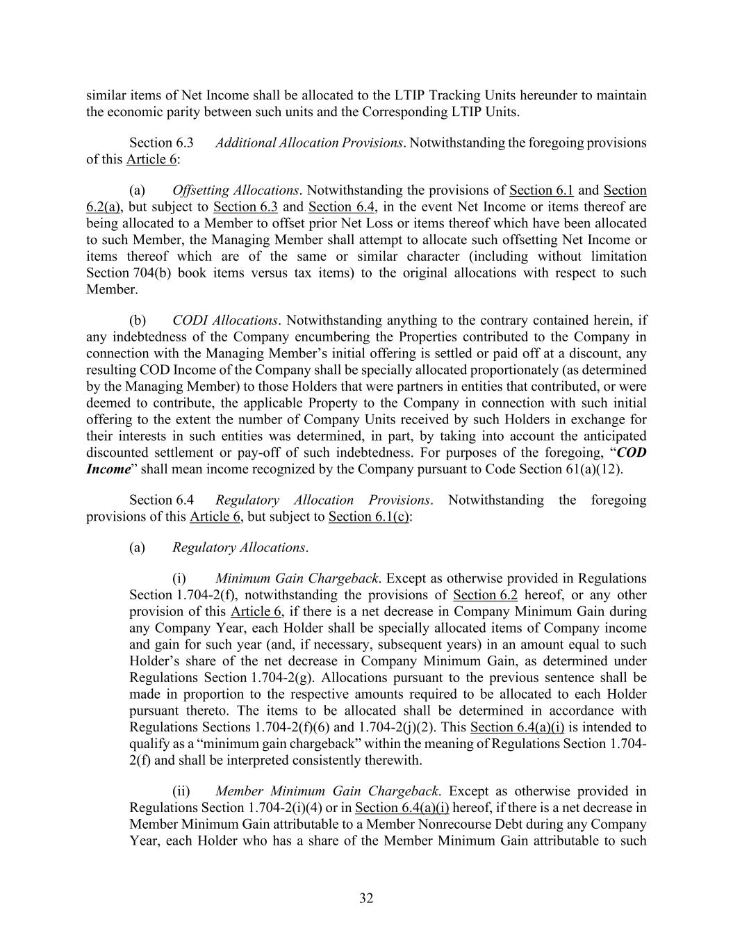 32 similar items of Net Income shall be allocated to the LTIP Tracking Units hereunder to maintain the economic parity between such units and the Corresponding LTIP Units. Section 6.3 Additional Allocation Provisions. Notwithstanding the foregoing provisions of this Article 6: (a) Offsetting Allocations. Notwithstanding the provisions of Section 6.1 and Section 6.2(a), but subject to Section 6.3 and Section 6.4, in the event Net Income or items thereof are being allocated to a Member to offset prior Net Loss or items thereof which have been allocated to such Member, the Managing Member shall attempt to allocate such offsetting Net Income or items thereof which are of the same or similar character (including without limitation Section 704(b) book items versus tax items) to the original allocations with respect to such Member. (b) CODI Allocations. Notwithstanding anything to the contrary contained herein, if any indebtedness of the Company encumbering the Properties contributed to the Company in connection with the Managing Member’s initial offering is settled or paid off at a discount, any resulting COD Income of the Company shall be specially allocated proportionately (as determined by the Managing Member) to those Holders that were partners in entities that contributed, or were deemed to contribute, the applicable Property to the Company in connection with such initial offering to the extent the number of Company Units received by such Holders in exchange for their interests in such entities was determined, in part, by taking into account the anticipated discounted settlement or pay-off of such indebtedness. For purposes of the foregoing, “COD Income” shall mean income recognized by the Company pursuant to Code Section 61(a)(12). Section 6.4 Regulatory Allocation Provisions. Notwithstanding the foregoing provisions of this Article 6, but subject to Section 6.1(c): (a) Regulatory Allocations. (i) Minimum Gain Chargeback. Except as otherwise provided in Regulations Section 1.704-2(f), notwithstanding the provisions of Section 6.2 hereof, or any other provision of this Article 6, if there is a net decrease in Company Minimum Gain during any Company Year, each Holder shall be specially allocated items of Company income and gain for such year (and, if necessary, subsequent years) in an amount equal to such Holder’s share of the net decrease in Company Minimum Gain, as determined under Regulations Section 1.704-2(g). Allocations pursuant to the previous sentence shall be made in proportion to the respective amounts required to be allocated to each Holder pursuant thereto. The items to be allocated shall be determined in accordance with Regulations Sections 1.704-2(f)(6) and 1.704-2(j)(2). This Section 6.4(a)(i) is intended to qualify as a “minimum gain chargeback” within the meaning of Regulations Section 1.704- 2(f) and shall be interpreted consistently therewith. (ii) Member Minimum Gain Chargeback. Except as otherwise provided in Regulations Section 1.704-2(i)(4) or in Section 6.4(a)(i) hereof, if there is a net decrease in Member Minimum Gain attributable to a Member Nonrecourse Debt during any Company Year, each Holder who has a share of the Member Minimum Gain attributable to such