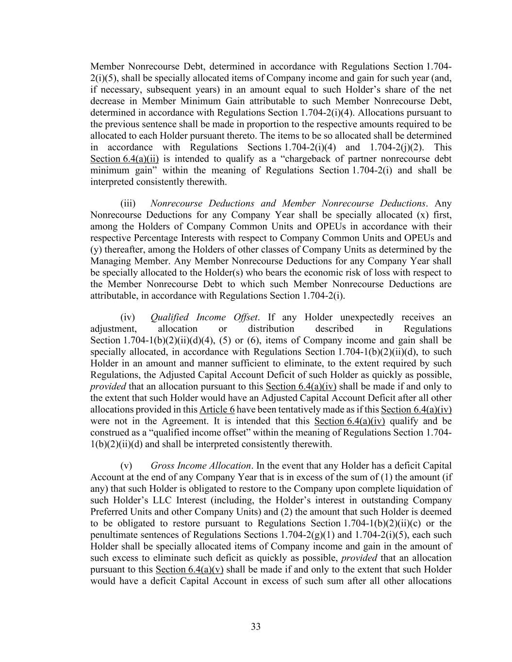 33 Member Nonrecourse Debt, determined in accordance with Regulations Section 1.704- 2(i)(5), shall be specially allocated items of Company income and gain for such year (and, if necessary, subsequent years) in an amount equal to such Holder’s share of the net decrease in Member Minimum Gain attributable to such Member Nonrecourse Debt, determined in accordance with Regulations Section 1.704-2(i)(4). Allocations pursuant to the previous sentence shall be made in proportion to the respective amounts required to be allocated to each Holder pursuant thereto. The items to be so allocated shall be determined in accordance with Regulations Sections 1.704-2(i)(4) and 1.704-2(j)(2). This Section 6.4(a)(ii) is intended to qualify as a “chargeback of partner nonrecourse debt minimum gain” within the meaning of Regulations Section 1.704-2(i) and shall be interpreted consistently therewith. (iii) Nonrecourse Deductions and Member Nonrecourse Deductions. Any Nonrecourse Deductions for any Company Year shall be specially allocated (x) first, among the Holders of Company Common Units and OPEUs in accordance with their respective Percentage Interests with respect to Company Common Units and OPEUs and (y) thereafter, among the Holders of other classes of Company Units as determined by the Managing Member. Any Member Nonrecourse Deductions for any Company Year shall be specially allocated to the Holder(s) who bears the economic risk of loss with respect to the Member Nonrecourse Debt to which such Member Nonrecourse Deductions are attributable, in accordance with Regulations Section 1.704-2(i). (iv) Qualified Income Offset. If any Holder unexpectedly receives an adjustment, allocation or distribution described in Regulations Section 1.704-1(b)(2)(ii)(d)(4), (5) or (6), items of Company income and gain shall be specially allocated, in accordance with Regulations Section 1.704-1(b)(2)(ii)(d), to such Holder in an amount and manner sufficient to eliminate, to the extent required by such Regulations, the Adjusted Capital Account Deficit of such Holder as quickly as possible, provided that an allocation pursuant to this Section 6.4(a)(iv) shall be made if and only to the extent that such Holder would have an Adjusted Capital Account Deficit after all other allocations provided in this Article 6 have been tentatively made as if this Section 6.4(a)(iv) were not in the Agreement. It is intended that this Section 6.4(a)(iv) qualify and be construed as a “qualified income offset” within the meaning of Regulations Section 1.704- 1(b)(2)(ii)(d) and shall be interpreted consistently therewith. (v) Gross Income Allocation. In the event that any Holder has a deficit Capital Account at the end of any Company Year that is in excess of the sum of (1) the amount (if any) that such Holder is obligated to restore to the Company upon complete liquidation of such Holder’s LLC Interest (including, the Holder’s interest in outstanding Company Preferred Units and other Company Units) and (2) the amount that such Holder is deemed to be obligated to restore pursuant to Regulations Section 1.704-1(b)(2)(ii)(c) or the penultimate sentences of Regulations Sections 1.704-2(g)(1) and 1.704-2(i)(5), each such Holder shall be specially allocated items of Company income and gain in the amount of such excess to eliminate such deficit as quickly as possible, provided that an allocation pursuant to this Section 6.4(a)(v) shall be made if and only to the extent that such Holder would have a deficit Capital Account in excess of such sum after all other allocations