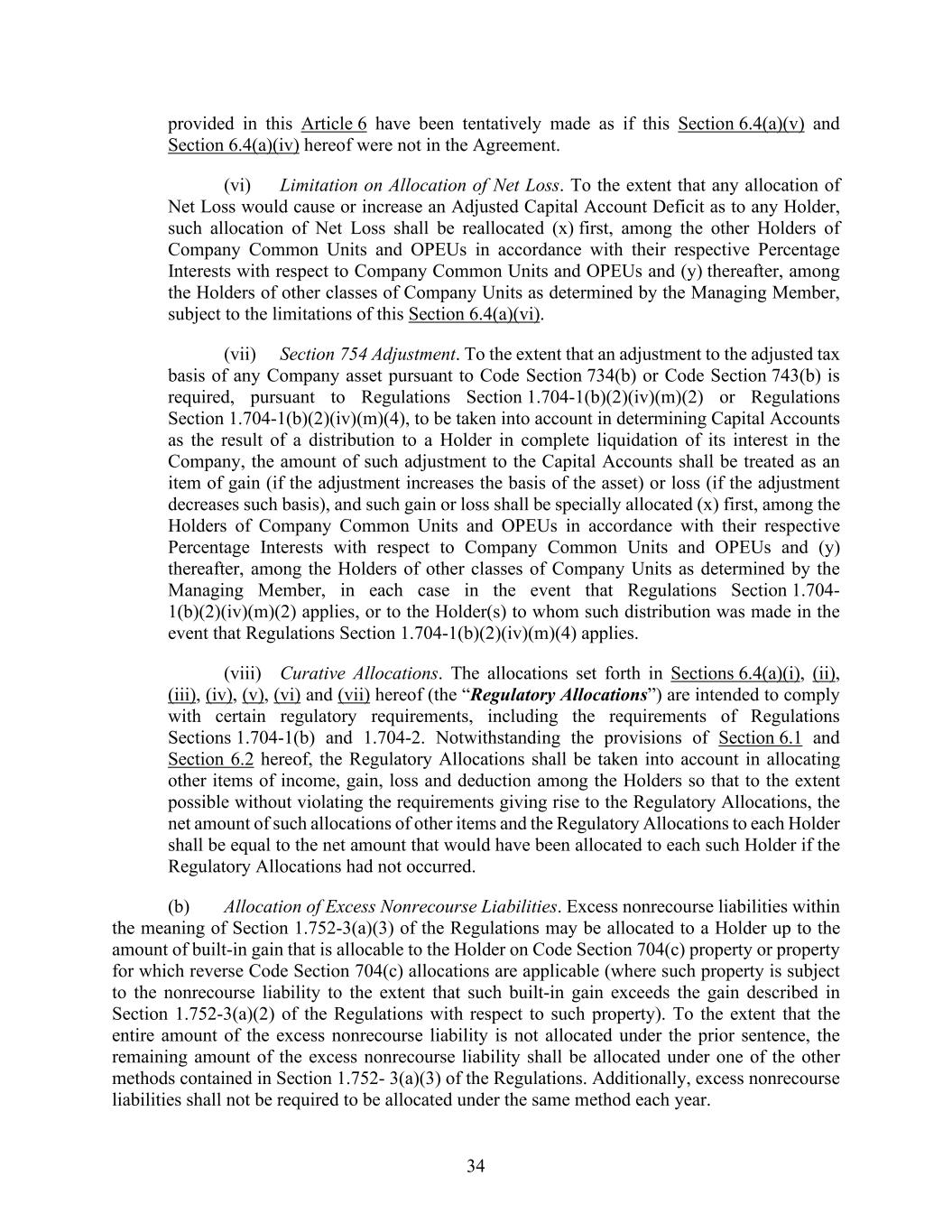 34 provided in this Article 6 have been tentatively made as if this Section 6.4(a)(v) and Section 6.4(a)(iv) hereof were not in the Agreement. (vi) Limitation on Allocation of Net Loss. To the extent that any allocation of Net Loss would cause or increase an Adjusted Capital Account Deficit as to any Holder, such allocation of Net Loss shall be reallocated (x) first, among the other Holders of Company Common Units and OPEUs in accordance with their respective Percentage Interests with respect to Company Common Units and OPEUs and (y) thereafter, among the Holders of other classes of Company Units as determined by the Managing Member, subject to the limitations of this Section 6.4(a)(vi). (vii) Section 754 Adjustment. To the extent that an adjustment to the adjusted tax basis of any Company asset pursuant to Code Section 734(b) or Code Section 743(b) is required, pursuant to Regulations Section 1.704-1(b)(2)(iv)(m)(2) or Regulations Section 1.704-1(b)(2)(iv)(m)(4), to be taken into account in determining Capital Accounts as the result of a distribution to a Holder in complete liquidation of its interest in the Company, the amount of such adjustment to the Capital Accounts shall be treated as an item of gain (if the adjustment increases the basis of the asset) or loss (if the adjustment decreases such basis), and such gain or loss shall be specially allocated (x) first, among the Holders of Company Common Units and OPEUs in accordance with their respective Percentage Interests with respect to Company Common Units and OPEUs and (y) thereafter, among the Holders of other classes of Company Units as determined by the Managing Member, in each case in the event that Regulations Section 1.704- 1(b)(2)(iv)(m)(2) applies, or to the Holder(s) to whom such distribution was made in the event that Regulations Section 1.704-1(b)(2)(iv)(m)(4) applies. (viii) Curative Allocations. The allocations set forth in Sections 6.4(a)(i), (ii), (iii), (iv), (v), (vi) and (vii) hereof (the “Regulatory Allocations”) are intended to comply with certain regulatory requirements, including the requirements of Regulations Sections 1.704-1(b) and 1.704-2. Notwithstanding the provisions of Section 6.1 and Section 6.2 hereof, the Regulatory Allocations shall be taken into account in allocating other items of income, gain, loss and deduction among the Holders so that to the extent possible without violating the requirements giving rise to the Regulatory Allocations, the net amount of such allocations of other items and the Regulatory Allocations to each Holder shall be equal to the net amount that would have been allocated to each such Holder if the Regulatory Allocations had not occurred. (b) Allocation of Excess Nonrecourse Liabilities. Excess nonrecourse liabilities within the meaning of Section 1.752-3(a)(3) of the Regulations may be allocated to a Holder up to the amount of built-in gain that is allocable to the Holder on Code Section 704(c) property or property for which reverse Code Section 704(c) allocations are applicable (where such property is subject to the nonrecourse liability to the extent that such built-in gain exceeds the gain described in Section 1.752-3(a)(2) of the Regulations with respect to such property). To the extent that the entire amount of the excess nonrecourse liability is not allocated under the prior sentence, the remaining amount of the excess nonrecourse liability shall be allocated under one of the other methods contained in Section 1.752- 3(a)(3) of the Regulations. Additionally, excess nonrecourse liabilities shall not be required to be allocated under the same method each year.