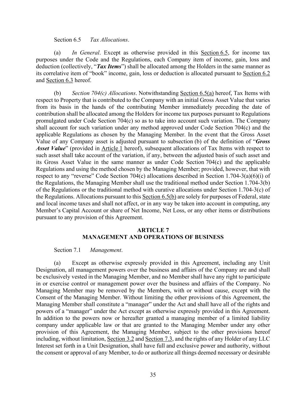 35 Section 6.5 Tax Allocations. (a) In General. Except as otherwise provided in this Section 6.5, for income tax purposes under the Code and the Regulations, each Company item of income, gain, loss and deduction (collectively, “Tax Items”) shall be allocated among the Holders in the same manner as its correlative item of “book” income, gain, loss or deduction is allocated pursuant to Section 6.2 and Section 6.3 hereof. (b) Section 704(c) Allocations. Notwithstanding Section 6.5(a) hereof, Tax Items with respect to Property that is contributed to the Company with an initial Gross Asset Value that varies from its basis in the hands of the contributing Member immediately preceding the date of contribution shall be allocated among the Holders for income tax purposes pursuant to Regulations promulgated under Code Section 704(c) so as to take into account such variation. The Company shall account for such variation under any method approved under Code Section 704(c) and the applicable Regulations as chosen by the Managing Member. In the event that the Gross Asset Value of any Company asset is adjusted pursuant to subsection (b) of the definition of “Gross Asset Value” (provided in Article 1 hereof), subsequent allocations of Tax Items with respect to such asset shall take account of the variation, if any, between the adjusted basis of such asset and its Gross Asset Value in the same manner as under Code Section 704(c) and the applicable Regulations and using the method chosen by the Managing Member; provided, however, that with respect to any “reverse” Code Section 704(c) allocations described in Section 1.704-3(a)(6)(i) of the Regulations, the Managing Member shall use the traditional method under Section 1.704-3(b) of the Regulations or the traditional method with curative allocations under Section 1.704-3(c) of the Regulations. Allocations pursuant to this Section 6.5(b) are solely for purposes of Federal, state and local income taxes and shall not affect, or in any way be taken into account in computing, any Member’s Capital Account or share of Net Income, Net Loss, or any other items or distributions pursuant to any provision of this Agreement. ARTICLE 7 MANAGEMENT AND OPERATIONS OF BUSINESS Section 7.1 Management. (a) Except as otherwise expressly provided in this Agreement, including any Unit Designation, all management powers over the business and affairs of the Company are and shall be exclusively vested in the Managing Member, and no Member shall have any right to participate in or exercise control or management power over the business and affairs of the Company. No Managing Member may be removed by the Members, with or without cause, except with the Consent of the Managing Member. Without limiting the other provisions of this Agreement, the Managing Member shall constitute a “manager” under the Act and shall have all of the rights and powers of a “manager” under the Act except as otherwise expressly provided in this Agreement. In addition to the powers now or hereafter granted a managing member of a limited liability company under applicable law or that are granted to the Managing Member under any other provision of this Agreement, the Managing Member, subject to the other provisions hereof including, without limitation, Section 3.2 and Section 7.3, and the rights of any Holder of any LLC Interest set forth in a Unit Designation, shall have full and exclusive power and authority, without the consent or approval of any Member, to do or authorize all things deemed necessary or desirable