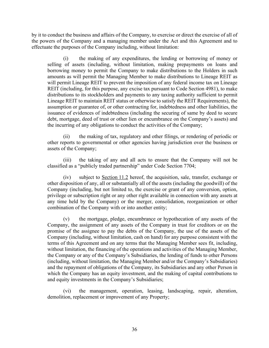 36 by it to conduct the business and affairs of the Company, to exercise or direct the exercise of all of the powers of the Company and a managing member under the Act and this Agreement and to effectuate the purposes of the Company including, without limitation: (i) the making of any expenditures, the lending or borrowing of money or selling of assets (including, without limitation, making prepayments on loans and borrowing money to permit the Company to make distributions to the Holders in such amounts as will permit the Managing Member to make distributions to Lineage REIT as will permit Lineage REIT to prevent the imposition of any federal income tax on Lineage REIT (including, for this purpose, any excise tax pursuant to Code Section 4981), to make distributions to its stockholders and payments to any taxing authority sufficient to permit Lineage REIT to maintain REIT status or otherwise to satisfy the REIT Requirements), the assumption or guarantee of, or other contracting for, indebtedness and other liabilities, the issuance of evidences of indebtedness (including the securing of same by deed to secure debt, mortgage, deed of trust or other lien or encumbrance on the Company’s assets) and the incurring of any obligations to conduct the activities of the Company; (ii) the making of tax, regulatory and other filings, or rendering of periodic or other reports to governmental or other agencies having jurisdiction over the business or assets of the Company; (iii) the taking of any and all acts to ensure that the Company will not be classified as a “publicly traded partnership” under Code Section 7704; (iv) subject to Section 11.2 hereof, the acquisition, sale, transfer, exchange or other disposition of any, all or substantially all of the assets (including the goodwill) of the Company (including, but not limited to, the exercise or grant of any conversion, option, privilege or subscription right or any other right available in connection with any assets at any time held by the Company) or the merger, consolidation, reorganization or other combination of the Company with or into another entity; (v) the mortgage, pledge, encumbrance or hypothecation of any assets of the Company, the assignment of any assets of the Company in trust for creditors or on the promise of the assignee to pay the debts of the Company, the use of the assets of the Company (including, without limitation, cash on hand) for any purpose consistent with the terms of this Agreement and on any terms that the Managing Member sees fit, including, without limitation, the financing of the operations and activities of the Managing Member, the Company or any of the Company’s Subsidiaries, the lending of funds to other Persons (including, without limitation, the Managing Member and/or the Company’s Subsidiaries) and the repayment of obligations of the Company, its Subsidiaries and any other Person in which the Company has an equity investment, and the making of capital contributions to and equity investments in the Company’s Subsidiaries; (vi) the management, operation, leasing, landscaping, repair, alteration, demolition, replacement or improvement of any Property;