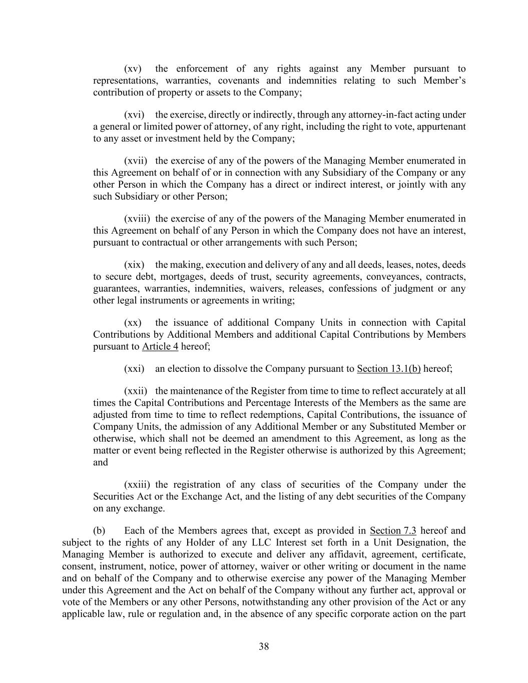 38 (xv) the enforcement of any rights against any Member pursuant to representations, warranties, covenants and indemnities relating to such Member’s contribution of property or assets to the Company; (xvi) the exercise, directly or indirectly, through any attorney-in-fact acting under a general or limited power of attorney, of any right, including the right to vote, appurtenant to any asset or investment held by the Company; (xvii) the exercise of any of the powers of the Managing Member enumerated in this Agreement on behalf of or in connection with any Subsidiary of the Company or any other Person in which the Company has a direct or indirect interest, or jointly with any such Subsidiary or other Person; (xviii) the exercise of any of the powers of the Managing Member enumerated in this Agreement on behalf of any Person in which the Company does not have an interest, pursuant to contractual or other arrangements with such Person; (xix) the making, execution and delivery of any and all deeds, leases, notes, deeds to secure debt, mortgages, deeds of trust, security agreements, conveyances, contracts, guarantees, warranties, indemnities, waivers, releases, confessions of judgment or any other legal instruments or agreements in writing; (xx) the issuance of additional Company Units in connection with Capital Contributions by Additional Members and additional Capital Contributions by Members pursuant to Article 4 hereof; (xxi) an election to dissolve the Company pursuant to Section 13.1(b) hereof; (xxii) the maintenance of the Register from time to time to reflect accurately at all times the Capital Contributions and Percentage Interests of the Members as the same are adjusted from time to time to reflect redemptions, Capital Contributions, the issuance of Company Units, the admission of any Additional Member or any Substituted Member or otherwise, which shall not be deemed an amendment to this Agreement, as long as the matter or event being reflected in the Register otherwise is authorized by this Agreement; and (xxiii) the registration of any class of securities of the Company under the Securities Act or the Exchange Act, and the listing of any debt securities of the Company on any exchange. (b) Each of the Members agrees that, except as provided in Section 7.3 hereof and subject to the rights of any Holder of any LLC Interest set forth in a Unit Designation, the Managing Member is authorized to execute and deliver any affidavit, agreement, certificate, consent, instrument, notice, power of attorney, waiver or other writing or document in the name and on behalf of the Company and to otherwise exercise any power of the Managing Member under this Agreement and the Act on behalf of the Company without any further act, approval or vote of the Members or any other Persons, notwithstanding any other provision of the Act or any applicable law, rule or regulation and, in the absence of any specific corporate action on the part