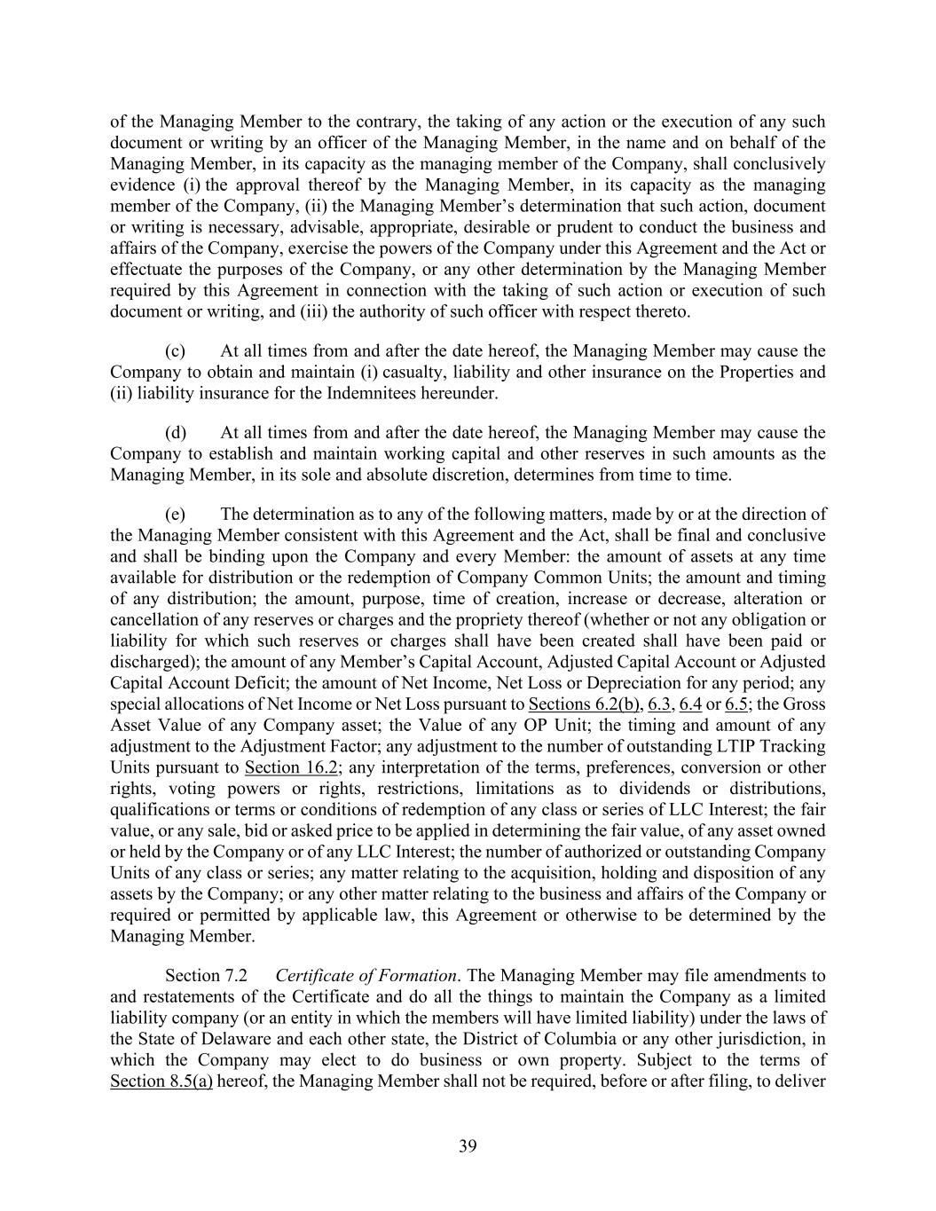 39 of the Managing Member to the contrary, the taking of any action or the execution of any such document or writing by an officer of the Managing Member, in the name and on behalf of the Managing Member, in its capacity as the managing member of the Company, shall conclusively evidence (i) the approval thereof by the Managing Member, in its capacity as the managing member of the Company, (ii) the Managing Member’s determination that such action, document or writing is necessary, advisable, appropriate, desirable or prudent to conduct the business and affairs of the Company, exercise the powers of the Company under this Agreement and the Act or effectuate the purposes of the Company, or any other determination by the Managing Member required by this Agreement in connection with the taking of such action or execution of such document or writing, and (iii) the authority of such officer with respect thereto. (c) At all times from and after the date hereof, the Managing Member may cause the Company to obtain and maintain (i) casualty, liability and other insurance on the Properties and (ii) liability insurance for the Indemnitees hereunder. (d) At all times from and after the date hereof, the Managing Member may cause the Company to establish and maintain working capital and other reserves in such amounts as the Managing Member, in its sole and absolute discretion, determines from time to time. (e) The determination as to any of the following matters, made by or at the direction of the Managing Member consistent with this Agreement and the Act, shall be final and conclusive and shall be binding upon the Company and every Member: the amount of assets at any time available for distribution or the redemption of Company Common Units; the amount and timing of any distribution; the amount, purpose, time of creation, increase or decrease, alteration or cancellation of any reserves or charges and the propriety thereof (whether or not any obligation or liability for which such reserves or charges shall have been created shall have been paid or discharged); the amount of any Member’s Capital Account, Adjusted Capital Account or Adjusted Capital Account Deficit; the amount of Net Income, Net Loss or Depreciation for any period; any special allocations of Net Income or Net Loss pursuant to Sections 6.2(b), 6.3, 6.4 or 6.5; the Gross Asset Value of any Company asset; the Value of any OP Unit; the timing and amount of any adjustment to the Adjustment Factor; any adjustment to the number of outstanding LTIP Tracking Units pursuant to Section 16.2; any interpretation of the terms, preferences, conversion or other rights, voting powers or rights, restrictions, limitations as to dividends or distributions, qualifications or terms or conditions of redemption of any class or series of LLC Interest; the fair value, or any sale, bid or asked price to be applied in determining the fair value, of any asset owned or held by the Company or of any LLC Interest; the number of authorized or outstanding Company Units of any class or series; any matter relating to the acquisition, holding and disposition of any assets by the Company; or any other matter relating to the business and affairs of the Company or required or permitted by applicable law, this Agreement or otherwise to be determined by the Managing Member. Section 7.2 Certificate of Formation. The Managing Member may file amendments to and restatements of the Certificate and do all the things to maintain the Company as a limited liability company (or an entity in which the members will have limited liability) under the laws of the State of Delaware and each other state, the District of Columbia or any other jurisdiction, in which the Company may elect to do business or own property. Subject to the terms of Section 8.5(a) hereof, the Managing Member shall not be required, before or after filing, to deliver