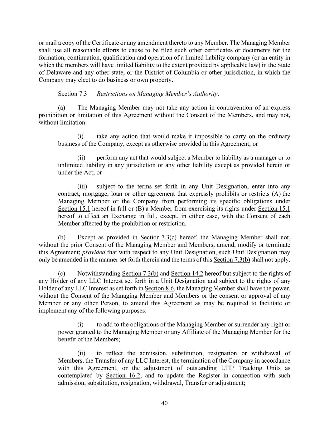 40 or mail a copy of the Certificate or any amendment thereto to any Member. The Managing Member shall use all reasonable efforts to cause to be filed such other certificates or documents for the formation, continuation, qualification and operation of a limited liability company (or an entity in which the members will have limited liability to the extent provided by applicable law) in the State of Delaware and any other state, or the District of Columbia or other jurisdiction, in which the Company may elect to do business or own property. Section 7.3 Restrictions on Managing Member’s Authority. (a) The Managing Member may not take any action in contravention of an express prohibition or limitation of this Agreement without the Consent of the Members, and may not, without limitation: (i) take any action that would make it impossible to carry on the ordinary business of the Company, except as otherwise provided in this Agreement; or (ii) perform any act that would subject a Member to liability as a manager or to unlimited liability in any jurisdiction or any other liability except as provided herein or under the Act; or (iii) subject to the terms set forth in any Unit Designation, enter into any contract, mortgage, loan or other agreement that expressly prohibits or restricts (A) the Managing Member or the Company from performing its specific obligations under Section 15.1 hereof in full or (B) a Member from exercising its rights under Section 15.1 hereof to effect an Exchange in full, except, in either case, with the Consent of each Member affected by the prohibition or restriction. (b) Except as provided in Section 7.3(c) hereof, the Managing Member shall not, without the prior Consent of the Managing Member and Members, amend, modify or terminate this Agreement; provided that with respect to any Unit Designation, such Unit Designation may only be amended in the manner set forth therein and the terms of this Section 7.3(b) shall not apply. (c) Notwithstanding Section 7.3(b) and Section 14.2 hereof but subject to the rights of any Holder of any LLC Interest set forth in a Unit Designation and subject to the rights of any Holder of any LLC Interest as set forth in Section 8.6, the Managing Member shall have the power, without the Consent of the Managing Member and Members or the consent or approval of any Member or any other Person, to amend this Agreement as may be required to facilitate or implement any of the following purposes: (i) to add to the obligations of the Managing Member or surrender any right or power granted to the Managing Member or any Affiliate of the Managing Member for the benefit of the Members; (ii) to reflect the admission, substitution, resignation or withdrawal of Members, the Transfer of any LLC Interest, the termination of the Company in accordance with this Agreement, or the adjustment of outstanding LTIP Tracking Units as contemplated by Section 16.2, and to update the Register in connection with such admission, substitution, resignation, withdrawal, Transfer or adjustment;