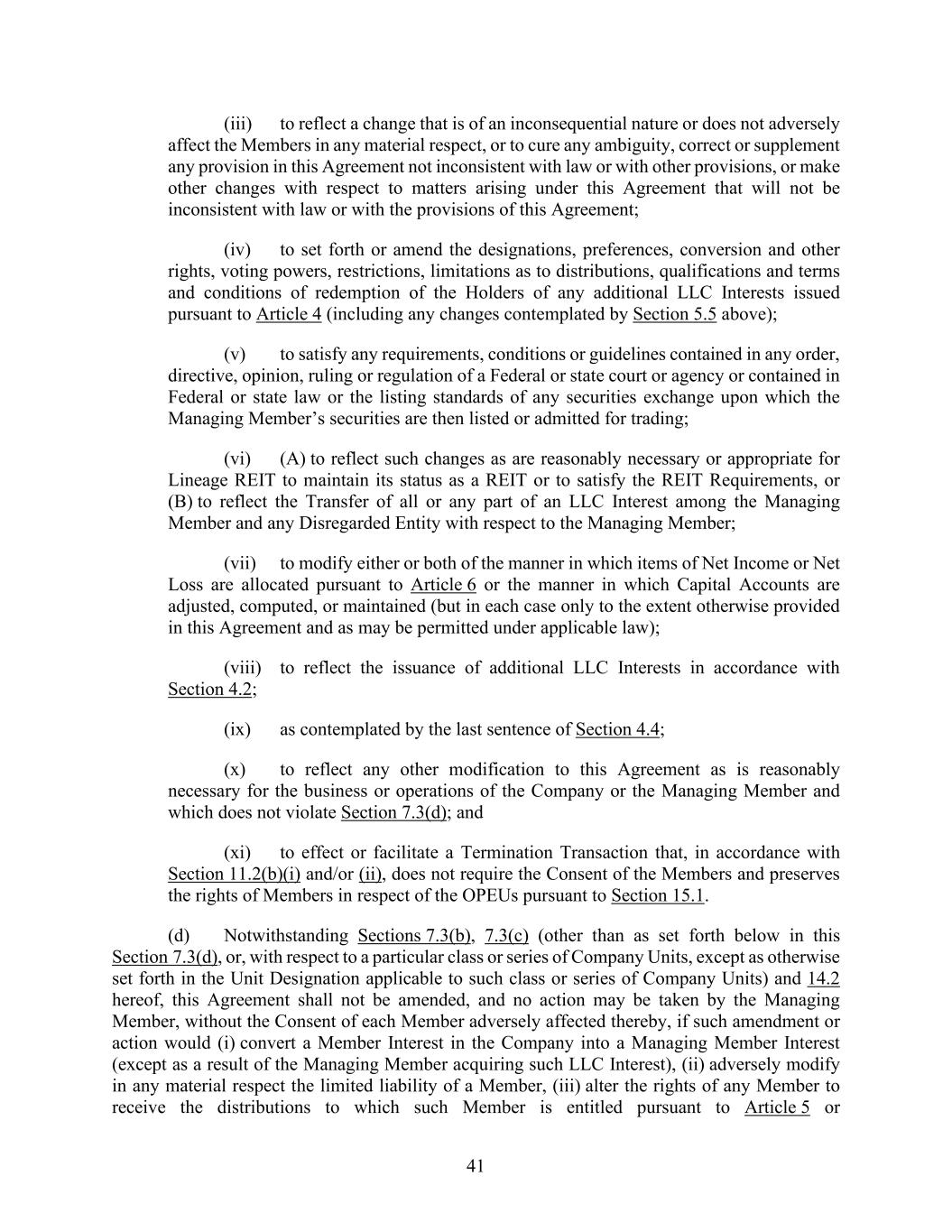 41 (iii) to reflect a change that is of an inconsequential nature or does not adversely affect the Members in any material respect, or to cure any ambiguity, correct or supplement any provision in this Agreement not inconsistent with law or with other provisions, or make other changes with respect to matters arising under this Agreement that will not be inconsistent with law or with the provisions of this Agreement; (iv) to set forth or amend the designations, preferences, conversion and other rights, voting powers, restrictions, limitations as to distributions, qualifications and terms and conditions of redemption of the Holders of any additional LLC Interests issued pursuant to Article 4 (including any changes contemplated by Section 5.5 above); (v) to satisfy any requirements, conditions or guidelines contained in any order, directive, opinion, ruling or regulation of a Federal or state court or agency or contained in Federal or state law or the listing standards of any securities exchange upon which the Managing Member’s securities are then listed or admitted for trading; (vi) (A) to reflect such changes as are reasonably necessary or appropriate for Lineage REIT to maintain its status as a REIT or to satisfy the REIT Requirements, or (B) to reflect the Transfer of all or any part of an LLC Interest among the Managing Member and any Disregarded Entity with respect to the Managing Member; (vii) to modify either or both of the manner in which items of Net Income or Net Loss are allocated pursuant to Article 6 or the manner in which Capital Accounts are adjusted, computed, or maintained (but in each case only to the extent otherwise provided in this Agreement and as may be permitted under applicable law); (viii) to reflect the issuance of additional LLC Interests in accordance with Section 4.2; (ix) as contemplated by the last sentence of Section 4.4; (x) to reflect any other modification to this Agreement as is reasonably necessary for the business or operations of the Company or the Managing Member and which does not violate Section 7.3(d); and (xi) to effect or facilitate a Termination Transaction that, in accordance with Section 11.2(b)(i) and/or (ii), does not require the Consent of the Members and preserves the rights of Members in respect of the OPEUs pursuant to Section 15.1. (d) Notwithstanding Sections 7.3(b), 7.3(c) (other than as set forth below in this Section 7.3(d), or, with respect to a particular class or series of Company Units, except as otherwise set forth in the Unit Designation applicable to such class or series of Company Units) and 14.2 hereof, this Agreement shall not be amended, and no action may be taken by the Managing Member, without the Consent of each Member adversely affected thereby, if such amendment or action would (i) convert a Member Interest in the Company into a Managing Member Interest (except as a result of the Managing Member acquiring such LLC Interest), (ii) adversely modify in any material respect the limited liability of a Member, (iii) alter the rights of any Member to receive the distributions to which such Member is entitled pursuant to Article 5 or
