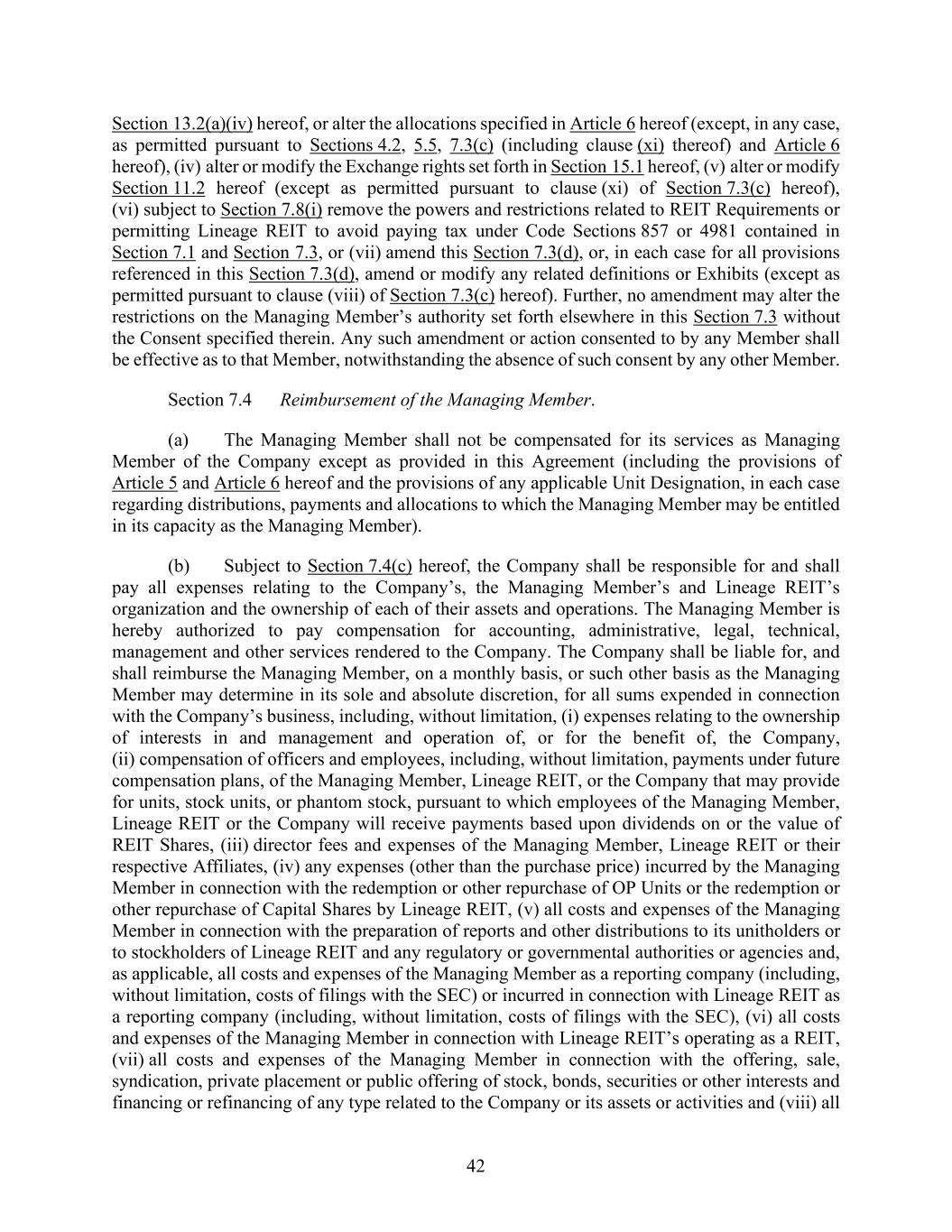 42 Section 13.2(a)(iv) hereof, or alter the allocations specified in Article 6 hereof (except, in any case, as permitted pursuant to Sections 4.2, 5.5, 7.3(c) (including clause (xi) thereof) and Article 6 hereof), (iv) alter or modify the Exchange rights set forth in Section 15.1 hereof, (v) alter or modify Section 11.2 hereof (except as permitted pursuant to clause (xi) of Section 7.3(c) hereof), (vi) subject to Section 7.8(i) remove the powers and restrictions related to REIT Requirements or permitting Lineage REIT to avoid paying tax under Code Sections 857 or 4981 contained in Section 7.1 and Section 7.3, or (vii) amend this Section 7.3(d), or, in each case for all provisions referenced in this Section 7.3(d), amend or modify any related definitions or Exhibits (except as permitted pursuant to clause (viii) of Section 7.3(c) hereof). Further, no amendment may alter the restrictions on the Managing Member’s authority set forth elsewhere in this Section 7.3 without the Consent specified therein. Any such amendment or action consented to by any Member shall be effective as to that Member, notwithstanding the absence of such consent by any other Member. Section 7.4 Reimbursement of the Managing Member. (a) The Managing Member shall not be compensated for its services as Managing Member of the Company except as provided in this Agreement (including the provisions of Article 5 and Article 6 hereof and the provisions of any applicable Unit Designation, in each case regarding distributions, payments and allocations to which the Managing Member may be entitled in its capacity as the Managing Member). (b) Subject to Section 7.4(c) hereof, the Company shall be responsible for and shall pay all expenses relating to the Company’s, the Managing Member’s and Lineage REIT’s organization and the ownership of each of their assets and operations. The Managing Member is hereby authorized to pay compensation for accounting, administrative, legal, technical, management and other services rendered to the Company. The Company shall be liable for, and shall reimburse the Managing Member, on a monthly basis, or such other basis as the Managing Member may determine in its sole and absolute discretion, for all sums expended in connection with the Company’s business, including, without limitation, (i) expenses relating to the ownership of interests in and management and operation of, or for the benefit of, the Company, (ii) compensation of officers and employees, including, without limitation, payments under future compensation plans, of the Managing Member, Lineage REIT, or the Company that may provide for units, stock units, or phantom stock, pursuant to which employees of the Managing Member, Lineage REIT or the Company will receive payments based upon dividends on or the value of REIT Shares, (iii) director fees and expenses of the Managing Member, Lineage REIT or their respective Affiliates, (iv) any expenses (other than the purchase price) incurred by the Managing Member in connection with the redemption or other repurchase of OP Units or the redemption or other repurchase of Capital Shares by Lineage REIT, (v) all costs and expenses of the Managing Member in connection with the preparation of reports and other distributions to its unitholders or to stockholders of Lineage REIT and any regulatory or governmental authorities or agencies and, as applicable, all costs and expenses of the Managing Member as a reporting company (including, without limitation, costs of filings with the SEC) or incurred in connection with Lineage REIT as a reporting company (including, without limitation, costs of filings with the SEC), (vi) all costs and expenses of the Managing Member in connection with Lineage REIT’s operating as a REIT, (vii) all costs and expenses of the Managing Member in connection with the offering, sale, syndication, private placement or public offering of stock, bonds, securities or other interests and financing or refinancing of any type related to the Company or its assets or activities and (viii) all