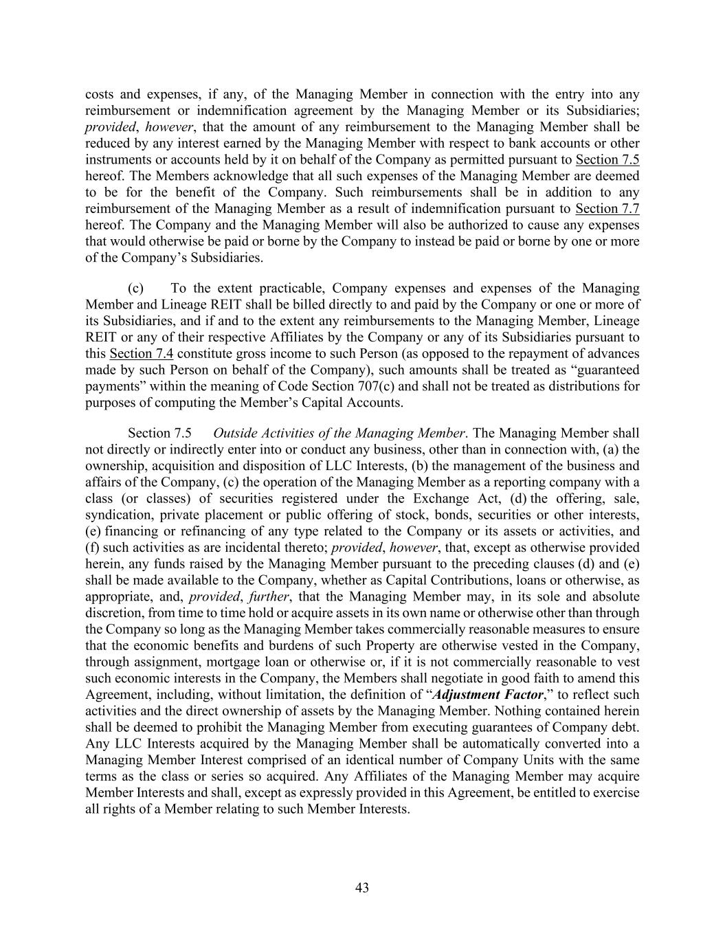 43 costs and expenses, if any, of the Managing Member in connection with the entry into any reimbursement or indemnification agreement by the Managing Member or its Subsidiaries; provided, however, that the amount of any reimbursement to the Managing Member shall be reduced by any interest earned by the Managing Member with respect to bank accounts or other instruments or accounts held by it on behalf of the Company as permitted pursuant to Section 7.5 hereof. The Members acknowledge that all such expenses of the Managing Member are deemed to be for the benefit of the Company. Such reimbursements shall be in addition to any reimbursement of the Managing Member as a result of indemnification pursuant to Section 7.7 hereof. The Company and the Managing Member will also be authorized to cause any expenses that would otherwise be paid or borne by the Company to instead be paid or borne by one or more of the Company’s Subsidiaries. (c) To the extent practicable, Company expenses and expenses of the Managing Member and Lineage REIT shall be billed directly to and paid by the Company or one or more of its Subsidiaries, and if and to the extent any reimbursements to the Managing Member, Lineage REIT or any of their respective Affiliates by the Company or any of its Subsidiaries pursuant to this Section 7.4 constitute gross income to such Person (as opposed to the repayment of advances made by such Person on behalf of the Company), such amounts shall be treated as “guaranteed payments” within the meaning of Code Section 707(c) and shall not be treated as distributions for purposes of computing the Member’s Capital Accounts. Section 7.5 Outside Activities of the Managing Member. The Managing Member shall not directly or indirectly enter into or conduct any business, other than in connection with, (a) the ownership, acquisition and disposition of LLC Interests, (b) the management of the business and affairs of the Company, (c) the operation of the Managing Member as a reporting company with a class (or classes) of securities registered under the Exchange Act, (d) the offering, sale, syndication, private placement or public offering of stock, bonds, securities or other interests, (e) financing or refinancing of any type related to the Company or its assets or activities, and (f) such activities as are incidental thereto; provided, however, that, except as otherwise provided herein, any funds raised by the Managing Member pursuant to the preceding clauses (d) and (e) shall be made available to the Company, whether as Capital Contributions, loans or otherwise, as appropriate, and, provided, further, that the Managing Member may, in its sole and absolute discretion, from time to time hold or acquire assets in its own name or otherwise other than through the Company so long as the Managing Member takes commercially reasonable measures to ensure that the economic benefits and burdens of such Property are otherwise vested in the Company, through assignment, mortgage loan or otherwise or, if it is not commercially reasonable to vest such economic interests in the Company, the Members shall negotiate in good faith to amend this Agreement, including, without limitation, the definition of “Adjustment Factor,” to reflect such activities and the direct ownership of assets by the Managing Member. Nothing contained herein shall be deemed to prohibit the Managing Member from executing guarantees of Company debt. Any LLC Interests acquired by the Managing Member shall be automatically converted into a Managing Member Interest comprised of an identical number of Company Units with the same terms as the class or series so acquired. Any Affiliates of the Managing Member may acquire Member Interests and shall, except as expressly provided in this Agreement, be entitled to exercise all rights of a Member relating to such Member Interests.