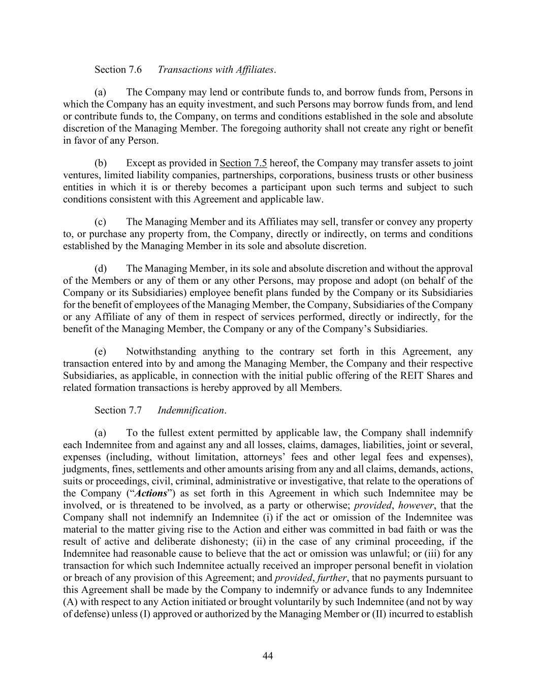 44 Section 7.6 Transactions with Affiliates. (a) The Company may lend or contribute funds to, and borrow funds from, Persons in which the Company has an equity investment, and such Persons may borrow funds from, and lend or contribute funds to, the Company, on terms and conditions established in the sole and absolute discretion of the Managing Member. The foregoing authority shall not create any right or benefit in favor of any Person. (b) Except as provided in Section 7.5 hereof, the Company may transfer assets to joint ventures, limited liability companies, partnerships, corporations, business trusts or other business entities in which it is or thereby becomes a participant upon such terms and subject to such conditions consistent with this Agreement and applicable law. (c) The Managing Member and its Affiliates may sell, transfer or convey any property to, or purchase any property from, the Company, directly or indirectly, on terms and conditions established by the Managing Member in its sole and absolute discretion. (d) The Managing Member, in its sole and absolute discretion and without the approval of the Members or any of them or any other Persons, may propose and adopt (on behalf of the Company or its Subsidiaries) employee benefit plans funded by the Company or its Subsidiaries for the benefit of employees of the Managing Member, the Company, Subsidiaries of the Company or any Affiliate of any of them in respect of services performed, directly or indirectly, for the benefit of the Managing Member, the Company or any of the Company’s Subsidiaries. (e) Notwithstanding anything to the contrary set forth in this Agreement, any transaction entered into by and among the Managing Member, the Company and their respective Subsidiaries, as applicable, in connection with the initial public offering of the REIT Shares and related formation transactions is hereby approved by all Members. Section 7.7 Indemnification. (a) To the fullest extent permitted by applicable law, the Company shall indemnify each Indemnitee from and against any and all losses, claims, damages, liabilities, joint or several, expenses (including, without limitation, attorneys’ fees and other legal fees and expenses), judgments, fines, settlements and other amounts arising from any and all claims, demands, actions, suits or proceedings, civil, criminal, administrative or investigative, that relate to the operations of the Company (“Actions”) as set forth in this Agreement in which such Indemnitee may be involved, or is threatened to be involved, as a party or otherwise; provided, however, that the Company shall not indemnify an Indemnitee (i) if the act or omission of the Indemnitee was material to the matter giving rise to the Action and either was committed in bad faith or was the result of active and deliberate dishonesty; (ii) in the case of any criminal proceeding, if the Indemnitee had reasonable cause to believe that the act or omission was unlawful; or (iii) for any transaction for which such Indemnitee actually received an improper personal benefit in violation or breach of any provision of this Agreement; and provided, further, that no payments pursuant to this Agreement shall be made by the Company to indemnify or advance funds to any Indemnitee (A) with respect to any Action initiated or brought voluntarily by such Indemnitee (and not by way of defense) unless (I) approved or authorized by the Managing Member or (II) incurred to establish