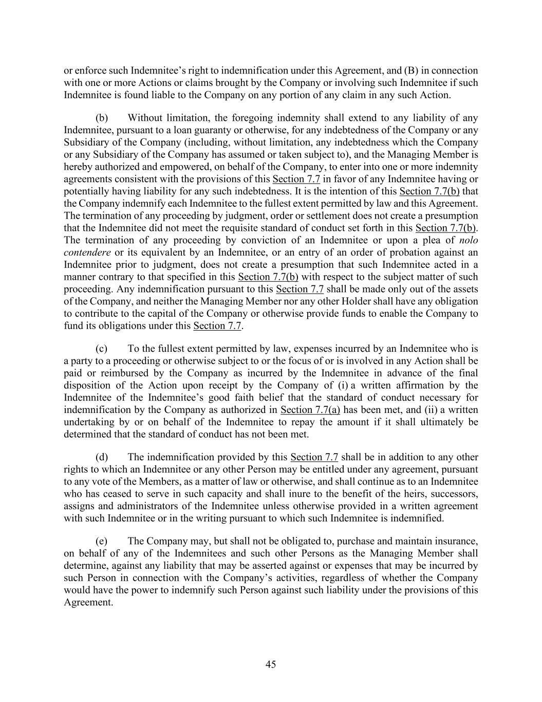 45 or enforce such Indemnitee’s right to indemnification under this Agreement, and (B) in connection with one or more Actions or claims brought by the Company or involving such Indemnitee if such Indemnitee is found liable to the Company on any portion of any claim in any such Action. (b) Without limitation, the foregoing indemnity shall extend to any liability of any Indemnitee, pursuant to a loan guaranty or otherwise, for any indebtedness of the Company or any Subsidiary of the Company (including, without limitation, any indebtedness which the Company or any Subsidiary of the Company has assumed or taken subject to), and the Managing Member is hereby authorized and empowered, on behalf of the Company, to enter into one or more indemnity agreements consistent with the provisions of this Section 7.7 in favor of any Indemnitee having or potentially having liability for any such indebtedness. It is the intention of this Section 7.7(b) that the Company indemnify each Indemnitee to the fullest extent permitted by law and this Agreement. The termination of any proceeding by judgment, order or settlement does not create a presumption that the Indemnitee did not meet the requisite standard of conduct set forth in this Section 7.7(b). The termination of any proceeding by conviction of an Indemnitee or upon a plea of nolo contendere or its equivalent by an Indemnitee, or an entry of an order of probation against an Indemnitee prior to judgment, does not create a presumption that such Indemnitee acted in a manner contrary to that specified in this Section 7.7(b) with respect to the subject matter of such proceeding. Any indemnification pursuant to this Section 7.7 shall be made only out of the assets of the Company, and neither the Managing Member nor any other Holder shall have any obligation to contribute to the capital of the Company or otherwise provide funds to enable the Company to fund its obligations under this Section 7.7. (c) To the fullest extent permitted by law, expenses incurred by an Indemnitee who is a party to a proceeding or otherwise subject to or the focus of or is involved in any Action shall be paid or reimbursed by the Company as incurred by the Indemnitee in advance of the final disposition of the Action upon receipt by the Company of (i) a written affirmation by the Indemnitee of the Indemnitee’s good faith belief that the standard of conduct necessary for indemnification by the Company as authorized in Section 7.7(a) has been met, and (ii) a written undertaking by or on behalf of the Indemnitee to repay the amount if it shall ultimately be determined that the standard of conduct has not been met. (d) The indemnification provided by this Section 7.7 shall be in addition to any other rights to which an Indemnitee or any other Person may be entitled under any agreement, pursuant to any vote of the Members, as a matter of law or otherwise, and shall continue as to an Indemnitee who has ceased to serve in such capacity and shall inure to the benefit of the heirs, successors, assigns and administrators of the Indemnitee unless otherwise provided in a written agreement with such Indemnitee or in the writing pursuant to which such Indemnitee is indemnified. (e) The Company may, but shall not be obligated to, purchase and maintain insurance, on behalf of any of the Indemnitees and such other Persons as the Managing Member shall determine, against any liability that may be asserted against or expenses that may be incurred by such Person in connection with the Company’s activities, regardless of whether the Company would have the power to indemnify such Person against such liability under the provisions of this Agreement.