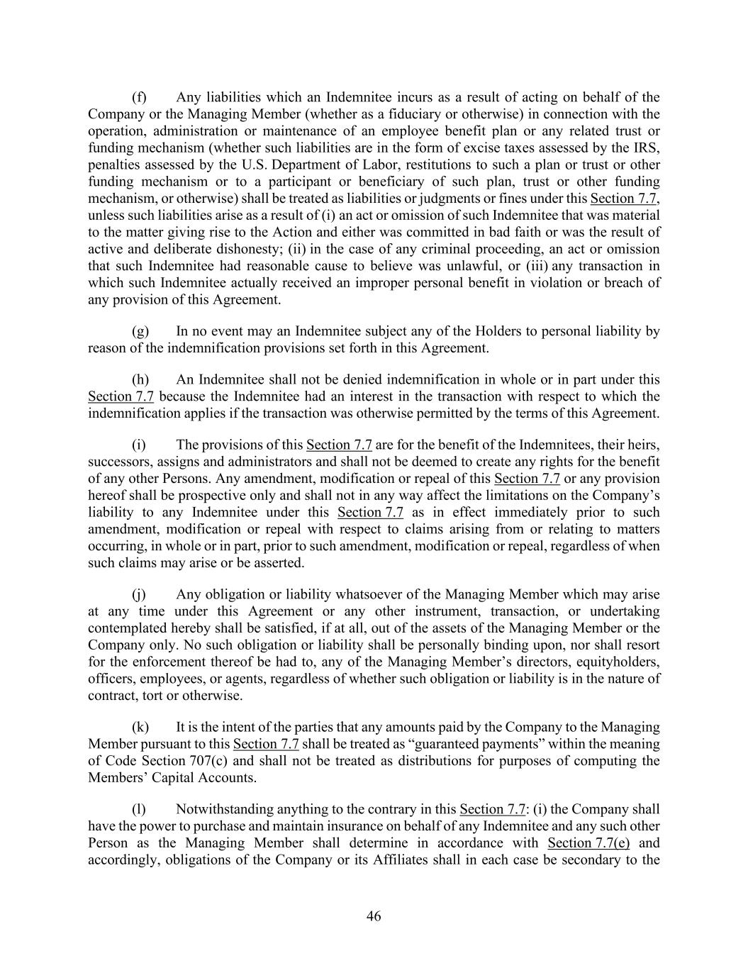46 (f) Any liabilities which an Indemnitee incurs as a result of acting on behalf of the Company or the Managing Member (whether as a fiduciary or otherwise) in connection with the operation, administration or maintenance of an employee benefit plan or any related trust or funding mechanism (whether such liabilities are in the form of excise taxes assessed by the IRS, penalties assessed by the U.S. Department of Labor, restitutions to such a plan or trust or other funding mechanism or to a participant or beneficiary of such plan, trust or other funding mechanism, or otherwise) shall be treated as liabilities or judgments or fines under this Section 7.7, unless such liabilities arise as a result of (i) an act or omission of such Indemnitee that was material to the matter giving rise to the Action and either was committed in bad faith or was the result of active and deliberate dishonesty; (ii) in the case of any criminal proceeding, an act or omission that such Indemnitee had reasonable cause to believe was unlawful, or (iii) any transaction in which such Indemnitee actually received an improper personal benefit in violation or breach of any provision of this Agreement. (g) In no event may an Indemnitee subject any of the Holders to personal liability by reason of the indemnification provisions set forth in this Agreement. (h) An Indemnitee shall not be denied indemnification in whole or in part under this Section 7.7 because the Indemnitee had an interest in the transaction with respect to which the indemnification applies if the transaction was otherwise permitted by the terms of this Agreement. (i) The provisions of this Section 7.7 are for the benefit of the Indemnitees, their heirs, successors, assigns and administrators and shall not be deemed to create any rights for the benefit of any other Persons. Any amendment, modification or repeal of this Section 7.7 or any provision hereof shall be prospective only and shall not in any way affect the limitations on the Company’s liability to any Indemnitee under this Section 7.7 as in effect immediately prior to such amendment, modification or repeal with respect to claims arising from or relating to matters occurring, in whole or in part, prior to such amendment, modification or repeal, regardless of when such claims may arise or be asserted. (j) Any obligation or liability whatsoever of the Managing Member which may arise at any time under this Agreement or any other instrument, transaction, or undertaking contemplated hereby shall be satisfied, if at all, out of the assets of the Managing Member or the Company only. No such obligation or liability shall be personally binding upon, nor shall resort for the enforcement thereof be had to, any of the Managing Member’s directors, equityholders, officers, employees, or agents, regardless of whether such obligation or liability is in the nature of contract, tort or otherwise. (k) It is the intent of the parties that any amounts paid by the Company to the Managing Member pursuant to this Section 7.7 shall be treated as “guaranteed payments” within the meaning of Code Section 707(c) and shall not be treated as distributions for purposes of computing the Members’ Capital Accounts. (l) Notwithstanding anything to the contrary in this Section 7.7: (i) the Company shall have the power to purchase and maintain insurance on behalf of any Indemnitee and any such other Person as the Managing Member shall determine in accordance with Section 7.7(e) and accordingly, obligations of the Company or its Affiliates shall in each case be secondary to the