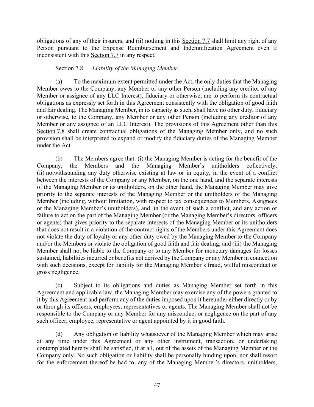 47 obligations of any of their insurers; and (ii) nothing in this Section 7.7 shall limit any right of any Person pursuant to the Expense Reimbursement and Indemnification Agreement even if inconsistent with this Section 7.7 in any respect. Section 7.8 Liability of the Managing Member. (a) To the maximum extent permitted under the Act, the only duties that the Managing Member owes to the Company, any Member or any other Person (including any creditor of any Member or assignee of any LLC Interest), fiduciary or otherwise, are to perform its contractual obligations as expressly set forth in this Agreement consistently with the obligation of good faith and fair dealing. The Managing Member, in its capacity as such, shall have no other duty, fiduciary or otherwise, to the Company, any Member or any other Person (including any creditor of any Member or any assignee of an LLC Interest). The provisions of this Agreement other than this Section 7.8 shall create contractual obligations of the Managing Member only, and no such provision shall be interpreted to expand or modify the fiduciary duties of the Managing Member under the Act. (b) The Members agree that: (i) the Managing Member is acting for the benefit of the Company, the Members and the Managing Member’s unitholders collectively; (ii) notwithstanding any duty otherwise existing at law or in equity, in the event of a conflict between the interests of the Company or any Member, on the one hand, and the separate interests of the Managing Member or its unitholders, on the other hand, the Managing Member may give priority to the separate interests of the Managing Member or the unitholders of the Managing Member (including, without limitation, with respect to tax consequences to Members, Assignees or the Managing Member’s unitholders), and, in the event of such a conflict, and any action or failure to act on the part of the Managing Member (or the Managing Member’s directors, officers or agents) that gives priority to the separate interests of the Managing Member or its unitholders that does not result in a violation of the contract rights of the Members under this Agreement does not violate the duty of loyalty or any other duty owed by the Managing Member to the Company and/or the Members or violate the obligation of good faith and fair dealing; and (iii) the Managing Member shall not be liable to the Company or to any Member for monetary damages for losses sustained, liabilities incurred or benefits not derived by the Company or any Member in connection with such decisions, except for liability for the Managing Member’s fraud, willful misconduct or gross negligence. (c) Subject to its obligations and duties as Managing Member set forth in this Agreement and applicable law, the Managing Member may exercise any of the powers granted to it by this Agreement and perform any of the duties imposed upon it hereunder either directly or by or through its officers, employees, representatives or agents. The Managing Member shall not be responsible to the Company or any Member for any misconduct or negligence on the part of any such officer, employee, representative or agent appointed by it in good faith. (d) Any obligation or liability whatsoever of the Managing Member which may arise at any time under this Agreement or any other instrument, transaction, or undertaking contemplated hereby shall be satisfied, if at all, out of the assets of the Managing Member or the Company only. No such obligation or liability shall be personally binding upon, nor shall resort for the enforcement thereof be had to, any of the Managing Member’s directors, unitholders,