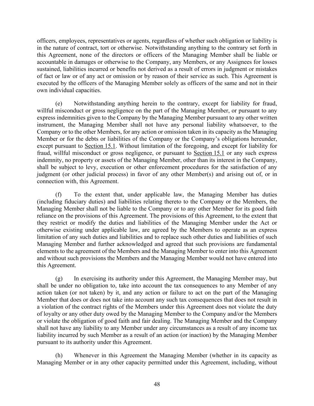 48 officers, employees, representatives or agents, regardless of whether such obligation or liability is in the nature of contract, tort or otherwise. Notwithstanding anything to the contrary set forth in this Agreement, none of the directors or officers of the Managing Member shall be liable or accountable in damages or otherwise to the Company, any Members, or any Assignees for losses sustained, liabilities incurred or benefits not derived as a result of errors in judgment or mistakes of fact or law or of any act or omission or by reason of their service as such. This Agreement is executed by the officers of the Managing Member solely as officers of the same and not in their own individual capacities. (e) Notwithstanding anything herein to the contrary, except for liability for fraud, willful misconduct or gross negligence on the part of the Managing Member, or pursuant to any express indemnities given to the Company by the Managing Member pursuant to any other written instrument, the Managing Member shall not have any personal liability whatsoever, to the Company or to the other Members, for any action or omission taken in its capacity as the Managing Member or for the debts or liabilities of the Company or the Company’s obligations hereunder, except pursuant to Section 15.1. Without limitation of the foregoing, and except for liability for fraud, willful misconduct or gross negligence, or pursuant to Section 15.1 or any such express indemnity, no property or assets of the Managing Member, other than its interest in the Company, shall be subject to levy, execution or other enforcement procedures for the satisfaction of any judgment (or other judicial process) in favor of any other Member(s) and arising out of, or in connection with, this Agreement. (f) To the extent that, under applicable law, the Managing Member has duties (including fiduciary duties) and liabilities relating thereto to the Company or the Members, the Managing Member shall not be liable to the Company or to any other Member for its good faith reliance on the provisions of this Agreement. The provisions of this Agreement, to the extent that they restrict or modify the duties and liabilities of the Managing Member under the Act or otherwise existing under applicable law, are agreed by the Members to operate as an express limitation of any such duties and liabilities and to replace such other duties and liabilities of such Managing Member and further acknowledged and agreed that such provisions are fundamental elements to the agreement of the Members and the Managing Member to enter into this Agreement and without such provisions the Members and the Managing Member would not have entered into this Agreement. (g) In exercising its authority under this Agreement, the Managing Member may, but shall be under no obligation to, take into account the tax consequences to any Member of any action taken (or not taken) by it, and any action or failure to act on the part of the Managing Member that does or does not take into account any such tax consequences that does not result in a violation of the contract rights of the Members under this Agreement does not violate the duty of loyalty or any other duty owed by the Managing Member to the Company and/or the Members or violate the obligation of good faith and fair dealing. The Managing Member and the Company shall not have any liability to any Member under any circumstances as a result of any income tax liability incurred by such Member as a result of an action (or inaction) by the Managing Member pursuant to its authority under this Agreement. (h) Whenever in this Agreement the Managing Member (whether in its capacity as Managing Member or in any other capacity permitted under this Agreement, including, without