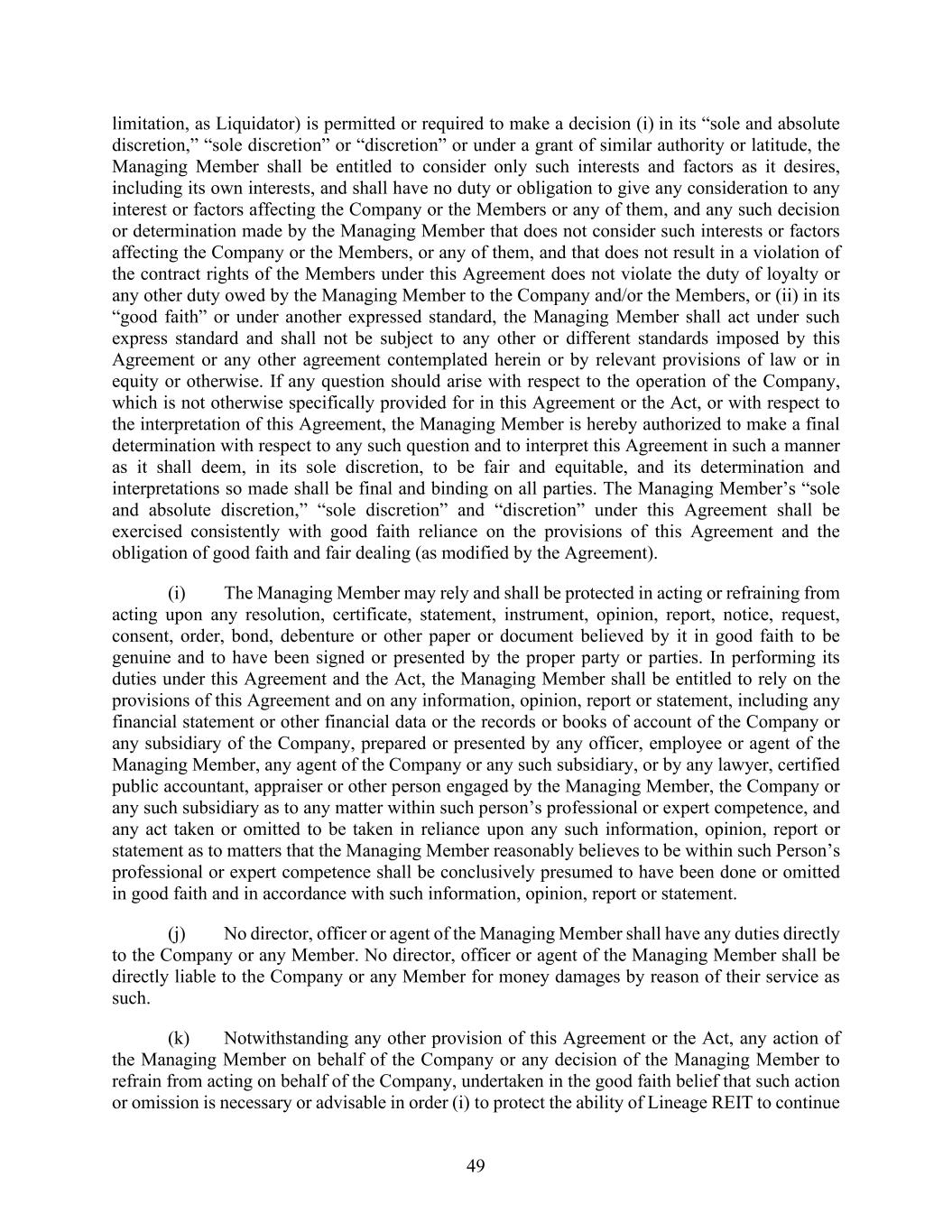 49 limitation, as Liquidator) is permitted or required to make a decision (i) in its “sole and absolute discretion,” “sole discretion” or “discretion” or under a grant of similar authority or latitude, the Managing Member shall be entitled to consider only such interests and factors as it desires, including its own interests, and shall have no duty or obligation to give any consideration to any interest or factors affecting the Company or the Members or any of them, and any such decision or determination made by the Managing Member that does not consider such interests or factors affecting the Company or the Members, or any of them, and that does not result in a violation of the contract rights of the Members under this Agreement does not violate the duty of loyalty or any other duty owed by the Managing Member to the Company and/or the Members, or (ii) in its “good faith” or under another expressed standard, the Managing Member shall act under such express standard and shall not be subject to any other or different standards imposed by this Agreement or any other agreement contemplated herein or by relevant provisions of law or in equity or otherwise. If any question should arise with respect to the operation of the Company, which is not otherwise specifically provided for in this Agreement or the Act, or with respect to the interpretation of this Agreement, the Managing Member is hereby authorized to make a final determination with respect to any such question and to interpret this Agreement in such a manner as it shall deem, in its sole discretion, to be fair and equitable, and its determination and interpretations so made shall be final and binding on all parties. The Managing Member’s “sole and absolute discretion,” “sole discretion” and “discretion” under this Agreement shall be exercised consistently with good faith reliance on the provisions of this Agreement and the obligation of good faith and fair dealing (as modified by the Agreement). (i) The Managing Member may rely and shall be protected in acting or refraining from acting upon any resolution, certificate, statement, instrument, opinion, report, notice, request, consent, order, bond, debenture or other paper or document believed by it in good faith to be genuine and to have been signed or presented by the proper party or parties. In performing its duties under this Agreement and the Act, the Managing Member shall be entitled to rely on the provisions of this Agreement and on any information, opinion, report or statement, including any financial statement or other financial data or the records or books of account of the Company or any subsidiary of the Company, prepared or presented by any officer, employee or agent of the Managing Member, any agent of the Company or any such subsidiary, or by any lawyer, certified public accountant, appraiser or other person engaged by the Managing Member, the Company or any such subsidiary as to any matter within such person’s professional or expert competence, and any act taken or omitted to be taken in reliance upon any such information, opinion, report or statement as to matters that the Managing Member reasonably believes to be within such Person’s professional or expert competence shall be conclusively presumed to have been done or omitted in good faith and in accordance with such information, opinion, report or statement. (j) No director, officer or agent of the Managing Member shall have any duties directly to the Company or any Member. No director, officer or agent of the Managing Member shall be directly liable to the Company or any Member for money damages by reason of their service as such. (k) Notwithstanding any other provision of this Agreement or the Act, any action of the Managing Member on behalf of the Company or any decision of the Managing Member to refrain from acting on behalf of the Company, undertaken in the good faith belief that such action or omission is necessary or advisable in order (i) to protect the ability of Lineage REIT to continue