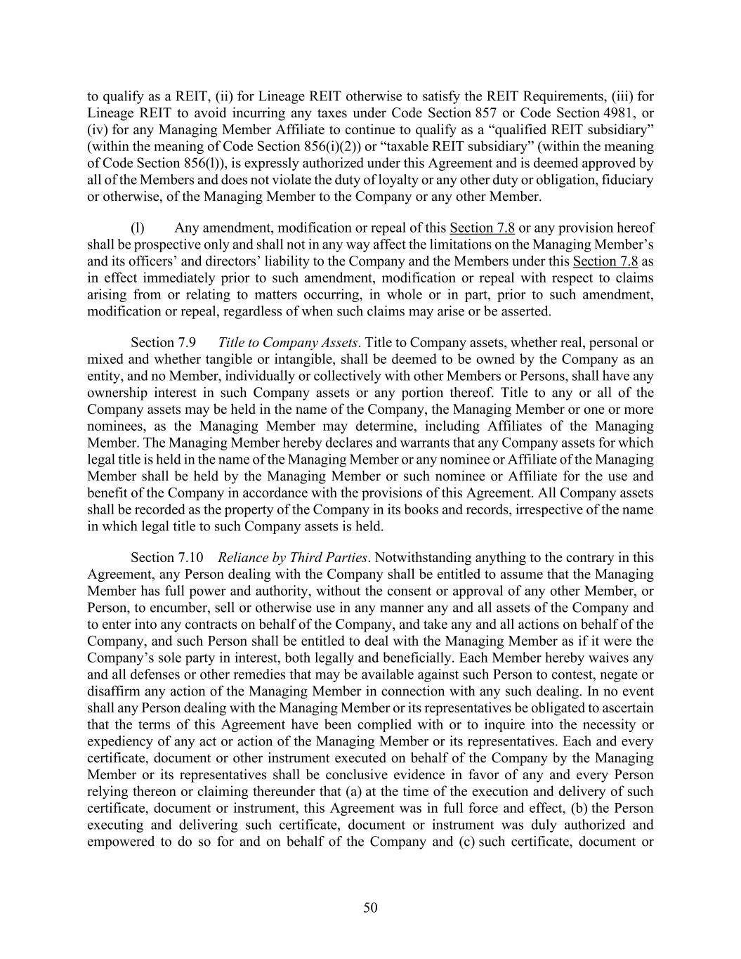 50 to qualify as a REIT, (ii) for Lineage REIT otherwise to satisfy the REIT Requirements, (iii) for Lineage REIT to avoid incurring any taxes under Code Section 857 or Code Section 4981, or (iv) for any Managing Member Affiliate to continue to qualify as a “qualified REIT subsidiary” (within the meaning of Code Section 856(i)(2)) or “taxable REIT subsidiary” (within the meaning of Code Section 856(l)), is expressly authorized under this Agreement and is deemed approved by all of the Members and does not violate the duty of loyalty or any other duty or obligation, fiduciary or otherwise, of the Managing Member to the Company or any other Member. (l) Any amendment, modification or repeal of this Section 7.8 or any provision hereof shall be prospective only and shall not in any way affect the limitations on the Managing Member’s and its officers’ and directors’ liability to the Company and the Members under this Section 7.8 as in effect immediately prior to such amendment, modification or repeal with respect to claims arising from or relating to matters occurring, in whole or in part, prior to such amendment, modification or repeal, regardless of when such claims may arise or be asserted. Section 7.9 Title to Company Assets. Title to Company assets, whether real, personal or mixed and whether tangible or intangible, shall be deemed to be owned by the Company as an entity, and no Member, individually or collectively with other Members or Persons, shall have any ownership interest in such Company assets or any portion thereof. Title to any or all of the Company assets may be held in the name of the Company, the Managing Member or one or more nominees, as the Managing Member may determine, including Affiliates of the Managing Member. The Managing Member hereby declares and warrants that any Company assets for which legal title is held in the name of the Managing Member or any nominee or Affiliate of the Managing Member shall be held by the Managing Member or such nominee or Affiliate for the use and benefit of the Company in accordance with the provisions of this Agreement. All Company assets shall be recorded as the property of the Company in its books and records, irrespective of the name in which legal title to such Company assets is held. Section 7.10 Reliance by Third Parties. Notwithstanding anything to the contrary in this Agreement, any Person dealing with the Company shall be entitled to assume that the Managing Member has full power and authority, without the consent or approval of any other Member, or Person, to encumber, sell or otherwise use in any manner any and all assets of the Company and to enter into any contracts on behalf of the Company, and take any and all actions on behalf of the Company, and such Person shall be entitled to deal with the Managing Member as if it were the Company’s sole party in interest, both legally and beneficially. Each Member hereby waives any and all defenses or other remedies that may be available against such Person to contest, negate or disaffirm any action of the Managing Member in connection with any such dealing. In no event shall any Person dealing with the Managing Member or its representatives be obligated to ascertain that the terms of this Agreement have been complied with or to inquire into the necessity or expediency of any act or action of the Managing Member or its representatives. Each and every certificate, document or other instrument executed on behalf of the Company by the Managing Member or its representatives shall be conclusive evidence in favor of any and every Person relying thereon or claiming thereunder that (a) at the time of the execution and delivery of such certificate, document or instrument, this Agreement was in full force and effect, (b) the Person executing and delivering such certificate, document or instrument was duly authorized and empowered to do so for and on behalf of the Company and (c) such certificate, document or
