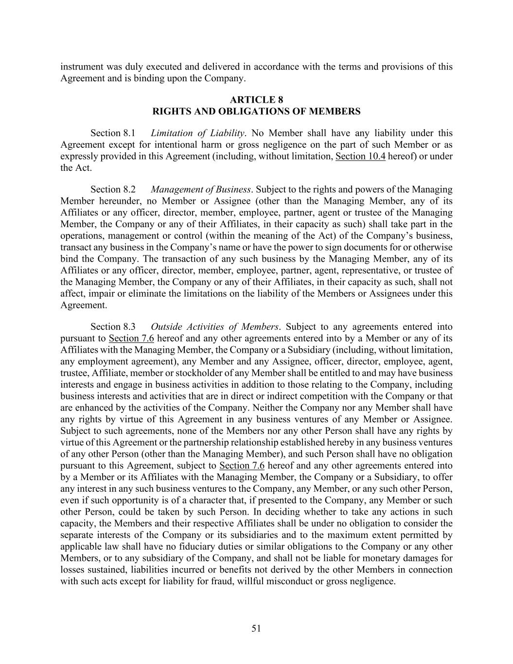 51 instrument was duly executed and delivered in accordance with the terms and provisions of this Agreement and is binding upon the Company. ARTICLE 8 RIGHTS AND OBLIGATIONS OF MEMBERS Section 8.1 Limitation of Liability. No Member shall have any liability under this Agreement except for intentional harm or gross negligence on the part of such Member or as expressly provided in this Agreement (including, without limitation, Section 10.4 hereof) or under the Act. Section 8.2 Management of Business. Subject to the rights and powers of the Managing Member hereunder, no Member or Assignee (other than the Managing Member, any of its Affiliates or any officer, director, member, employee, partner, agent or trustee of the Managing Member, the Company or any of their Affiliates, in their capacity as such) shall take part in the operations, management or control (within the meaning of the Act) of the Company’s business, transact any business in the Company’s name or have the power to sign documents for or otherwise bind the Company. The transaction of any such business by the Managing Member, any of its Affiliates or any officer, director, member, employee, partner, agent, representative, or trustee of the Managing Member, the Company or any of their Affiliates, in their capacity as such, shall not affect, impair or eliminate the limitations on the liability of the Members or Assignees under this Agreement. Section 8.3 Outside Activities of Members. Subject to any agreements entered into pursuant to Section 7.6 hereof and any other agreements entered into by a Member or any of its Affiliates with the Managing Member, the Company or a Subsidiary (including, without limitation, any employment agreement), any Member and any Assignee, officer, director, employee, agent, trustee, Affiliate, member or stockholder of any Member shall be entitled to and may have business interests and engage in business activities in addition to those relating to the Company, including business interests and activities that are in direct or indirect competition with the Company or that are enhanced by the activities of the Company. Neither the Company nor any Member shall have any rights by virtue of this Agreement in any business ventures of any Member or Assignee. Subject to such agreements, none of the Members nor any other Person shall have any rights by virtue of this Agreement or the partnership relationship established hereby in any business ventures of any other Person (other than the Managing Member), and such Person shall have no obligation pursuant to this Agreement, subject to Section 7.6 hereof and any other agreements entered into by a Member or its Affiliates with the Managing Member, the Company or a Subsidiary, to offer any interest in any such business ventures to the Company, any Member, or any such other Person, even if such opportunity is of a character that, if presented to the Company, any Member or such other Person, could be taken by such Person. In deciding whether to take any actions in such capacity, the Members and their respective Affiliates shall be under no obligation to consider the separate interests of the Company or its subsidiaries and to the maximum extent permitted by applicable law shall have no fiduciary duties or similar obligations to the Company or any other Members, or to any subsidiary of the Company, and shall not be liable for monetary damages for losses sustained, liabilities incurred or benefits not derived by the other Members in connection with such acts except for liability for fraud, willful misconduct or gross negligence.