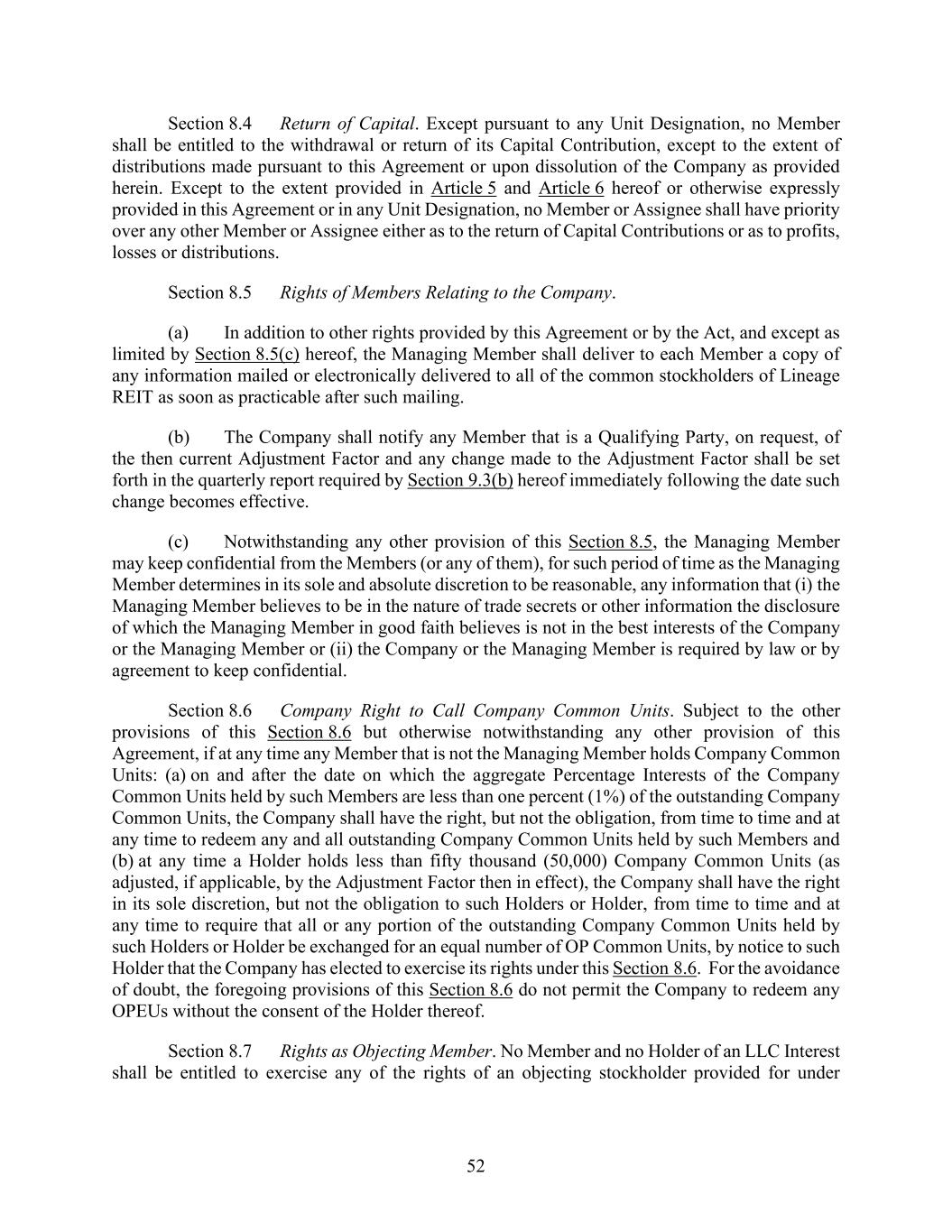 52 Section 8.4 Return of Capital. Except pursuant to any Unit Designation, no Member shall be entitled to the withdrawal or return of its Capital Contribution, except to the extent of distributions made pursuant to this Agreement or upon dissolution of the Company as provided herein. Except to the extent provided in Article 5 and Article 6 hereof or otherwise expressly provided in this Agreement or in any Unit Designation, no Member or Assignee shall have priority over any other Member or Assignee either as to the return of Capital Contributions or as to profits, losses or distributions. Section 8.5 Rights of Members Relating to the Company. (a) In addition to other rights provided by this Agreement or by the Act, and except as limited by Section 8.5(c) hereof, the Managing Member shall deliver to each Member a copy of any information mailed or electronically delivered to all of the common stockholders of Lineage REIT as soon as practicable after such mailing. (b) The Company shall notify any Member that is a Qualifying Party, on request, of the then current Adjustment Factor and any change made to the Adjustment Factor shall be set forth in the quarterly report required by Section 9.3(b) hereof immediately following the date such change becomes effective. (c) Notwithstanding any other provision of this Section 8.5, the Managing Member may keep confidential from the Members (or any of them), for such period of time as the Managing Member determines in its sole and absolute discretion to be reasonable, any information that (i) the Managing Member believes to be in the nature of trade secrets or other information the disclosure of which the Managing Member in good faith believes is not in the best interests of the Company or the Managing Member or (ii) the Company or the Managing Member is required by law or by agreement to keep confidential. Section 8.6 Company Right to Call Company Common Units. Subject to the other provisions of this Section 8.6 but otherwise notwithstanding any other provision of this Agreement, if at any time any Member that is not the Managing Member holds Company Common Units: (a) on and after the date on which the aggregate Percentage Interests of the Company Common Units held by such Members are less than one percent (1%) of the outstanding Company Common Units, the Company shall have the right, but not the obligation, from time to time and at any time to redeem any and all outstanding Company Common Units held by such Members and (b) at any time a Holder holds less than fifty thousand (50,000) Company Common Units (as adjusted, if applicable, by the Adjustment Factor then in effect), the Company shall have the right in its sole discretion, but not the obligation to such Holders or Holder, from time to time and at any time to require that all or any portion of the outstanding Company Common Units held by such Holders or Holder be exchanged for an equal number of OP Common Units, by notice to such Holder that the Company has elected to exercise its rights under this Section 8.6. For the avoidance of doubt, the foregoing provisions of this Section 8.6 do not permit the Company to redeem any OPEUs without the consent of the Holder thereof. Section 8.7 Rights as Objecting Member. No Member and no Holder of an LLC Interest shall be entitled to exercise any of the rights of an objecting stockholder provided for under