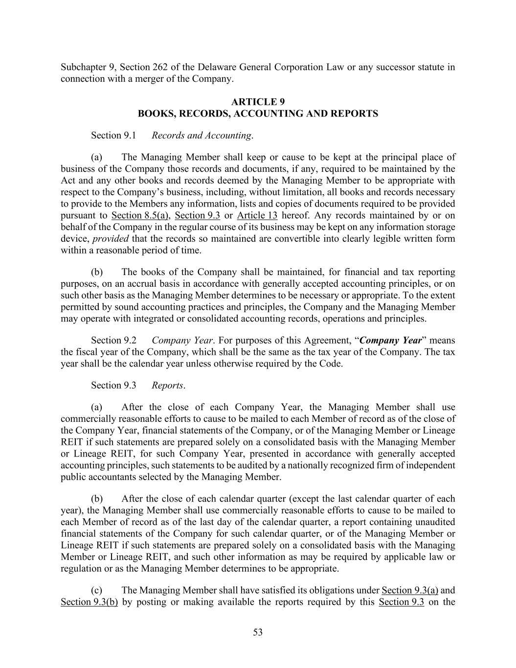 53 Subchapter 9, Section 262 of the Delaware General Corporation Law or any successor statute in connection with a merger of the Company. ARTICLE 9 BOOKS, RECORDS, ACCOUNTING AND REPORTS Section 9.1 Records and Accounting. (a) The Managing Member shall keep or cause to be kept at the principal place of business of the Company those records and documents, if any, required to be maintained by the Act and any other books and records deemed by the Managing Member to be appropriate with respect to the Company’s business, including, without limitation, all books and records necessary to provide to the Members any information, lists and copies of documents required to be provided pursuant to Section 8.5(a), Section 9.3 or Article 13 hereof. Any records maintained by or on behalf of the Company in the regular course of its business may be kept on any information storage device, provided that the records so maintained are convertible into clearly legible written form within a reasonable period of time. (b) The books of the Company shall be maintained, for financial and tax reporting purposes, on an accrual basis in accordance with generally accepted accounting principles, or on such other basis as the Managing Member determines to be necessary or appropriate. To the extent permitted by sound accounting practices and principles, the Company and the Managing Member may operate with integrated or consolidated accounting records, operations and principles. Section 9.2 Company Year. For purposes of this Agreement, “Company Year” means the fiscal year of the Company, which shall be the same as the tax year of the Company. The tax year shall be the calendar year unless otherwise required by the Code. Section 9.3 Reports. (a) After the close of each Company Year, the Managing Member shall use commercially reasonable efforts to cause to be mailed to each Member of record as of the close of the Company Year, financial statements of the Company, or of the Managing Member or Lineage REIT if such statements are prepared solely on a consolidated basis with the Managing Member or Lineage REIT, for such Company Year, presented in accordance with generally accepted accounting principles, such statements to be audited by a nationally recognized firm of independent public accountants selected by the Managing Member. (b) After the close of each calendar quarter (except the last calendar quarter of each year), the Managing Member shall use commercially reasonable efforts to cause to be mailed to each Member of record as of the last day of the calendar quarter, a report containing unaudited financial statements of the Company for such calendar quarter, or of the Managing Member or Lineage REIT if such statements are prepared solely on a consolidated basis with the Managing Member or Lineage REIT, and such other information as may be required by applicable law or regulation or as the Managing Member determines to be appropriate. (c) The Managing Member shall have satisfied its obligations under Section 9.3(a) and Section 9.3(b) by posting or making available the reports required by this Section 9.3 on the