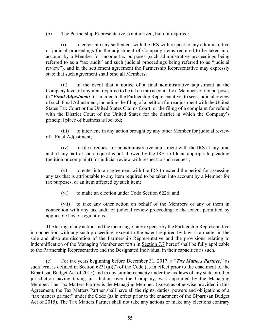 55 (b) The Partnership Representative is authorized, but not required: (i) to enter into any settlement with the IRS with respect to any administrative or judicial proceedings for the adjustment of Company items required to be taken into account by a Member for income tax purposes (such administrative proceedings being referred to as a “tax audit” and such judicial proceedings being referred to as “judicial review”), and in the settlement agreement the Partnership Representative may expressly state that such agreement shall bind all Members; (ii) in the event that a notice of a final administrative adjustment at the Company level of any item required to be taken into account by a Member for tax purposes (a “Final Adjustment”) is mailed to the Partnership Representative, to seek judicial review of such Final Adjustment, including the filing of a petition for readjustment with the United States Tax Court or the United States Claims Court, or the filing of a complaint for refund with the District Court of the United States for the district in which the Company’s principal place of business is located; (iii) to intervene in any action brought by any other Member for judicial review of a Final Adjustment; (iv) to file a request for an administrative adjustment with the IRS at any time and, if any part of such request is not allowed by the IRS, to file an appropriate pleading (petition or complaint) for judicial review with respect to such request; (v) to enter into an agreement with the IRS to extend the period for assessing any tax that is attributable to any item required to be taken into account by a Member for tax purposes, or an item affected by such item; (vi) to make an election under Code Section 6226; and (vii) to take any other action on behalf of the Members or any of them in connection with any tax audit or judicial review proceeding to the extent permitted by applicable law or regulations. The taking of any action and the incurring of any expense by the Partnership Representative in connection with any such proceeding, except to the extent required by law, is a matter in the sole and absolute discretion of the Partnership Representative and the provisions relating to indemnification of the Managing Member set forth in Section 7.7 hereof shall be fully applicable to the Partnership Representative and the Designated Individual in their capacities as such. (c) For tax years beginning before December 31, 2017, a “Tax Matters Partner,” as such term is defined in Section 6231(a)(7) of the Code (as in effect prior to the enactment of the Bipartisan Budget Act of 2015) and in any similar capacity under the tax laws of any state or other jurisdiction having taxing jurisdiction over the Company, was appointed by the Managing Member. The Tax Matters Partner is the Managing Member. Except as otherwise provided in this Agreement, the Tax Matters Partner shall have all the rights, duties, powers and obligations of a “tax matters partner” under the Code (as in effect prior to the enactment of the Bipartisan Budget Act of 2015). The Tax Matters Partner shall not take any actions or make any elections contrary