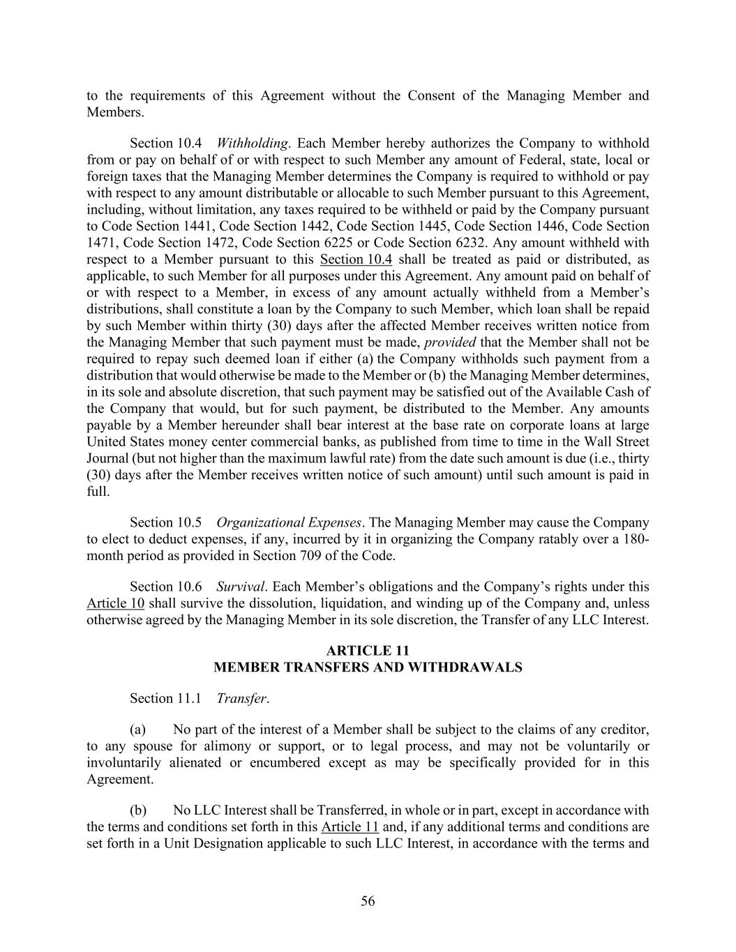 56 to the requirements of this Agreement without the Consent of the Managing Member and Members. Section 10.4 Withholding. Each Member hereby authorizes the Company to withhold from or pay on behalf of or with respect to such Member any amount of Federal, state, local or foreign taxes that the Managing Member determines the Company is required to withhold or pay with respect to any amount distributable or allocable to such Member pursuant to this Agreement, including, without limitation, any taxes required to be withheld or paid by the Company pursuant to Code Section 1441, Code Section 1442, Code Section 1445, Code Section 1446, Code Section 1471, Code Section 1472, Code Section 6225 or Code Section 6232. Any amount withheld with respect to a Member pursuant to this Section 10.4 shall be treated as paid or distributed, as applicable, to such Member for all purposes under this Agreement. Any amount paid on behalf of or with respect to a Member, in excess of any amount actually withheld from a Member’s distributions, shall constitute a loan by the Company to such Member, which loan shall be repaid by such Member within thirty (30) days after the affected Member receives written notice from the Managing Member that such payment must be made, provided that the Member shall not be required to repay such deemed loan if either (a) the Company withholds such payment from a distribution that would otherwise be made to the Member or (b) the Managing Member determines, in its sole and absolute discretion, that such payment may be satisfied out of the Available Cash of the Company that would, but for such payment, be distributed to the Member. Any amounts payable by a Member hereunder shall bear interest at the base rate on corporate loans at large United States money center commercial banks, as published from time to time in the Wall Street Journal (but not higher than the maximum lawful rate) from the date such amount is due (i.e., thirty (30) days after the Member receives written notice of such amount) until such amount is paid in full. Section 10.5 Organizational Expenses. The Managing Member may cause the Company to elect to deduct expenses, if any, incurred by it in organizing the Company ratably over a 180- month period as provided in Section 709 of the Code. Section 10.6 Survival. Each Member’s obligations and the Company’s rights under this Article 10 shall survive the dissolution, liquidation, and winding up of the Company and, unless otherwise agreed by the Managing Member in its sole discretion, the Transfer of any LLC Interest. ARTICLE 11 MEMBER TRANSFERS AND WITHDRAWALS Section 11.1 Transfer. (a) No part of the interest of a Member shall be subject to the claims of any creditor, to any spouse for alimony or support, or to legal process, and may not be voluntarily or involuntarily alienated or encumbered except as may be specifically provided for in this Agreement. (b) No LLC Interest shall be Transferred, in whole or in part, except in accordance with the terms and conditions set forth in this Article 11 and, if any additional terms and conditions are set forth in a Unit Designation applicable to such LLC Interest, in accordance with the terms and