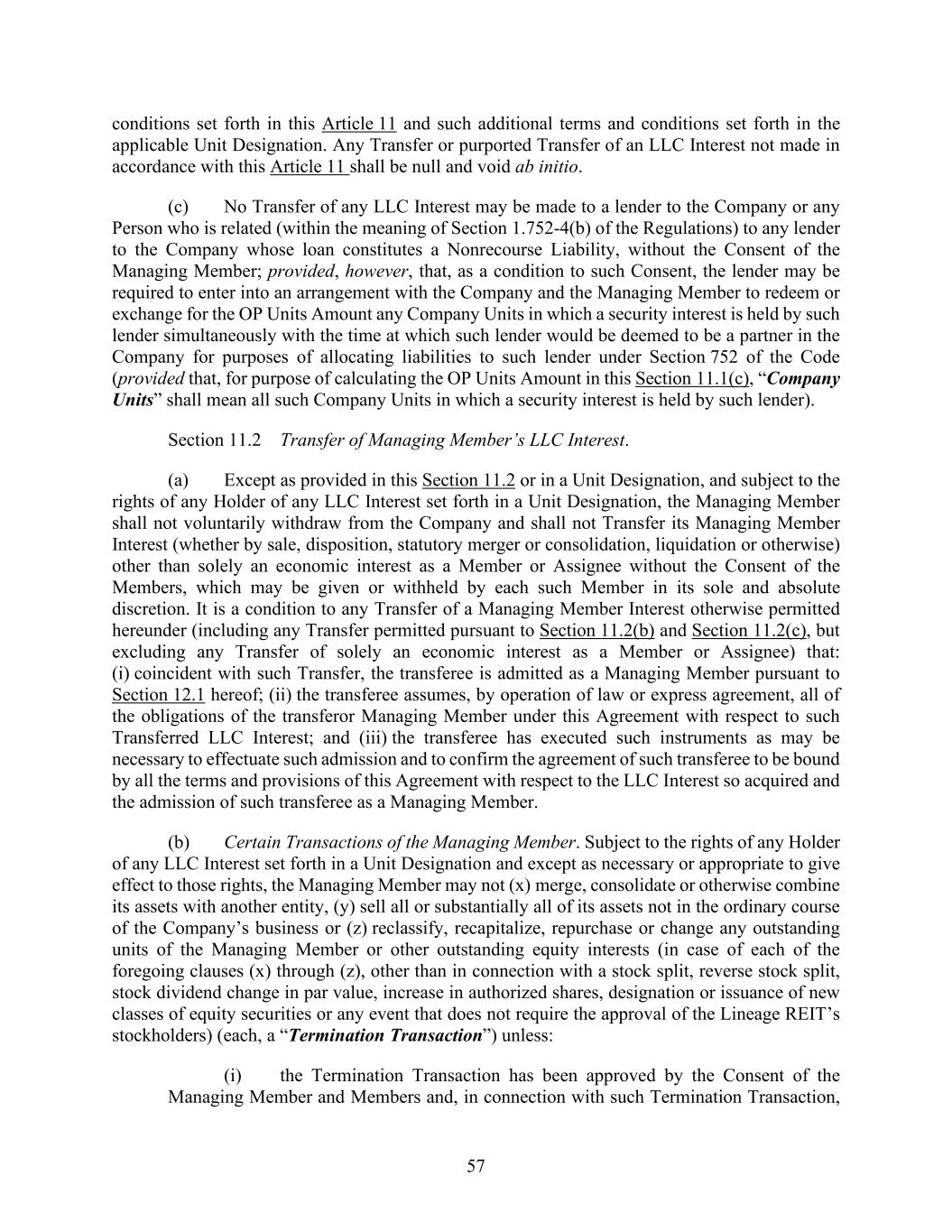 57 conditions set forth in this Article 11 and such additional terms and conditions set forth in the applicable Unit Designation. Any Transfer or purported Transfer of an LLC Interest not made in accordance with this Article 11 shall be null and void ab initio. (c) No Transfer of any LLC Interest may be made to a lender to the Company or any Person who is related (within the meaning of Section 1.752-4(b) of the Regulations) to any lender to the Company whose loan constitutes a Nonrecourse Liability, without the Consent of the Managing Member; provided, however, that, as a condition to such Consent, the lender may be required to enter into an arrangement with the Company and the Managing Member to redeem or exchange for the OP Units Amount any Company Units in which a security interest is held by such lender simultaneously with the time at which such lender would be deemed to be a partner in the Company for purposes of allocating liabilities to such lender under Section 752 of the Code (provided that, for purpose of calculating the OP Units Amount in this Section 11.1(c), “Company Units” shall mean all such Company Units in which a security interest is held by such lender). Section 11.2 Transfer of Managing Member’s LLC Interest. (a) Except as provided in this Section 11.2 or in a Unit Designation, and subject to the rights of any Holder of any LLC Interest set forth in a Unit Designation, the Managing Member shall not voluntarily withdraw from the Company and shall not Transfer its Managing Member Interest (whether by sale, disposition, statutory merger or consolidation, liquidation or otherwise) other than solely an economic interest as a Member or Assignee without the Consent of the Members, which may be given or withheld by each such Member in its sole and absolute discretion. It is a condition to any Transfer of a Managing Member Interest otherwise permitted hereunder (including any Transfer permitted pursuant to Section 11.2(b) and Section 11.2(c), but excluding any Transfer of solely an economic interest as a Member or Assignee) that: (i) coincident with such Transfer, the transferee is admitted as a Managing Member pursuant to Section 12.1 hereof; (ii) the transferee assumes, by operation of law or express agreement, all of the obligations of the transferor Managing Member under this Agreement with respect to such Transferred LLC Interest; and (iii) the transferee has executed such instruments as may be necessary to effectuate such admission and to confirm the agreement of such transferee to be bound by all the terms and provisions of this Agreement with respect to the LLC Interest so acquired and the admission of such transferee as a Managing Member. (b) Certain Transactions of the Managing Member. Subject to the rights of any Holder of any LLC Interest set forth in a Unit Designation and except as necessary or appropriate to give effect to those rights, the Managing Member may not (x) merge, consolidate or otherwise combine its assets with another entity, (y) sell all or substantially all of its assets not in the ordinary course of the Company’s business or (z) reclassify, recapitalize, repurchase or change any outstanding units of the Managing Member or other outstanding equity interests (in case of each of the foregoing clauses (x) through (z), other than in connection with a stock split, reverse stock split, stock dividend change in par value, increase in authorized shares, designation or issuance of new classes of equity securities or any event that does not require the approval of the Lineage REIT’s stockholders) (each, a “Termination Transaction”) unless: (i) the Termination Transaction has been approved by the Consent of the Managing Member and Members and, in connection with such Termination Transaction,