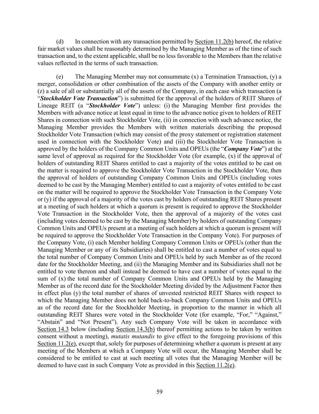 59 (d) In connection with any transaction permitted by Section 11.2(b) hereof, the relative fair market values shall be reasonably determined by the Managing Member as of the time of such transaction and, to the extent applicable, shall be no less favorable to the Members than the relative values reflected in the terms of such transaction. (e) The Managing Member may not consummate (x) a Termination Transaction, (y) a merger, consolidation or other combination of the assets of the Company with another entity or (z) a sale of all or substantially all of the assets of the Company, in each case which transaction (a “Stockholder Vote Transaction”) is submitted for the approval of the holders of REIT Shares of Lineage REIT (a “Stockholder Vote”) unless: (i) the Managing Member first provides the Members with advance notice at least equal in time to the advance notice given to holders of REIT Shares in connection with such Stockholder Vote, (ii) in connection with such advance notice, the Managing Member provides the Members with written materials describing the proposed Stockholder Vote Transaction (which may consist of the proxy statement or registration statement used in connection with the Stockholder Vote) and (iii) the Stockholder Vote Transaction is approved by the holders of the Company Common Units and OPEUs (the “Company Vote”) at the same level of approval as required for the Stockholder Vote (for example, (x) if the approval of holders of outstanding REIT Shares entitled to cast a majority of the votes entitled to be cast on the matter is required to approve the Stockholder Vote Transaction in the Stockholder Vote, then the approval of holders of outstanding Company Common Units and OPEUs (including votes deemed to be cast by the Managing Member) entitled to cast a majority of votes entitled to be cast on the matter will be required to approve the Stockholder Vote Transaction in the Company Vote or (y) if the approval of a majority of the votes cast by holders of outstanding REIT Shares present at a meeting of such holders at which a quorum is present is required to approve the Stockholder Vote Transaction in the Stockholder Vote, then the approval of a majority of the votes cast (including votes deemed to be cast by the Managing Member) by holders of outstanding Company Common Units and OPEUs present at a meeting of such holders at which a quorum is present will be required to approve the Stockholder Vote Transaction in the Company Vote). For purposes of the Company Vote, (i) each Member holding Company Common Units or OPEUs (other than the Managing Member or any of its Subsidiaries) shall be entitled to cast a number of votes equal to the total number of Company Common Units and OPEUs held by such Member as of the record date for the Stockholder Meeting, and (ii) the Managing Member and its Subsidiaries shall not be entitled to vote thereon and shall instead be deemed to have cast a number of votes equal to the sum of (x) the total number of Company Common Units and OPEUs held by the Managing Member as of the record date for the Stockholder Meeting divided by the Adjustment Factor then in effect plus (y) the total number of shares of unvested restricted REIT Shares with respect to which the Managing Member does not hold back-to-back Company Common Units and OPEUs as of the record date for the Stockholder Meeting, in proportion to the manner in which all outstanding REIT Shares were voted in the Stockholder Vote (for example, “For,” “Against,” “Abstain” and “Not Present”). Any such Company Vote will be taken in accordance with Section 14.3 below (including Section 14.3(b) thereof permitting actions to be taken by written consent without a meeting), mutatis mutandis to give effect to the foregoing provisions of this Section 11.2(e), except that, solely for purposes of determining whether a quorum is present at any meeting of the Members at which a Company Vote will occur, the Managing Member shall be considered to be entitled to cast at such meeting all votes that the Managing Member will be deemed to have cast in such Company Vote as provided in this Section 11.2(e).