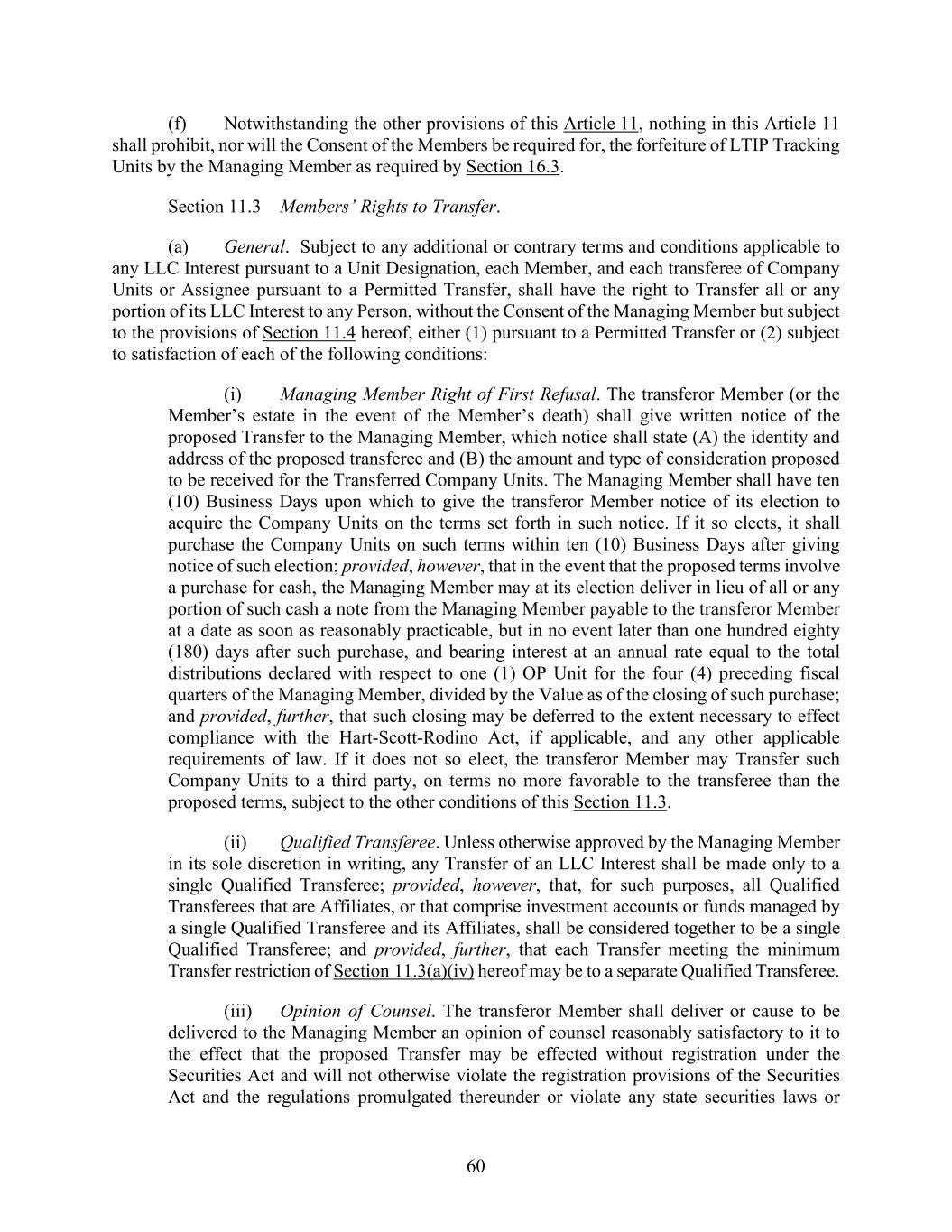 60 (f) Notwithstanding the other provisions of this Article 11, nothing in this Article 11 shall prohibit, nor will the Consent of the Members be required for, the forfeiture of LTIP Tracking Units by the Managing Member as required by Section 16.3. Section 11.3 Members’ Rights to Transfer. (a) General. Subject to any additional or contrary terms and conditions applicable to any LLC Interest pursuant to a Unit Designation, each Member, and each transferee of Company Units or Assignee pursuant to a Permitted Transfer, shall have the right to Transfer all or any portion of its LLC Interest to any Person, without the Consent of the Managing Member but subject to the provisions of Section 11.4 hereof, either (1) pursuant to a Permitted Transfer or (2) subject to satisfaction of each of the following conditions: (i) Managing Member Right of First Refusal. The transferor Member (or the Member’s estate in the event of the Member’s death) shall give written notice of the proposed Transfer to the Managing Member, which notice shall state (A) the identity and address of the proposed transferee and (B) the amount and type of consideration proposed to be received for the Transferred Company Units. The Managing Member shall have ten (10) Business Days upon which to give the transferor Member notice of its election to acquire the Company Units on the terms set forth in such notice. If it so elects, it shall purchase the Company Units on such terms within ten (10) Business Days after giving notice of such election; provided, however, that in the event that the proposed terms involve a purchase for cash, the Managing Member may at its election deliver in lieu of all or any portion of such cash a note from the Managing Member payable to the transferor Member at a date as soon as reasonably practicable, but in no event later than one hundred eighty (180) days after such purchase, and bearing interest at an annual rate equal to the total distributions declared with respect to one (1) OP Unit for the four (4) preceding fiscal quarters of the Managing Member, divided by the Value as of the closing of such purchase; and provided, further, that such closing may be deferred to the extent necessary to effect compliance with the Hart-Scott-Rodino Act, if applicable, and any other applicable requirements of law. If it does not so elect, the transferor Member may Transfer such Company Units to a third party, on terms no more favorable to the transferee than the proposed terms, subject to the other conditions of this Section 11.3. (ii) Qualified Transferee. Unless otherwise approved by the Managing Member in its sole discretion in writing, any Transfer of an LLC Interest shall be made only to a single Qualified Transferee; provided, however, that, for such purposes, all Qualified Transferees that are Affiliates, or that comprise investment accounts or funds managed by a single Qualified Transferee and its Affiliates, shall be considered together to be a single Qualified Transferee; and provided, further, that each Transfer meeting the minimum Transfer restriction of Section 11.3(a)(iv) hereof may be to a separate Qualified Transferee. (iii) Opinion of Counsel. The transferor Member shall deliver or cause to be delivered to the Managing Member an opinion of counsel reasonably satisfactory to it to the effect that the proposed Transfer may be effected without registration under the Securities Act and will not otherwise violate the registration provisions of the Securities Act and the regulations promulgated thereunder or violate any state securities laws or
