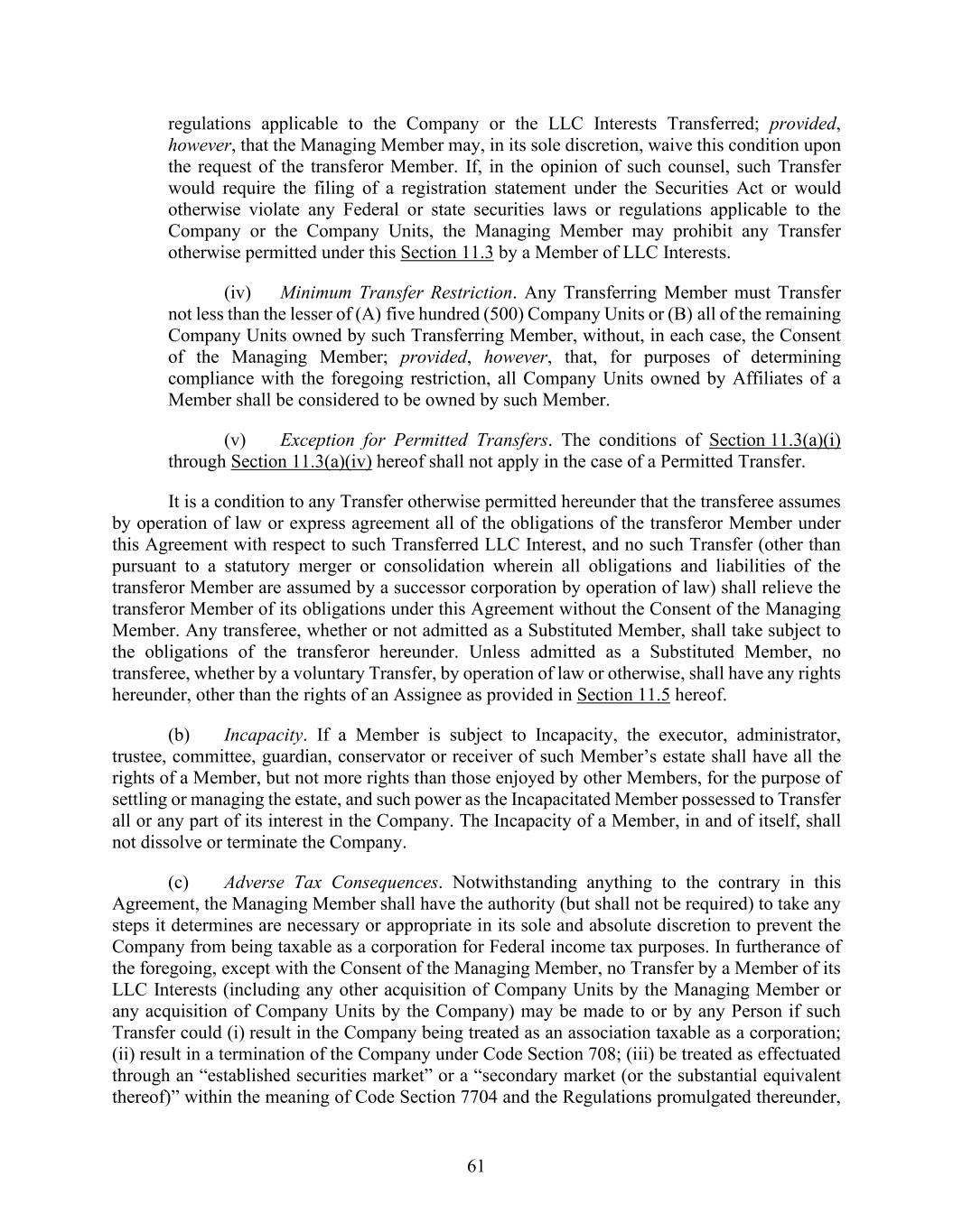 61 regulations applicable to the Company or the LLC Interests Transferred; provided, however, that the Managing Member may, in its sole discretion, waive this condition upon the request of the transferor Member. If, in the opinion of such counsel, such Transfer would require the filing of a registration statement under the Securities Act or would otherwise violate any Federal or state securities laws or regulations applicable to the Company or the Company Units, the Managing Member may prohibit any Transfer otherwise permitted under this Section 11.3 by a Member of LLC Interests. (iv) Minimum Transfer Restriction. Any Transferring Member must Transfer not less than the lesser of (A) five hundred (500) Company Units or (B) all of the remaining Company Units owned by such Transferring Member, without, in each case, the Consent of the Managing Member; provided, however, that, for purposes of determining compliance with the foregoing restriction, all Company Units owned by Affiliates of a Member shall be considered to be owned by such Member. (v) Exception for Permitted Transfers. The conditions of Section 11.3(a)(i) through Section 11.3(a)(iv) hereof shall not apply in the case of a Permitted Transfer. It is a condition to any Transfer otherwise permitted hereunder that the transferee assumes by operation of law or express agreement all of the obligations of the transferor Member under this Agreement with respect to such Transferred LLC Interest, and no such Transfer (other than pursuant to a statutory merger or consolidation wherein all obligations and liabilities of the transferor Member are assumed by a successor corporation by operation of law) shall relieve the transferor Member of its obligations under this Agreement without the Consent of the Managing Member. Any transferee, whether or not admitted as a Substituted Member, shall take subject to the obligations of the transferor hereunder. Unless admitted as a Substituted Member, no transferee, whether by a voluntary Transfer, by operation of law or otherwise, shall have any rights hereunder, other than the rights of an Assignee as provided in Section 11.5 hereof. (b) Incapacity. If a Member is subject to Incapacity, the executor, administrator, trustee, committee, guardian, conservator or receiver of such Member’s estate shall have all the rights of a Member, but not more rights than those enjoyed by other Members, for the purpose of settling or managing the estate, and such power as the Incapacitated Member possessed to Transfer all or any part of its interest in the Company. The Incapacity of a Member, in and of itself, shall not dissolve or terminate the Company. (c) Adverse Tax Consequences. Notwithstanding anything to the contrary in this Agreement, the Managing Member shall have the authority (but shall not be required) to take any steps it determines are necessary or appropriate in its sole and absolute discretion to prevent the Company from being taxable as a corporation for Federal income tax purposes. In furtherance of the foregoing, except with the Consent of the Managing Member, no Transfer by a Member of its LLC Interests (including any other acquisition of Company Units by the Managing Member or any acquisition of Company Units by the Company) may be made to or by any Person if such Transfer could (i) result in the Company being treated as an association taxable as a corporation; (ii) result in a termination of the Company under Code Section 708; (iii) be treated as effectuated through an “established securities market” or a “secondary market (or the substantial equivalent thereof)” within the meaning of Code Section 7704 and the Regulations promulgated thereunder,