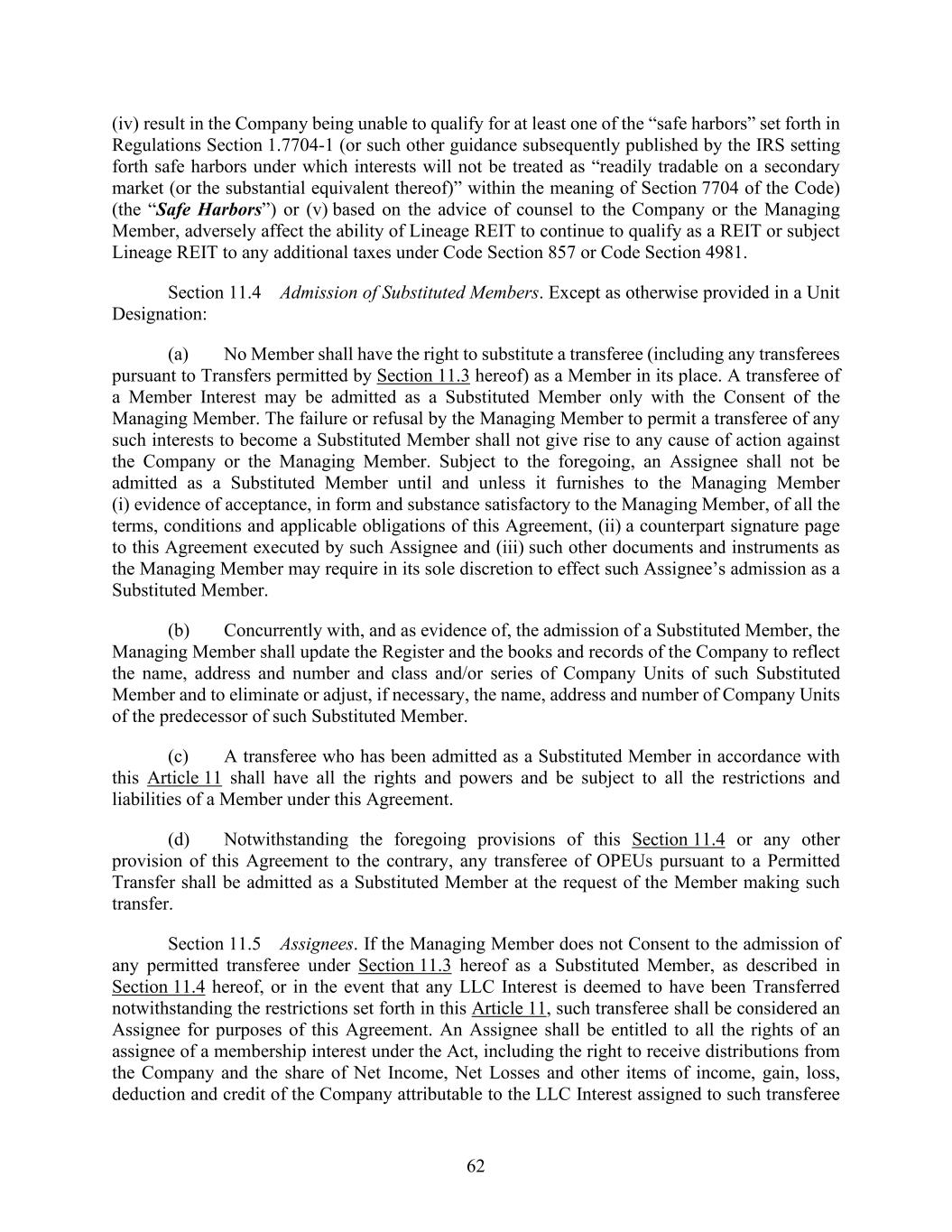 62 (iv) result in the Company being unable to qualify for at least one of the “safe harbors” set forth in Regulations Section 1.7704-1 (or such other guidance subsequently published by the IRS setting forth safe harbors under which interests will not be treated as “readily tradable on a secondary market (or the substantial equivalent thereof)” within the meaning of Section 7704 of the Code) (the “Safe Harbors”) or (v) based on the advice of counsel to the Company or the Managing Member, adversely affect the ability of Lineage REIT to continue to qualify as a REIT or subject Lineage REIT to any additional taxes under Code Section 857 or Code Section 4981. Section 11.4 Admission of Substituted Members. Except as otherwise provided in a Unit Designation: (a) No Member shall have the right to substitute a transferee (including any transferees pursuant to Transfers permitted by Section 11.3 hereof) as a Member in its place. A transferee of a Member Interest may be admitted as a Substituted Member only with the Consent of the Managing Member. The failure or refusal by the Managing Member to permit a transferee of any such interests to become a Substituted Member shall not give rise to any cause of action against the Company or the Managing Member. Subject to the foregoing, an Assignee shall not be admitted as a Substituted Member until and unless it furnishes to the Managing Member (i) evidence of acceptance, in form and substance satisfactory to the Managing Member, of all the terms, conditions and applicable obligations of this Agreement, (ii) a counterpart signature page to this Agreement executed by such Assignee and (iii) such other documents and instruments as the Managing Member may require in its sole discretion to effect such Assignee’s admission as a Substituted Member. (b) Concurrently with, and as evidence of, the admission of a Substituted Member, the Managing Member shall update the Register and the books and records of the Company to reflect the name, address and number and class and/or series of Company Units of such Substituted Member and to eliminate or adjust, if necessary, the name, address and number of Company Units of the predecessor of such Substituted Member. (c) A transferee who has been admitted as a Substituted Member in accordance with this Article 11 shall have all the rights and powers and be subject to all the restrictions and liabilities of a Member under this Agreement. (d) Notwithstanding the foregoing provisions of this Section 11.4 or any other provision of this Agreement to the contrary, any transferee of OPEUs pursuant to a Permitted Transfer shall be admitted as a Substituted Member at the request of the Member making such transfer. Section 11.5 Assignees. If the Managing Member does not Consent to the admission of any permitted transferee under Section 11.3 hereof as a Substituted Member, as described in Section 11.4 hereof, or in the event that any LLC Interest is deemed to have been Transferred notwithstanding the restrictions set forth in this Article 11, such transferee shall be considered an Assignee for purposes of this Agreement. An Assignee shall be entitled to all the rights of an assignee of a membership interest under the Act, including the right to receive distributions from the Company and the share of Net Income, Net Losses and other items of income, gain, loss, deduction and credit of the Company attributable to the LLC Interest assigned to such transferee