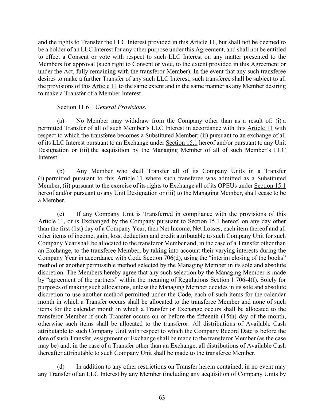 63 and the rights to Transfer the LLC Interest provided in this Article 11, but shall not be deemed to be a holder of an LLC Interest for any other purpose under this Agreement, and shall not be entitled to effect a Consent or vote with respect to such LLC Interest on any matter presented to the Members for approval (such right to Consent or vote, to the extent provided in this Agreement or under the Act, fully remaining with the transferor Member). In the event that any such transferee desires to make a further Transfer of any such LLC Interest, such transferee shall be subject to all the provisions of this Article 11 to the same extent and in the same manner as any Member desiring to make a Transfer of a Member Interest. Section 11.6 General Provisions. (a) No Member may withdraw from the Company other than as a result of: (i) a permitted Transfer of all of such Member’s LLC Interest in accordance with this Article 11 with respect to which the transferee becomes a Substituted Member; (ii) pursuant to an exchange of all of its LLC Interest pursuant to an Exchange under Section 15.1 hereof and/or pursuant to any Unit Designation or (iii) the acquisition by the Managing Member of all of such Member’s LLC Interest. (b) Any Member who shall Transfer all of its Company Units in a Transfer (i) permitted pursuant to this Article 11 where such transferee was admitted as a Substituted Member, (ii) pursuant to the exercise of its rights to Exchange all of its OPEUs under Section 15.1 hereof and/or pursuant to any Unit Designation or (iii) to the Managing Member, shall cease to be a Member. (c) If any Company Unit is Transferred in compliance with the provisions of this Article 11, or is Exchanged by the Company pursuant to Section 15.1 hereof, on any day other than the first (1st) day of a Company Year, then Net Income, Net Losses, each item thereof and all other items of income, gain, loss, deduction and credit attributable to such Company Unit for such Company Year shall be allocated to the transferor Member and, in the case of a Transfer other than an Exchange, to the transferee Member, by taking into account their varying interests during the Company Year in accordance with Code Section 706(d), using the “interim closing of the books” method or another permissible method selected by the Managing Member in its sole and absolute discretion. The Members hereby agree that any such selection by the Managing Member is made by “agreement of the partners” within the meaning of Regulations Section 1.706-4(f). Solely for purposes of making such allocations, unless the Managing Member decides in its sole and absolute discretion to use another method permitted under the Code, each of such items for the calendar month in which a Transfer occurs shall be allocated to the transferee Member and none of such items for the calendar month in which a Transfer or Exchange occurs shall be allocated to the transferor Member if such Transfer occurs on or before the fifteenth (15th) day of the month, otherwise such items shall be allocated to the transferor. All distributions of Available Cash attributable to such Company Unit with respect to which the Company Record Date is before the date of such Transfer, assignment or Exchange shall be made to the transferor Member (as the case may be) and, in the case of a Transfer other than an Exchange, all distributions of Available Cash thereafter attributable to such Company Unit shall be made to the transferee Member. (d) In addition to any other restrictions on Transfer herein contained, in no event may any Transfer of an LLC Interest by any Member (including any acquisition of Company Units by