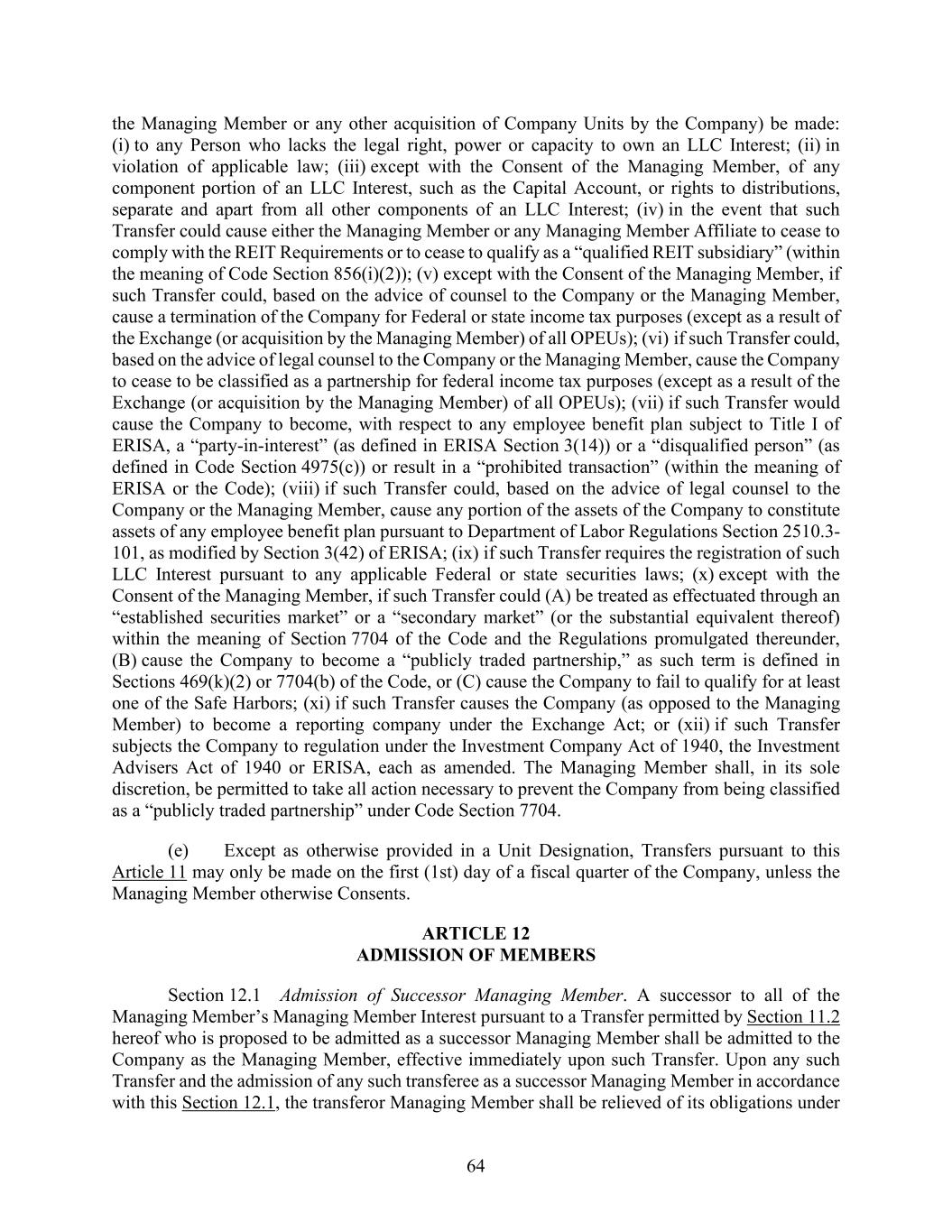 64 the Managing Member or any other acquisition of Company Units by the Company) be made: (i) to any Person who lacks the legal right, power or capacity to own an LLC Interest; (ii) in violation of applicable law; (iii) except with the Consent of the Managing Member, of any component portion of an LLC Interest, such as the Capital Account, or rights to distributions, separate and apart from all other components of an LLC Interest; (iv) in the event that such Transfer could cause either the Managing Member or any Managing Member Affiliate to cease to comply with the REIT Requirements or to cease to qualify as a “qualified REIT subsidiary” (within the meaning of Code Section 856(i)(2)); (v) except with the Consent of the Managing Member, if such Transfer could, based on the advice of counsel to the Company or the Managing Member, cause a termination of the Company for Federal or state income tax purposes (except as a result of the Exchange (or acquisition by the Managing Member) of all OPEUs); (vi) if such Transfer could, based on the advice of legal counsel to the Company or the Managing Member, cause the Company to cease to be classified as a partnership for federal income tax purposes (except as a result of the Exchange (or acquisition by the Managing Member) of all OPEUs); (vii) if such Transfer would cause the Company to become, with respect to any employee benefit plan subject to Title I of ERISA, a “party-in-interest” (as defined in ERISA Section 3(14)) or a “disqualified person” (as defined in Code Section 4975(c)) or result in a “prohibited transaction” (within the meaning of ERISA or the Code); (viii) if such Transfer could, based on the advice of legal counsel to the Company or the Managing Member, cause any portion of the assets of the Company to constitute assets of any employee benefit plan pursuant to Department of Labor Regulations Section 2510.3- 101, as modified by Section 3(42) of ERISA; (ix) if such Transfer requires the registration of such LLC Interest pursuant to any applicable Federal or state securities laws; (x) except with the Consent of the Managing Member, if such Transfer could (A) be treated as effectuated through an “established securities market” or a “secondary market” (or the substantial equivalent thereof) within the meaning of Section 7704 of the Code and the Regulations promulgated thereunder, (B) cause the Company to become a “publicly traded partnership,” as such term is defined in Sections 469(k)(2) or 7704(b) of the Code, or (C) cause the Company to fail to qualify for at least one of the Safe Harbors; (xi) if such Transfer causes the Company (as opposed to the Managing Member) to become a reporting company under the Exchange Act; or (xii) if such Transfer subjects the Company to regulation under the Investment Company Act of 1940, the Investment Advisers Act of 1940 or ERISA, each as amended. The Managing Member shall, in its sole discretion, be permitted to take all action necessary to prevent the Company from being classified as a “publicly traded partnership” under Code Section 7704. (e) Except as otherwise provided in a Unit Designation, Transfers pursuant to this Article 11 may only be made on the first (1st) day of a fiscal quarter of the Company, unless the Managing Member otherwise Consents. ARTICLE 12 ADMISSION OF MEMBERS Section 12.1 Admission of Successor Managing Member. A successor to all of the Managing Member’s Managing Member Interest pursuant to a Transfer permitted by Section 11.2 hereof who is proposed to be admitted as a successor Managing Member shall be admitted to the Company as the Managing Member, effective immediately upon such Transfer. Upon any such Transfer and the admission of any such transferee as a successor Managing Member in accordance with this Section 12.1, the transferor Managing Member shall be relieved of its obligations under