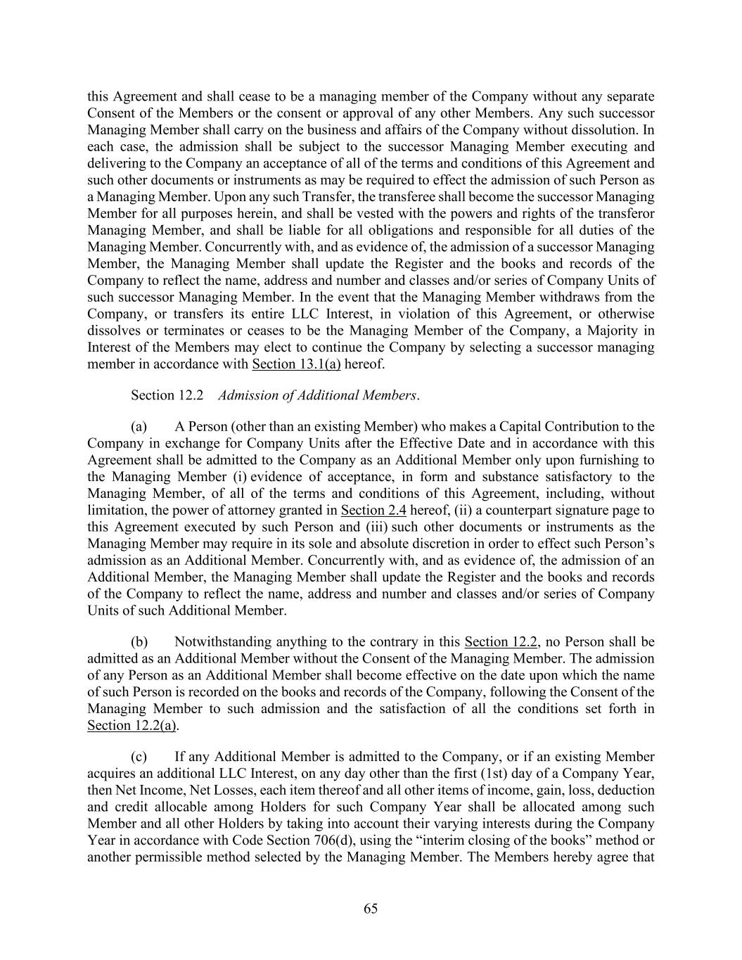 65 this Agreement and shall cease to be a managing member of the Company without any separate Consent of the Members or the consent or approval of any other Members. Any such successor Managing Member shall carry on the business and affairs of the Company without dissolution. In each case, the admission shall be subject to the successor Managing Member executing and delivering to the Company an acceptance of all of the terms and conditions of this Agreement and such other documents or instruments as may be required to effect the admission of such Person as a Managing Member. Upon any such Transfer, the transferee shall become the successor Managing Member for all purposes herein, and shall be vested with the powers and rights of the transferor Managing Member, and shall be liable for all obligations and responsible for all duties of the Managing Member. Concurrently with, and as evidence of, the admission of a successor Managing Member, the Managing Member shall update the Register and the books and records of the Company to reflect the name, address and number and classes and/or series of Company Units of such successor Managing Member. In the event that the Managing Member withdraws from the Company, or transfers its entire LLC Interest, in violation of this Agreement, or otherwise dissolves or terminates or ceases to be the Managing Member of the Company, a Majority in Interest of the Members may elect to continue the Company by selecting a successor managing member in accordance with Section 13.1(a) hereof. Section 12.2 Admission of Additional Members. (a) A Person (other than an existing Member) who makes a Capital Contribution to the Company in exchange for Company Units after the Effective Date and in accordance with this Agreement shall be admitted to the Company as an Additional Member only upon furnishing to the Managing Member (i) evidence of acceptance, in form and substance satisfactory to the Managing Member, of all of the terms and conditions of this Agreement, including, without limitation, the power of attorney granted in Section 2.4 hereof, (ii) a counterpart signature page to this Agreement executed by such Person and (iii) such other documents or instruments as the Managing Member may require in its sole and absolute discretion in order to effect such Person’s admission as an Additional Member. Concurrently with, and as evidence of, the admission of an Additional Member, the Managing Member shall update the Register and the books and records of the Company to reflect the name, address and number and classes and/or series of Company Units of such Additional Member. (b) Notwithstanding anything to the contrary in this Section 12.2, no Person shall be admitted as an Additional Member without the Consent of the Managing Member. The admission of any Person as an Additional Member shall become effective on the date upon which the name of such Person is recorded on the books and records of the Company, following the Consent of the Managing Member to such admission and the satisfaction of all the conditions set forth in Section 12.2(a). (c) If any Additional Member is admitted to the Company, or if an existing Member acquires an additional LLC Interest, on any day other than the first (1st) day of a Company Year, then Net Income, Net Losses, each item thereof and all other items of income, gain, loss, deduction and credit allocable among Holders for such Company Year shall be allocated among such Member and all other Holders by taking into account their varying interests during the Company Year in accordance with Code Section 706(d), using the “interim closing of the books” method or another permissible method selected by the Managing Member. The Members hereby agree that