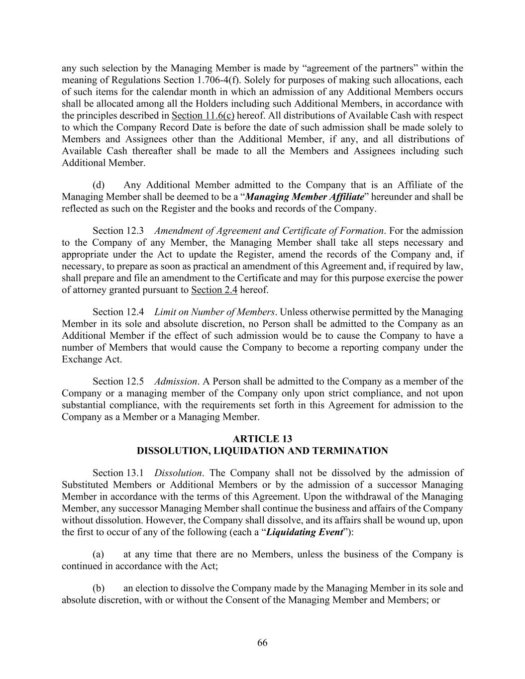 66 any such selection by the Managing Member is made by “agreement of the partners” within the meaning of Regulations Section 1.706-4(f). Solely for purposes of making such allocations, each of such items for the calendar month in which an admission of any Additional Members occurs shall be allocated among all the Holders including such Additional Members, in accordance with the principles described in Section 11.6(c) hereof. All distributions of Available Cash with respect to which the Company Record Date is before the date of such admission shall be made solely to Members and Assignees other than the Additional Member, if any, and all distributions of Available Cash thereafter shall be made to all the Members and Assignees including such Additional Member. (d) Any Additional Member admitted to the Company that is an Affiliate of the Managing Member shall be deemed to be a “Managing Member Affiliate” hereunder and shall be reflected as such on the Register and the books and records of the Company. Section 12.3 Amendment of Agreement and Certificate of Formation. For the admission to the Company of any Member, the Managing Member shall take all steps necessary and appropriate under the Act to update the Register, amend the records of the Company and, if necessary, to prepare as soon as practical an amendment of this Agreement and, if required by law, shall prepare and file an amendment to the Certificate and may for this purpose exercise the power of attorney granted pursuant to Section 2.4 hereof. Section 12.4 Limit on Number of Members. Unless otherwise permitted by the Managing Member in its sole and absolute discretion, no Person shall be admitted to the Company as an Additional Member if the effect of such admission would be to cause the Company to have a number of Members that would cause the Company to become a reporting company under the Exchange Act. Section 12.5 Admission. A Person shall be admitted to the Company as a member of the Company or a managing member of the Company only upon strict compliance, and not upon substantial compliance, with the requirements set forth in this Agreement for admission to the Company as a Member or a Managing Member. ARTICLE 13 DISSOLUTION, LIQUIDATION AND TERMINATION Section 13.1 Dissolution. The Company shall not be dissolved by the admission of Substituted Members or Additional Members or by the admission of a successor Managing Member in accordance with the terms of this Agreement. Upon the withdrawal of the Managing Member, any successor Managing Member shall continue the business and affairs of the Company without dissolution. However, the Company shall dissolve, and its affairs shall be wound up, upon the first to occur of any of the following (each a “Liquidating Event”): (a) at any time that there are no Members, unless the business of the Company is continued in accordance with the Act; (b) an election to dissolve the Company made by the Managing Member in its sole and absolute discretion, with or without the Consent of the Managing Member and Members; or
