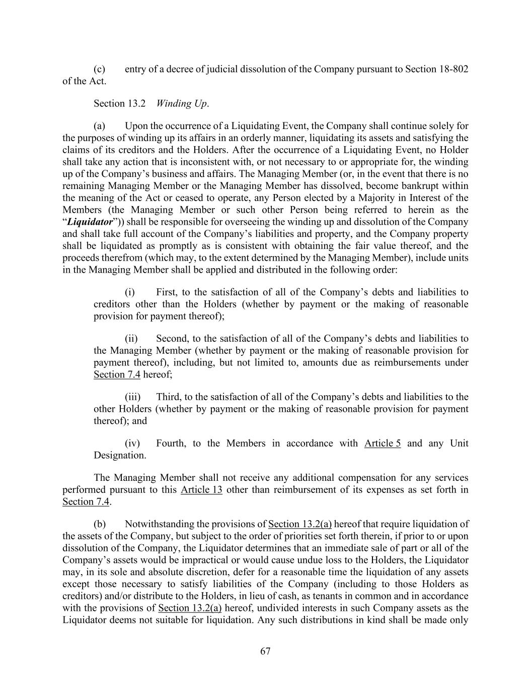 67 (c) entry of a decree of judicial dissolution of the Company pursuant to Section 18-802 of the Act. Section 13.2 Winding Up. (a) Upon the occurrence of a Liquidating Event, the Company shall continue solely for the purposes of winding up its affairs in an orderly manner, liquidating its assets and satisfying the claims of its creditors and the Holders. After the occurrence of a Liquidating Event, no Holder shall take any action that is inconsistent with, or not necessary to or appropriate for, the winding up of the Company’s business and affairs. The Managing Member (or, in the event that there is no remaining Managing Member or the Managing Member has dissolved, become bankrupt within the meaning of the Act or ceased to operate, any Person elected by a Majority in Interest of the Members (the Managing Member or such other Person being referred to herein as the “Liquidator”)) shall be responsible for overseeing the winding up and dissolution of the Company and shall take full account of the Company’s liabilities and property, and the Company property shall be liquidated as promptly as is consistent with obtaining the fair value thereof, and the proceeds therefrom (which may, to the extent determined by the Managing Member), include units in the Managing Member shall be applied and distributed in the following order: (i) First, to the satisfaction of all of the Company’s debts and liabilities to creditors other than the Holders (whether by payment or the making of reasonable provision for payment thereof); (ii) Second, to the satisfaction of all of the Company’s debts and liabilities to the Managing Member (whether by payment or the making of reasonable provision for payment thereof), including, but not limited to, amounts due as reimbursements under Section 7.4 hereof; (iii) Third, to the satisfaction of all of the Company’s debts and liabilities to the other Holders (whether by payment or the making of reasonable provision for payment thereof); and (iv) Fourth, to the Members in accordance with Article 5 and any Unit Designation. The Managing Member shall not receive any additional compensation for any services performed pursuant to this Article 13 other than reimbursement of its expenses as set forth in Section 7.4. (b) Notwithstanding the provisions of Section 13.2(a) hereof that require liquidation of the assets of the Company, but subject to the order of priorities set forth therein, if prior to or upon dissolution of the Company, the Liquidator determines that an immediate sale of part or all of the Company’s assets would be impractical or would cause undue loss to the Holders, the Liquidator may, in its sole and absolute discretion, defer for a reasonable time the liquidation of any assets except those necessary to satisfy liabilities of the Company (including to those Holders as creditors) and/or distribute to the Holders, in lieu of cash, as tenants in common and in accordance with the provisions of Section 13.2(a) hereof, undivided interests in such Company assets as the Liquidator deems not suitable for liquidation. Any such distributions in kind shall be made only