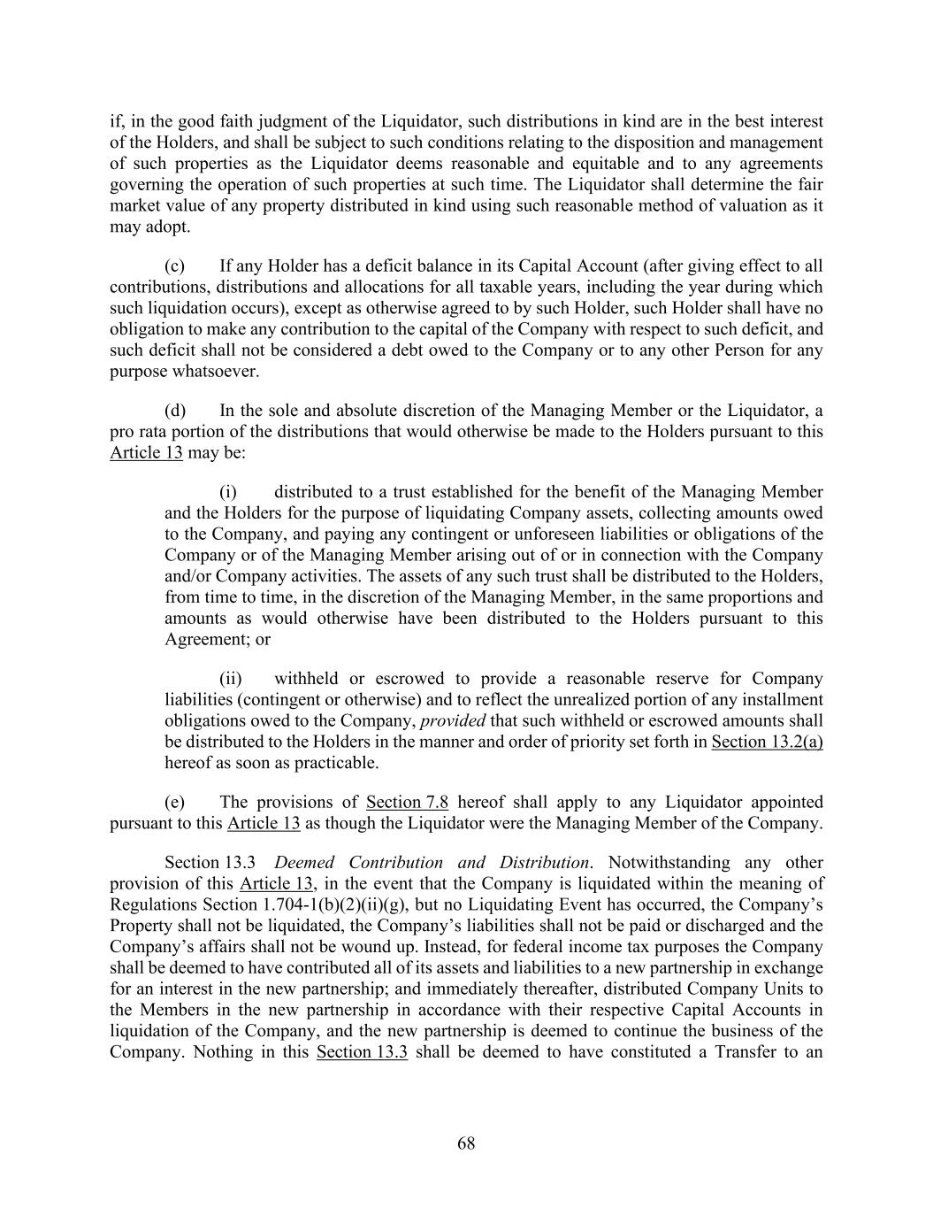 68 if, in the good faith judgment of the Liquidator, such distributions in kind are in the best interest of the Holders, and shall be subject to such conditions relating to the disposition and management of such properties as the Liquidator deems reasonable and equitable and to any agreements governing the operation of such properties at such time. The Liquidator shall determine the fair market value of any property distributed in kind using such reasonable method of valuation as it may adopt. (c) If any Holder has a deficit balance in its Capital Account (after giving effect to all contributions, distributions and allocations for all taxable years, including the year during which such liquidation occurs), except as otherwise agreed to by such Holder, such Holder shall have no obligation to make any contribution to the capital of the Company with respect to such deficit, and such deficit shall not be considered a debt owed to the Company or to any other Person for any purpose whatsoever. (d) In the sole and absolute discretion of the Managing Member or the Liquidator, a pro rata portion of the distributions that would otherwise be made to the Holders pursuant to this Article 13 may be: (i) distributed to a trust established for the benefit of the Managing Member and the Holders for the purpose of liquidating Company assets, collecting amounts owed to the Company, and paying any contingent or unforeseen liabilities or obligations of the Company or of the Managing Member arising out of or in connection with the Company and/or Company activities. The assets of any such trust shall be distributed to the Holders, from time to time, in the discretion of the Managing Member, in the same proportions and amounts as would otherwise have been distributed to the Holders pursuant to this Agreement; or (ii) withheld or escrowed to provide a reasonable reserve for Company liabilities (contingent or otherwise) and to reflect the unrealized portion of any installment obligations owed to the Company, provided that such withheld or escrowed amounts shall be distributed to the Holders in the manner and order of priority set forth in Section 13.2(a) hereof as soon as practicable. (e) The provisions of Section 7.8 hereof shall apply to any Liquidator appointed pursuant to this Article 13 as though the Liquidator were the Managing Member of the Company. Section 13.3 Deemed Contribution and Distribution. Notwithstanding any other provision of this Article 13, in the event that the Company is liquidated within the meaning of Regulations Section 1.704-1(b)(2)(ii)(g), but no Liquidating Event has occurred, the Company’s Property shall not be liquidated, the Company’s liabilities shall not be paid or discharged and the Company’s affairs shall not be wound up. Instead, for federal income tax purposes the Company shall be deemed to have contributed all of its assets and liabilities to a new partnership in exchange for an interest in the new partnership; and immediately thereafter, distributed Company Units to the Members in the new partnership in accordance with their respective Capital Accounts in liquidation of the Company, and the new partnership is deemed to continue the business of the Company. Nothing in this Section 13.3 shall be deemed to have constituted a Transfer to an