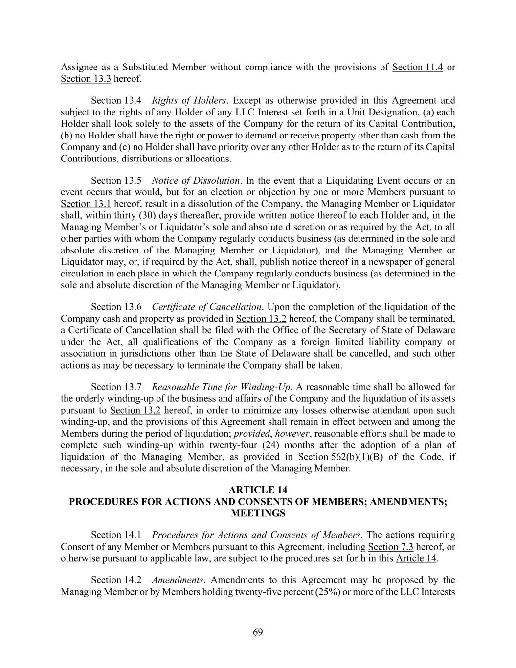 69 Assignee as a Substituted Member without compliance with the provisions of Section 11.4 or Section 13.3 hereof. Section 13.4 Rights of Holders. Except as otherwise provided in this Agreement and subject to the rights of any Holder of any LLC Interest set forth in a Unit Designation, (a) each Holder shall look solely to the assets of the Company for the return of its Capital Contribution, (b) no Holder shall have the right or power to demand or receive property other than cash from the Company and (c) no Holder shall have priority over any other Holder as to the return of its Capital Contributions, distributions or allocations. Section 13.5 Notice of Dissolution. In the event that a Liquidating Event occurs or an event occurs that would, but for an election or objection by one or more Members pursuant to Section 13.1 hereof, result in a dissolution of the Company, the Managing Member or Liquidator shall, within thirty (30) days thereafter, provide written notice thereof to each Holder and, in the Managing Member’s or Liquidator’s sole and absolute discretion or as required by the Act, to all other parties with whom the Company regularly conducts business (as determined in the sole and absolute discretion of the Managing Member or Liquidator), and the Managing Member or Liquidator may, or, if required by the Act, shall, publish notice thereof in a newspaper of general circulation in each place in which the Company regularly conducts business (as determined in the sole and absolute discretion of the Managing Member or Liquidator). Section 13.6 Certificate of Cancellation. Upon the completion of the liquidation of the Company cash and property as provided in Section 13.2 hereof, the Company shall be terminated, a Certificate of Cancellation shall be filed with the Office of the Secretary of State of Delaware under the Act, all qualifications of the Company as a foreign limited liability company or association in jurisdictions other than the State of Delaware shall be cancelled, and such other actions as may be necessary to terminate the Company shall be taken. Section 13.7 Reasonable Time for Winding-Up. A reasonable time shall be allowed for the orderly winding-up of the business and affairs of the Company and the liquidation of its assets pursuant to Section 13.2 hereof, in order to minimize any losses otherwise attendant upon such winding-up, and the provisions of this Agreement shall remain in effect between and among the Members during the period of liquidation; provided, however, reasonable efforts shall be made to complete such winding-up within twenty-four (24) months after the adoption of a plan of liquidation of the Managing Member, as provided in Section 562(b)(1)(B) of the Code, if necessary, in the sole and absolute discretion of the Managing Member. ARTICLE 14 PROCEDURES FOR ACTIONS AND CONSENTS OF MEMBERS; AMENDMENTS; MEETINGS Section 14.1 Procedures for Actions and Consents of Members. The actions requiring Consent of any Member or Members pursuant to this Agreement, including Section 7.3 hereof, or otherwise pursuant to applicable law, are subject to the procedures set forth in this Article 14. Section 14.2 Amendments. Amendments to this Agreement may be proposed by the Managing Member or by Members holding twenty-five percent (25%) or more of the LLC Interests