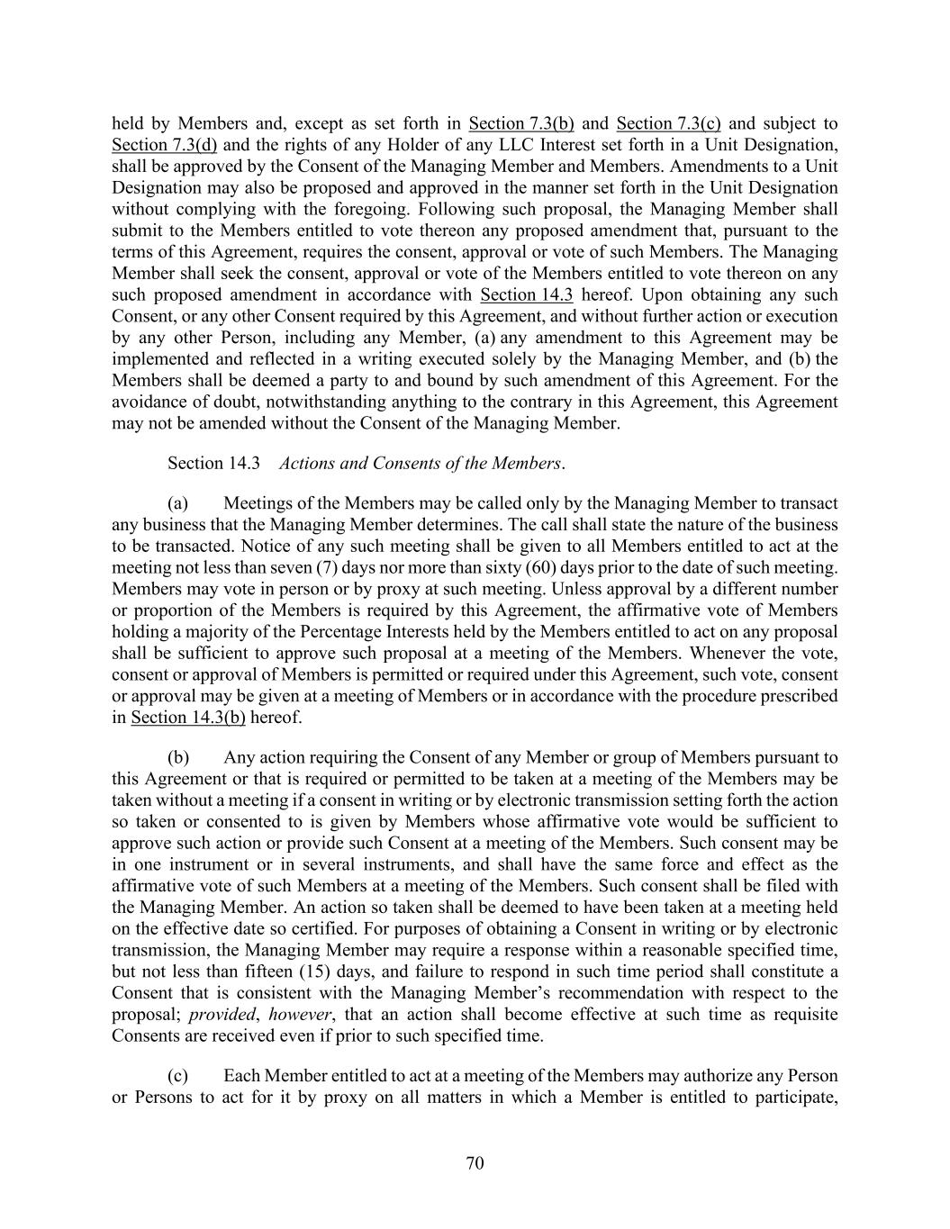 70 held by Members and, except as set forth in Section 7.3(b) and Section 7.3(c) and subject to Section 7.3(d) and the rights of any Holder of any LLC Interest set forth in a Unit Designation, shall be approved by the Consent of the Managing Member and Members. Amendments to a Unit Designation may also be proposed and approved in the manner set forth in the Unit Designation without complying with the foregoing. Following such proposal, the Managing Member shall submit to the Members entitled to vote thereon any proposed amendment that, pursuant to the terms of this Agreement, requires the consent, approval or vote of such Members. The Managing Member shall seek the consent, approval or vote of the Members entitled to vote thereon on any such proposed amendment in accordance with Section 14.3 hereof. Upon obtaining any such Consent, or any other Consent required by this Agreement, and without further action or execution by any other Person, including any Member, (a) any amendment to this Agreement may be implemented and reflected in a writing executed solely by the Managing Member, and (b) the Members shall be deemed a party to and bound by such amendment of this Agreement. For the avoidance of doubt, notwithstanding anything to the contrary in this Agreement, this Agreement may not be amended without the Consent of the Managing Member. Section 14.3 Actions and Consents of the Members. (a) Meetings of the Members may be called only by the Managing Member to transact any business that the Managing Member determines. The call shall state the nature of the business to be transacted. Notice of any such meeting shall be given to all Members entitled to act at the meeting not less than seven (7) days nor more than sixty (60) days prior to the date of such meeting. Members may vote in person or by proxy at such meeting. Unless approval by a different number or proportion of the Members is required by this Agreement, the affirmative vote of Members holding a majority of the Percentage Interests held by the Members entitled to act on any proposal shall be sufficient to approve such proposal at a meeting of the Members. Whenever the vote, consent or approval of Members is permitted or required under this Agreement, such vote, consent or approval may be given at a meeting of Members or in accordance with the procedure prescribed in Section 14.3(b) hereof. (b) Any action requiring the Consent of any Member or group of Members pursuant to this Agreement or that is required or permitted to be taken at a meeting of the Members may be taken without a meeting if a consent in writing or by electronic transmission setting forth the action so taken or consented to is given by Members whose affirmative vote would be sufficient to approve such action or provide such Consent at a meeting of the Members. Such consent may be in one instrument or in several instruments, and shall have the same force and effect as the affirmative vote of such Members at a meeting of the Members. Such consent shall be filed with the Managing Member. An action so taken shall be deemed to have been taken at a meeting held on the effective date so certified. For purposes of obtaining a Consent in writing or by electronic transmission, the Managing Member may require a response within a reasonable specified time, but not less than fifteen (15) days, and failure to respond in such time period shall constitute a Consent that is consistent with the Managing Member’s recommendation with respect to the proposal; provided, however, that an action shall become effective at such time as requisite Consents are received even if prior to such specified time. (c) Each Member entitled to act at a meeting of the Members may authorize any Person or Persons to act for it by proxy on all matters in which a Member is entitled to participate,