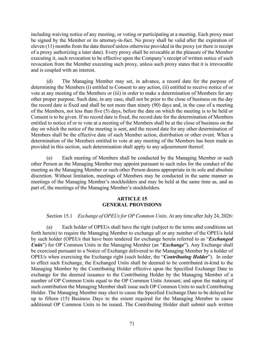71 including waiving notice of any meeting, or voting or participating at a meeting. Each proxy must be signed by the Member or its attorney-in-fact. No proxy shall be valid after the expiration of eleven (11) months from the date thereof unless otherwise provided in the proxy (or there is receipt of a proxy authorizing a later date). Every proxy shall be revocable at the pleasure of the Member executing it, such revocation to be effective upon the Company’s receipt of written notice of such revocation from the Member executing such proxy, unless such proxy states that it is irrevocable and is coupled with an interest. (d) The Managing Member may set, in advance, a record date for the purpose of determining the Members (i) entitled to Consent to any action, (ii) entitled to receive notice of or vote at any meeting of the Members or (iii) in order to make a determination of Members for any other proper purpose. Such date, in any case, shall not be prior to the close of business on the day the record date is fixed and shall be not more than ninety (90) days and, in the case of a meeting of the Members, not less than five (5) days, before the date on which the meeting is to be held or Consent is to be given. If no record date is fixed, the record date for the determination of Members entitled to notice of or to vote at a meeting of the Members shall be at the close of business on the day on which the notice of the meeting is sent, and the record date for any other determination of Members shall be the effective date of such Member action, distribution or other event. When a determination of the Members entitled to vote at any meeting of the Members has been made as provided in this section, such determination shall apply to any adjournment thereof. (e) Each meeting of Members shall be conducted by the Managing Member or such other Person as the Managing Member may appoint pursuant to such rules for the conduct of the meeting as the Managing Member or such other Person deems appropriate in its sole and absolute discretion. Without limitation, meetings of Members may be conducted in the same manner as meetings of the Managing Member’s stockholders and may be held at the same time as, and as part of, the meetings of the Managing Member’s stockholders. ARTICLE 15 GENERAL PROVISIONS Section 15.1 Exchange of OPEUs for OP Common Units. At any time after July 24, 2026: (a) Each holder of OPEUs shall have the right (subject to the terms and conditions set forth herein) to require the Managing Member to exchange all or any number of the OPEUs held by such holder (OPEUs that have been tendered for exchange herein referred to as “Exchanged Units”) for OP Common Units in the Managing Member (an “Exchange”). Any Exchange shall be exercised pursuant to a Notice of Exchange delivered to the Managing Member by a holder of OPEUs when exercising the Exchange right (such holder, the “Contributing Holder”). In order to effect such Exchange, the Exchanged Units shall be deemed to be contributed in-kind to the Managing Member by the Contributing Holder effective upon the Specified Exchange Date in exchange for the deemed issuance to the Contributing Holder by the Managing Member of a number of OP Common Units equal to the OP Common Units Amount; and upon the making of such contribution the Managing Member shall issue such OP Common Units to such Contributing Holder. The Managing Member may elect to cause the Specified Exchange Date to be delayed for up to fifteen (15) Business Days to the extent required for the Managing Member to cause additional OP Common Units to be issued. The Contributing Holder shall submit such written