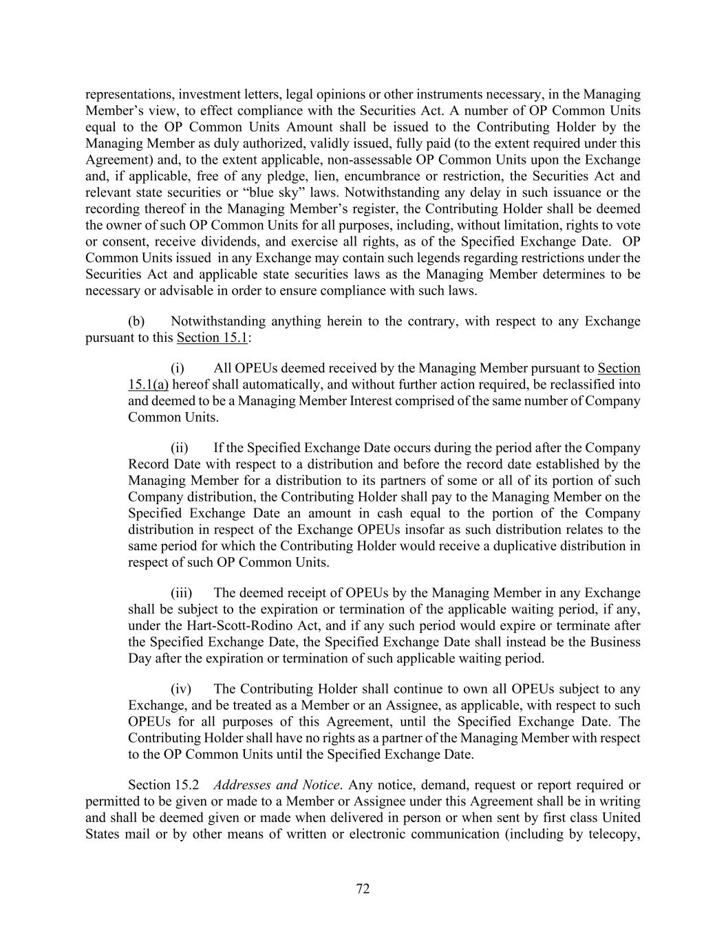 72 representations, investment letters, legal opinions or other instruments necessary, in the Managing Member’s view, to effect compliance with the Securities Act. A number of OP Common Units equal to the OP Common Units Amount shall be issued to the Contributing Holder by the Managing Member as duly authorized, validly issued, fully paid (to the extent required under this Agreement) and, to the extent applicable, non-assessable OP Common Units upon the Exchange and, if applicable, free of any pledge, lien, encumbrance or restriction, the Securities Act and relevant state securities or “blue sky” laws. Notwithstanding any delay in such issuance or the recording thereof in the Managing Member’s register, the Contributing Holder shall be deemed the owner of such OP Common Units for all purposes, including, without limitation, rights to vote or consent, receive dividends, and exercise all rights, as of the Specified Exchange Date. OP Common Units issued in any Exchange may contain such legends regarding restrictions under the Securities Act and applicable state securities laws as the Managing Member determines to be necessary or advisable in order to ensure compliance with such laws. (b) Notwithstanding anything herein to the contrary, with respect to any Exchange pursuant to this Section 15.1: (i) All OPEUs deemed received by the Managing Member pursuant to Section 15.1(a) hereof shall automatically, and without further action required, be reclassified into and deemed to be a Managing Member Interest comprised of the same number of Company Common Units. (ii) If the Specified Exchange Date occurs during the period after the Company Record Date with respect to a distribution and before the record date established by the Managing Member for a distribution to its partners of some or all of its portion of such Company distribution, the Contributing Holder shall pay to the Managing Member on the Specified Exchange Date an amount in cash equal to the portion of the Company distribution in respect of the Exchange OPEUs insofar as such distribution relates to the same period for which the Contributing Holder would receive a duplicative distribution in respect of such OP Common Units. (iii) The deemed receipt of OPEUs by the Managing Member in any Exchange shall be subject to the expiration or termination of the applicable waiting period, if any, under the Hart-Scott-Rodino Act, and if any such period would expire or terminate after the Specified Exchange Date, the Specified Exchange Date shall instead be the Business Day after the expiration or termination of such applicable waiting period. (iv) The Contributing Holder shall continue to own all OPEUs subject to any Exchange, and be treated as a Member or an Assignee, as applicable, with respect to such OPEUs for all purposes of this Agreement, until the Specified Exchange Date. The Contributing Holder shall have no rights as a partner of the Managing Member with respect to the OP Common Units until the Specified Exchange Date. Section 15.2 Addresses and Notice. Any notice, demand, request or report required or permitted to be given or made to a Member or Assignee under this Agreement shall be in writing and shall be deemed given or made when delivered in person or when sent by first class United States mail or by other means of written or electronic communication (including by telecopy,