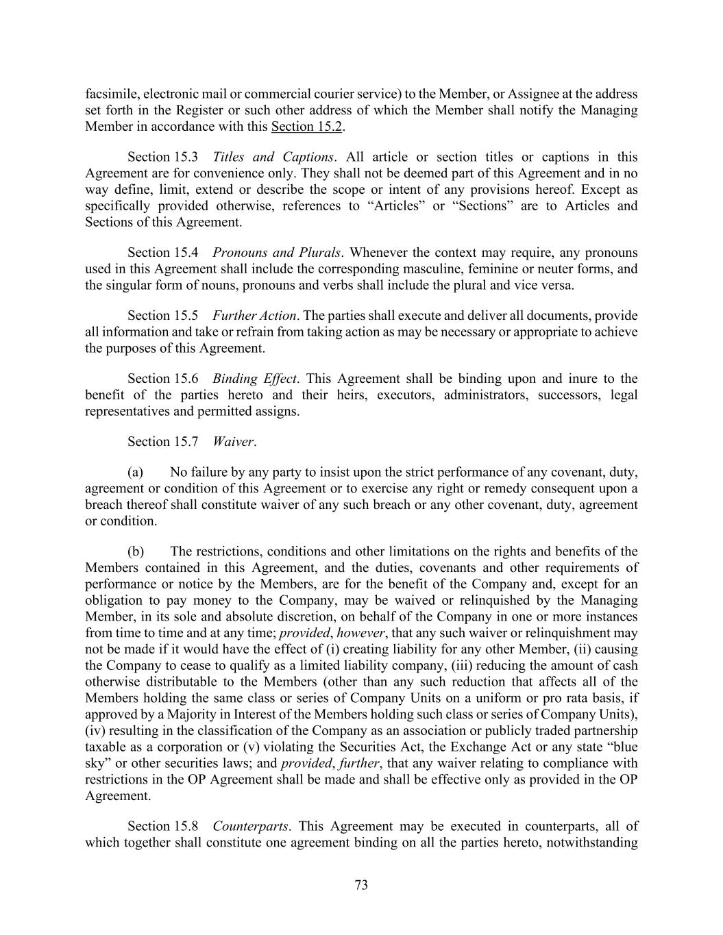 73 facsimile, electronic mail or commercial courier service) to the Member, or Assignee at the address set forth in the Register or such other address of which the Member shall notify the Managing Member in accordance with this Section 15.2. Section 15.3 Titles and Captions. All article or section titles or captions in this Agreement are for convenience only. They shall not be deemed part of this Agreement and in no way define, limit, extend or describe the scope or intent of any provisions hereof. Except as specifically provided otherwise, references to “Articles” or “Sections” are to Articles and Sections of this Agreement. Section 15.4 Pronouns and Plurals. Whenever the context may require, any pronouns used in this Agreement shall include the corresponding masculine, feminine or neuter forms, and the singular form of nouns, pronouns and verbs shall include the plural and vice versa. Section 15.5 Further Action. The parties shall execute and deliver all documents, provide all information and take or refrain from taking action as may be necessary or appropriate to achieve the purposes of this Agreement. Section 15.6 Binding Effect. This Agreement shall be binding upon and inure to the benefit of the parties hereto and their heirs, executors, administrators, successors, legal representatives and permitted assigns. Section 15.7 Waiver. (a) No failure by any party to insist upon the strict performance of any covenant, duty, agreement or condition of this Agreement or to exercise any right or remedy consequent upon a breach thereof shall constitute waiver of any such breach or any other covenant, duty, agreement or condition. (b) The restrictions, conditions and other limitations on the rights and benefits of the Members contained in this Agreement, and the duties, covenants and other requirements of performance or notice by the Members, are for the benefit of the Company and, except for an obligation to pay money to the Company, may be waived or relinquished by the Managing Member, in its sole and absolute discretion, on behalf of the Company in one or more instances from time to time and at any time; provided, however, that any such waiver or relinquishment may not be made if it would have the effect of (i) creating liability for any other Member, (ii) causing the Company to cease to qualify as a limited liability company, (iii) reducing the amount of cash otherwise distributable to the Members (other than any such reduction that affects all of the Members holding the same class or series of Company Units on a uniform or pro rata basis, if approved by a Majority in Interest of the Members holding such class or series of Company Units), (iv) resulting in the classification of the Company as an association or publicly traded partnership taxable as a corporation or (v) violating the Securities Act, the Exchange Act or any state “blue sky” or other securities laws; and provided, further, that any waiver relating to compliance with restrictions in the OP Agreement shall be made and shall be effective only as provided in the OP Agreement. Section 15.8 Counterparts. This Agreement may be executed in counterparts, all of which together shall constitute one agreement binding on all the parties hereto, notwithstanding