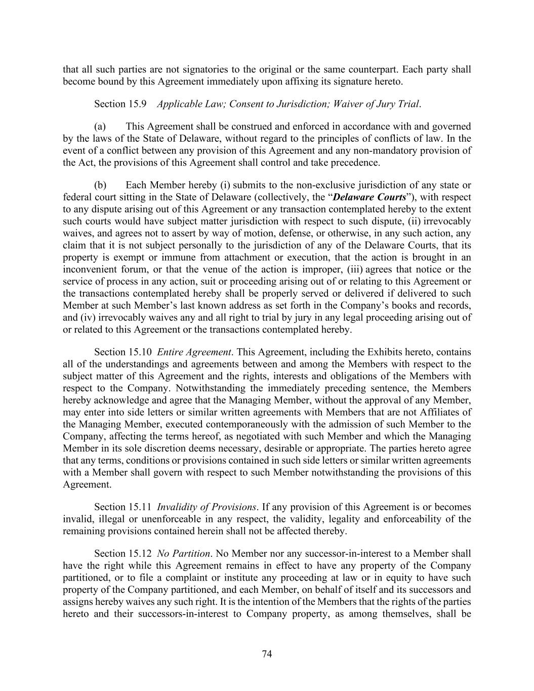 74 that all such parties are not signatories to the original or the same counterpart. Each party shall become bound by this Agreement immediately upon affixing its signature hereto. Section 15.9 Applicable Law; Consent to Jurisdiction; Waiver of Jury Trial. (a) This Agreement shall be construed and enforced in accordance with and governed by the laws of the State of Delaware, without regard to the principles of conflicts of law. In the event of a conflict between any provision of this Agreement and any non-mandatory provision of the Act, the provisions of this Agreement shall control and take precedence. (b) Each Member hereby (i) submits to the non-exclusive jurisdiction of any state or federal court sitting in the State of Delaware (collectively, the “Delaware Courts”), with respect to any dispute arising out of this Agreement or any transaction contemplated hereby to the extent such courts would have subject matter jurisdiction with respect to such dispute, (ii) irrevocably waives, and agrees not to assert by way of motion, defense, or otherwise, in any such action, any claim that it is not subject personally to the jurisdiction of any of the Delaware Courts, that its property is exempt or immune from attachment or execution, that the action is brought in an inconvenient forum, or that the venue of the action is improper, (iii) agrees that notice or the service of process in any action, suit or proceeding arising out of or relating to this Agreement or the transactions contemplated hereby shall be properly served or delivered if delivered to such Member at such Member’s last known address as set forth in the Company’s books and records, and (iv) irrevocably waives any and all right to trial by jury in any legal proceeding arising out of or related to this Agreement or the transactions contemplated hereby. Section 15.10 Entire Agreement. This Agreement, including the Exhibits hereto, contains all of the understandings and agreements between and among the Members with respect to the subject matter of this Agreement and the rights, interests and obligations of the Members with respect to the Company. Notwithstanding the immediately preceding sentence, the Members hereby acknowledge and agree that the Managing Member, without the approval of any Member, may enter into side letters or similar written agreements with Members that are not Affiliates of the Managing Member, executed contemporaneously with the admission of such Member to the Company, affecting the terms hereof, as negotiated with such Member and which the Managing Member in its sole discretion deems necessary, desirable or appropriate. The parties hereto agree that any terms, conditions or provisions contained in such side letters or similar written agreements with a Member shall govern with respect to such Member notwithstanding the provisions of this Agreement. Section 15.11 Invalidity of Provisions. If any provision of this Agreement is or becomes invalid, illegal or unenforceable in any respect, the validity, legality and enforceability of the remaining provisions contained herein shall not be affected thereby. Section 15.12 No Partition. No Member nor any successor-in-interest to a Member shall have the right while this Agreement remains in effect to have any property of the Company partitioned, or to file a complaint or institute any proceeding at law or in equity to have such property of the Company partitioned, and each Member, on behalf of itself and its successors and assigns hereby waives any such right. It is the intention of the Members that the rights of the parties hereto and their successors-in-interest to Company property, as among themselves, shall be