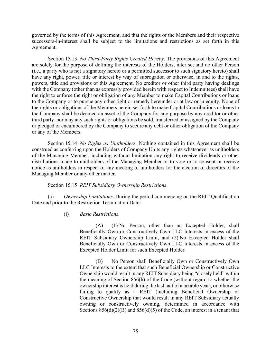 75 governed by the terms of this Agreement, and that the rights of the Members and their respective successors-in-interest shall be subject to the limitations and restrictions as set forth in this Agreement. Section 15.13 No Third-Party Rights Created Hereby. The provisions of this Agreement are solely for the purpose of defining the interests of the Holders, inter se; and no other Person (i.e., a party who is not a signatory hereto or a permitted successor to such signatory hereto) shall have any right, power, title or interest by way of subrogation or otherwise, in and to the rights, powers, title and provisions of this Agreement. No creditor or other third party having dealings with the Company (other than as expressly provided herein with respect to Indemnitees) shall have the right to enforce the right or obligation of any Member to make Capital Contributions or loans to the Company or to pursue any other right or remedy hereunder or at law or in equity. None of the rights or obligations of the Members herein set forth to make Capital Contributions or loans to the Company shall be deemed an asset of the Company for any purpose by any creditor or other third party, nor may any such rights or obligations be sold, transferred or assigned by the Company or pledged or encumbered by the Company to secure any debt or other obligation of the Company or any of the Members. Section 15.14 No Rights as Unitholders. Nothing contained in this Agreement shall be construed as conferring upon the Holders of Company Units any rights whatsoever as unitholders of the Managing Member, including without limitation any right to receive dividends or other distributions made to unitholders of the Managing Member or to vote or to consent or receive notice as unitholders in respect of any meeting of unitholders for the election of directors of the Managing Member or any other matter. Section 15.15 REIT Subsidiary Ownership Restrictions. (a) Ownership Limitations. During the period commencing on the REIT Qualification Date and prior to the Restriction Termination Date: (i) Basic Restrictions. (A) (1) No Person, other than an Excepted Holder, shall Beneficially Own or Constructively Own LLC Interests in excess of the REIT Subsidiary Ownership Limit, and (2) No Excepted Holder shall Beneficially Own or Constructively Own LLC Interests in excess of the Excepted Holder Limit for such Excepted Holder. (B) No Person shall Beneficially Own or Constructively Own LLC Interests to the extent that such Beneficial Ownership or Constructive Ownership would result in any REIT Subsidiary being “closely held” within the meaning of Section 856(h) of the Code (without regard to whether the ownership interest is held during the last half of a taxable year), or otherwise failing to qualify as a REIT (including Beneficial Ownership or Constructive Ownership that would result in any REIT Subsidiary actually owning or constructively owning, determined in accordance with Sections 856(d)(2)(B) and 856(d)(5) of the Code, an interest in a tenant that