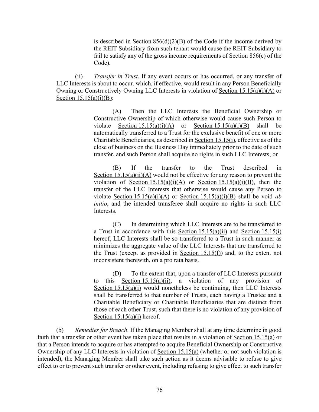 76 is described in Section 856(d)(2)(B) of the Code if the income derived by the REIT Subsidiary from such tenant would cause the REIT Subsidiary to fail to satisfy any of the gross income requirements of Section 856(c) of the Code). (ii) Transfer in Trust. If any event occurs or has occurred, or any transfer of LLC Interests is about to occur, which, if effective, would result in any Person Beneficially Owning or Constructively Owning LLC Interests in violation of Section 15.15(a)(i)(A) or Section 15.15(a)(i)(B): (A) Then the LLC Interests the Beneficial Ownership or Constructive Ownership of which otherwise would cause such Person to violate Section 15.15(a)(i)(A) or Section 15.15(a)(i)(B) shall be automatically transferred to a Trust for the exclusive benefit of one or more Charitable Beneficiaries, as described in Section 15.15(i), effective as of the close of business on the Business Day immediately prior to the date of such transfer, and such Person shall acquire no rights in such LLC Interests; or (B) If the transfer to the Trust described in Section 15.15(a)(ii)(A) would not be effective for any reason to prevent the violation of Section 15.15(a)(i)(A) or Section 15.15(a)(i)(B), then the transfer of the LLC Interests that otherwise would cause any Person to violate Section 15.15(a)(i)(A) or Section 15.15(a)(i)(B) shall be void ab initio, and the intended transferee shall acquire no rights in such LLC Interests. (C) In determining which LLC Interests are to be transferred to a Trust in accordance with this Section 15.15(a)(ii) and Section 15.15(i) hereof, LLC Interests shall be so transferred to a Trust in such manner as minimizes the aggregate value of the LLC Interests that are transferred to the Trust (except as provided in Section 15.15(f)) and, to the extent not inconsistent therewith, on a pro rata basis. (D) To the extent that, upon a transfer of LLC Interests pursuant to this Section 15.15(a)(ii), a violation of any provision of Section 15.15(a)(i) would nonetheless be continuing, then LLC Interests shall be transferred to that number of Trusts, each having a Trustee and a Charitable Beneficiary or Charitable Beneficiaries that are distinct from those of each other Trust, such that there is no violation of any provision of Section 15.15(a)(i) hereof. (b) Remedies for Breach. If the Managing Member shall at any time determine in good faith that a transfer or other event has taken place that results in a violation of Section 15.15(a) or that a Person intends to acquire or has attempted to acquire Beneficial Ownership or Constructive Ownership of any LLC Interests in violation of Section 15.15(a) (whether or not such violation is intended), the Managing Member shall take such action as it deems advisable to refuse to give effect to or to prevent such transfer or other event, including refusing to give effect to such transfer